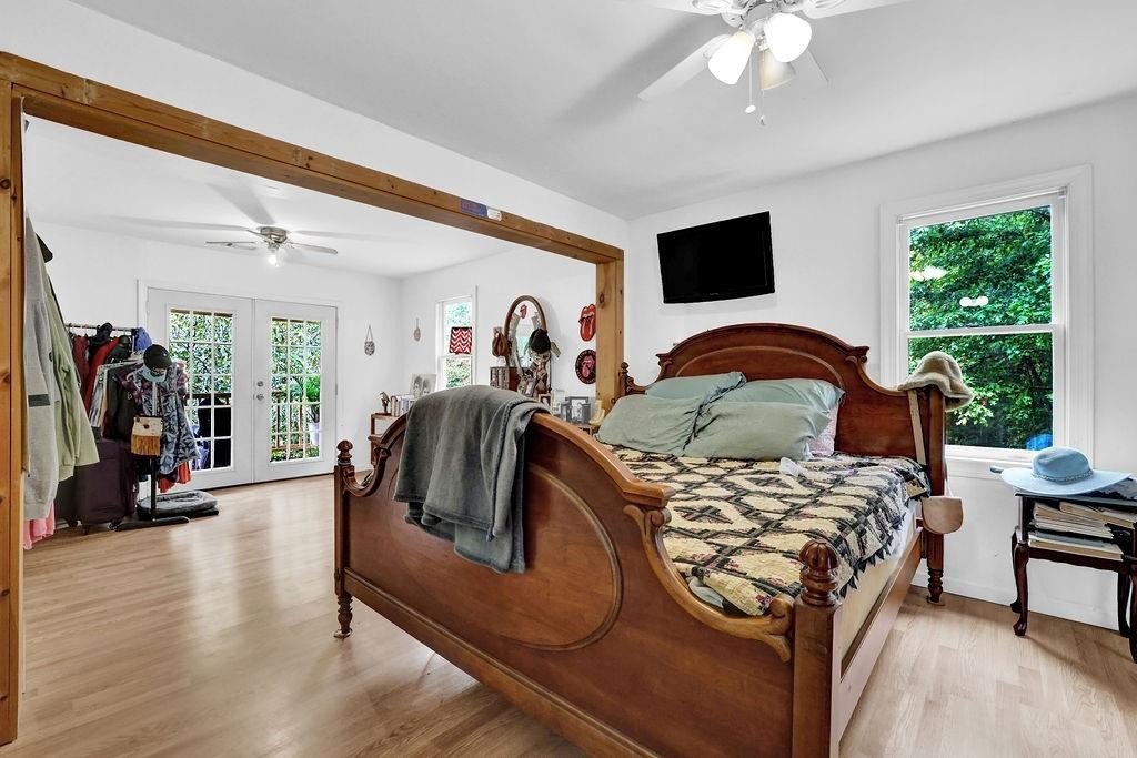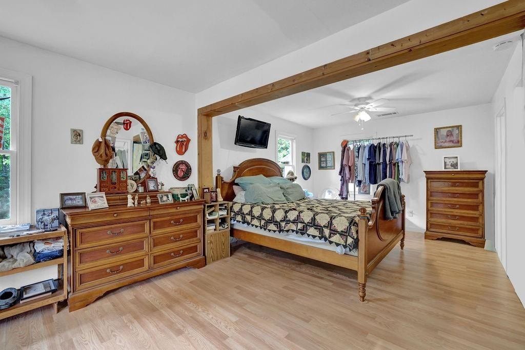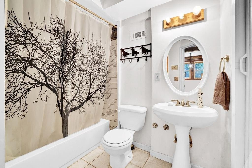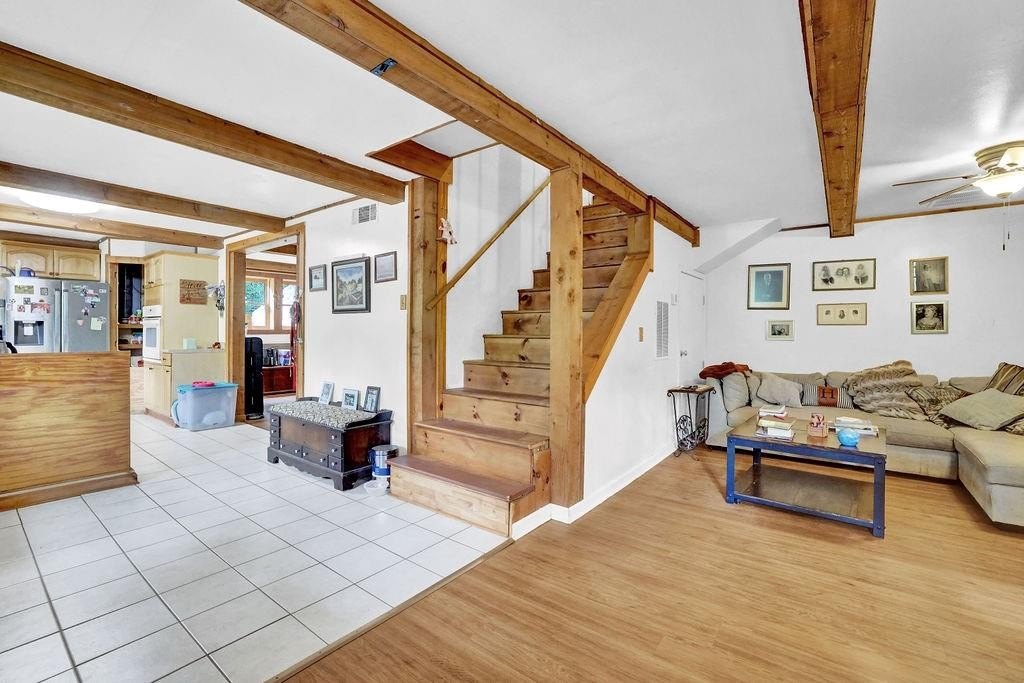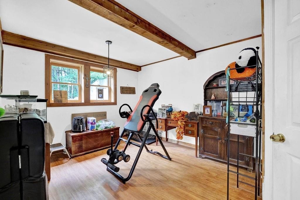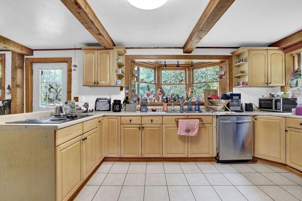 Inside, you’ll find stunning exposed wood beams on the main level, updated bathrooms with modernized showers & tubs, plus a kitchen featuring a stainless steel refrigerator and dishwasher. Two covered porches provide the perfect spots to relax and take in the peaceful surroundings.