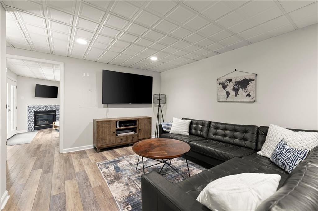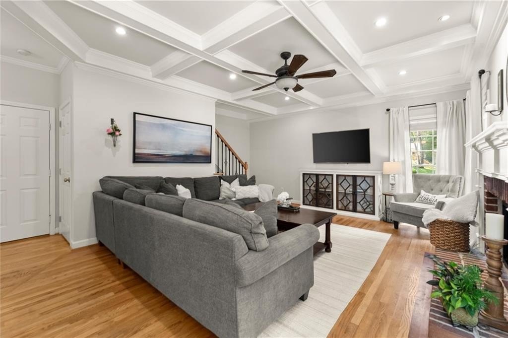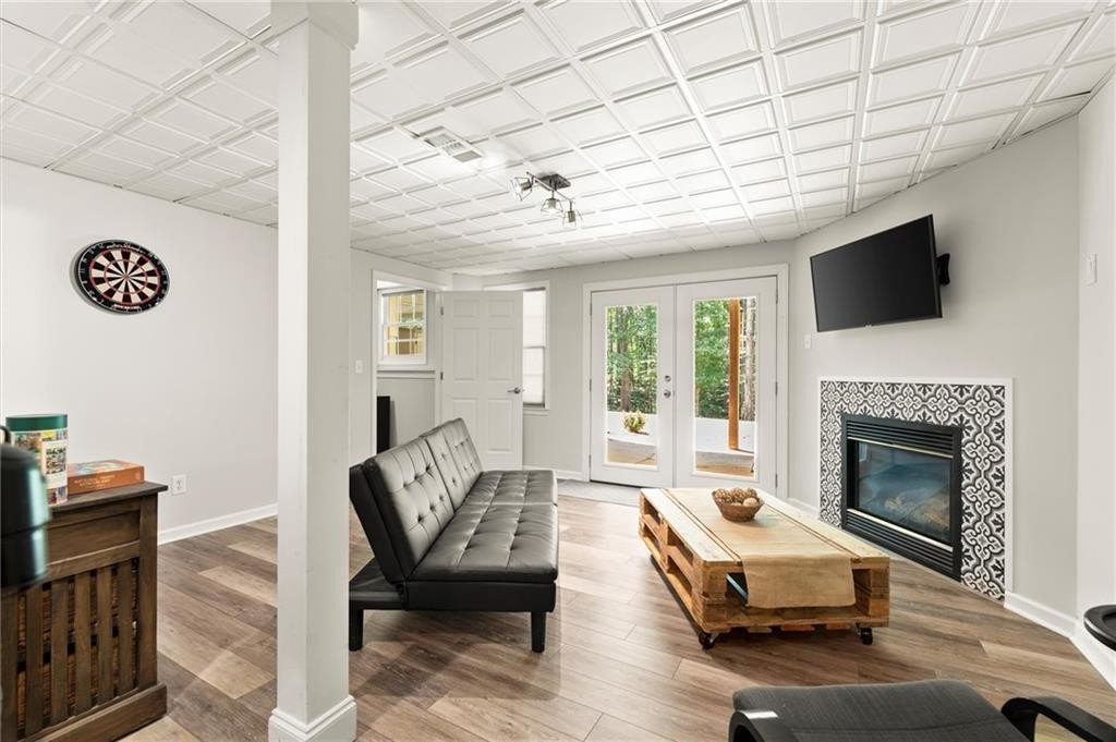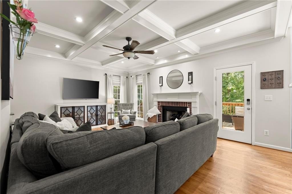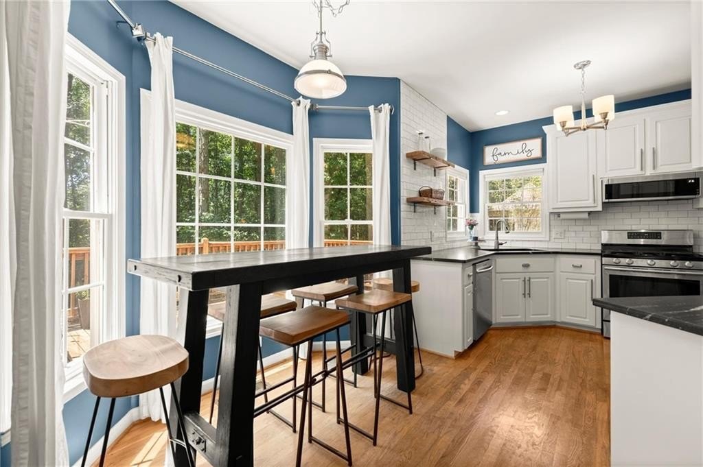 Welcome to this picture-perfect home nestled on a premium cul-de-sac lot in the desirable Orange Shoals Greenbelt community. From the moment you arrive, the inviting front porch and spacious front yard set the tone for lots of charm and character! Step inside to a light-filled foyer flanked by a separate dining room, leading into a beautifully updated kitchen with stone countertops, designer backsplash, and newer appliances. The kitchen opens to an expansive deck that overlooks a serene, wooded backyard—your private retreat with direct access to miles of community trails. The fireside family room with coffered ceilings and gleaming hardwoods offers a cozy yet refined space to unwind. Upstairs, the charm continues with a spacious Primary Suite and spa-inspired bath, three secondary bedrooms, a computer nook, and thoughtful touches like built-ins and designer lighting. The fully finished terrace level adds versatility with a full bath, two separate flex rooms including one with a ventless fireplace and 5th bedroom space(currently used as a home office). Enjoy fall evenings on the well appointed deck, by the firepit, or unwind under the covered patio. Located less than 5 miles from top-rated schools (K-12), shopping, dining, Northside Cherokee, quaint downtown areas like Ball Ground and Canton, the Cumming City Center, as well as a hop and a skip from Milton|Alpharetta areas. This home offers peace, privacy, and access to a vibrant, nature-loving community.