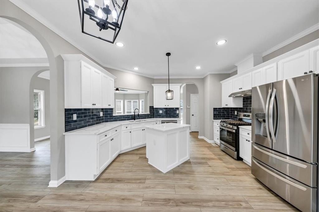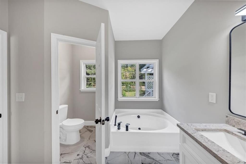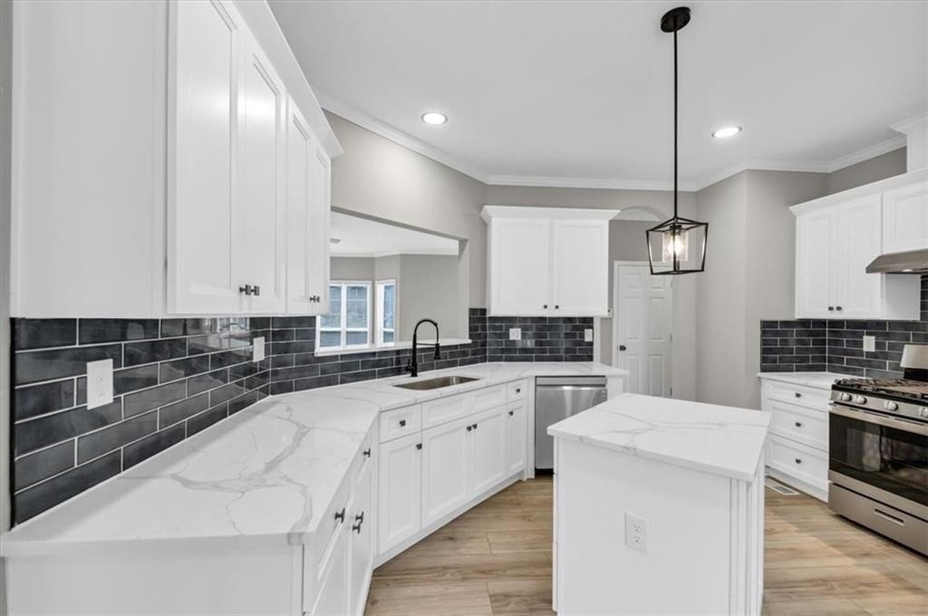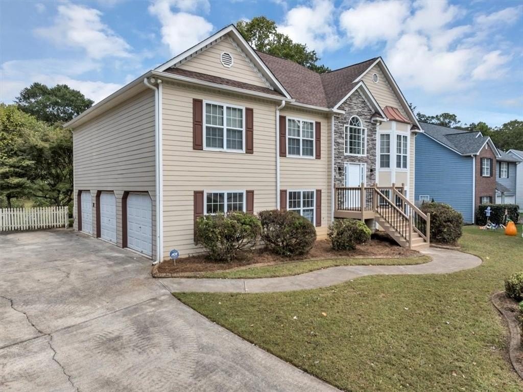 Amazing renovation located just 2.5 miles from the heart of Downtown Woodstock! From the moment you walk through the front door, you’ll be amazed by the space, natural light, and modern upgrades this home has to offer. The main level features new LVP flooring throughout (with new carpet in the bedrooms), an open and spacious family room with a stone fireplace, and a separate dining room with judges paneling. The kitchen is absolutely stunning—complete with all-new white shaker cabinets (including an island), quartz countertops, a gorgeous glass tile backsplash, stainless steel appliances, a pantry, and a bright breakfast area. The main-level guest bath has also been beautifully updated with new cabinetry, a quartz countertop, new toilet, and striking black tile flooring. All bedrooms are generous in size, especially the primary suite located at the back of the home, which boasts a tray ceiling and an incredible spa-like bath featuring modern tile flooring, a double vanity with quartz top and center tower for extra storage, a beautiful walk-in tile shower, garden tub, private water closet, new toilet, and a spacious walk-in closet. The lower level is equally impressive with an oversized second family or entertainment room, a fourth large bedroom with walk-in closet, and a third fully renovated bath showcasing new cabinetry, quartz countertop, designer tile floor, new toilet, and a Jacuzzi tub/shower combo. The laundry room is also conveniently located on this level. Additional highlights include a rare three-car garage (nearly unheard of in this price range!) and a large, level, and mostly private fenced-in backyard—perfect for outdoor entertaining. Other updates include fresh paint throughout, all new light fixtures, new door hardware, and brand-new flooring across the entire home.