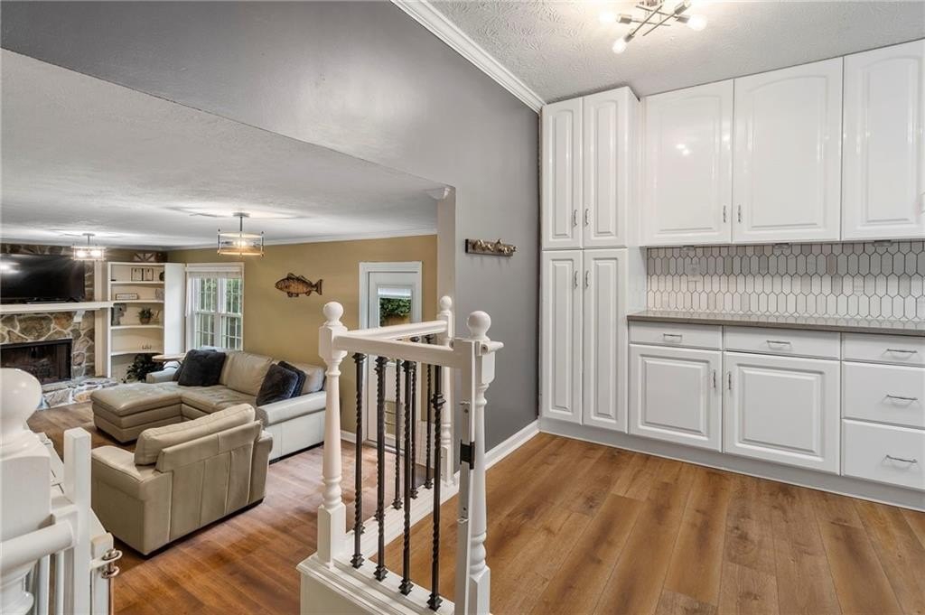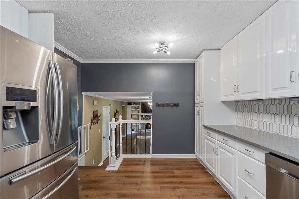Step into the fully renovated kitchen featuring new white cabinetry, quartz