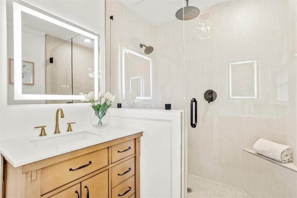 The main level offers two bright living spaces, a dining room, a stylish half bath with custom cabinetry, and a laundry room with folding surface and basket storage. Upstairs, an incredible primary suite with double vanities, water closet, and a large walk-in shower with dual shower heads and a corner bench. Three other oversized bedrooms and a bbeautiful additional bathroom.