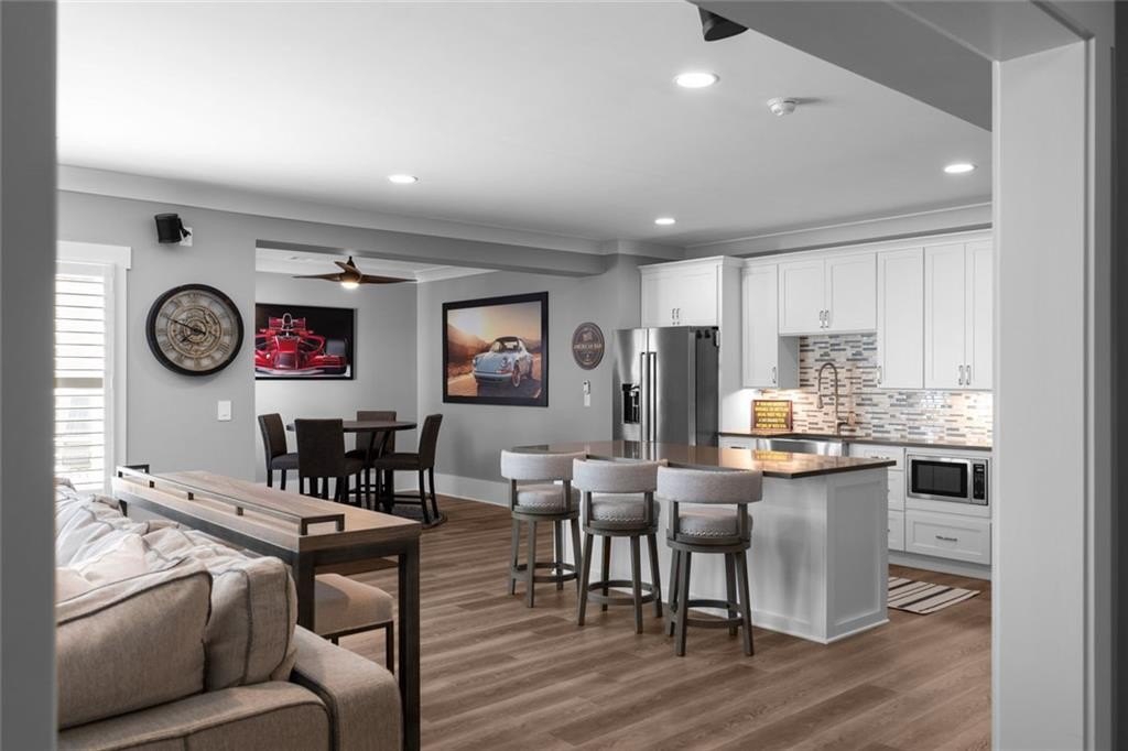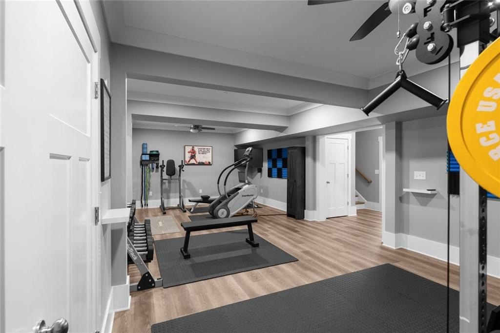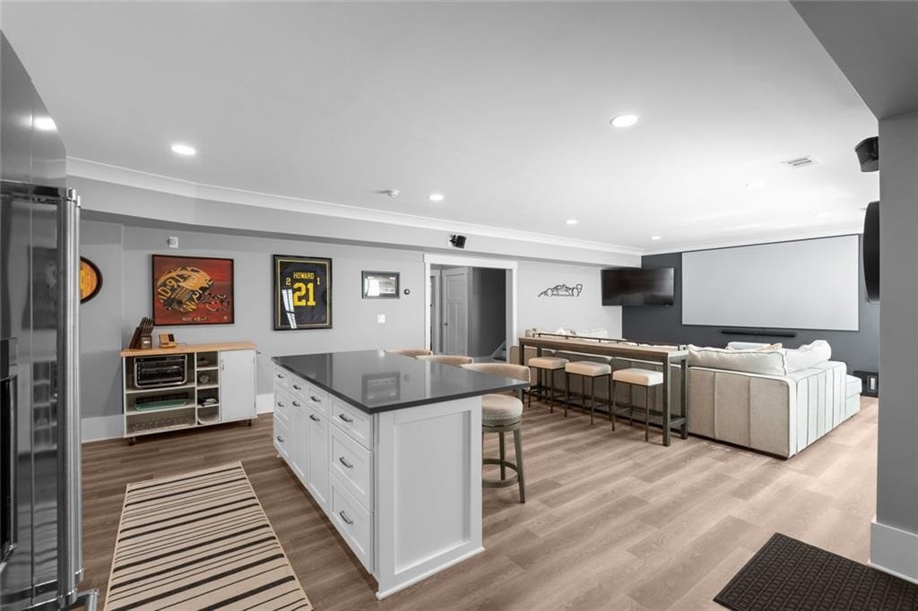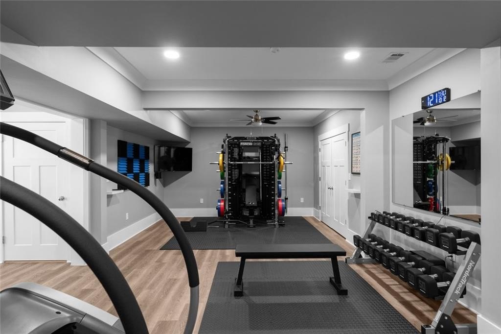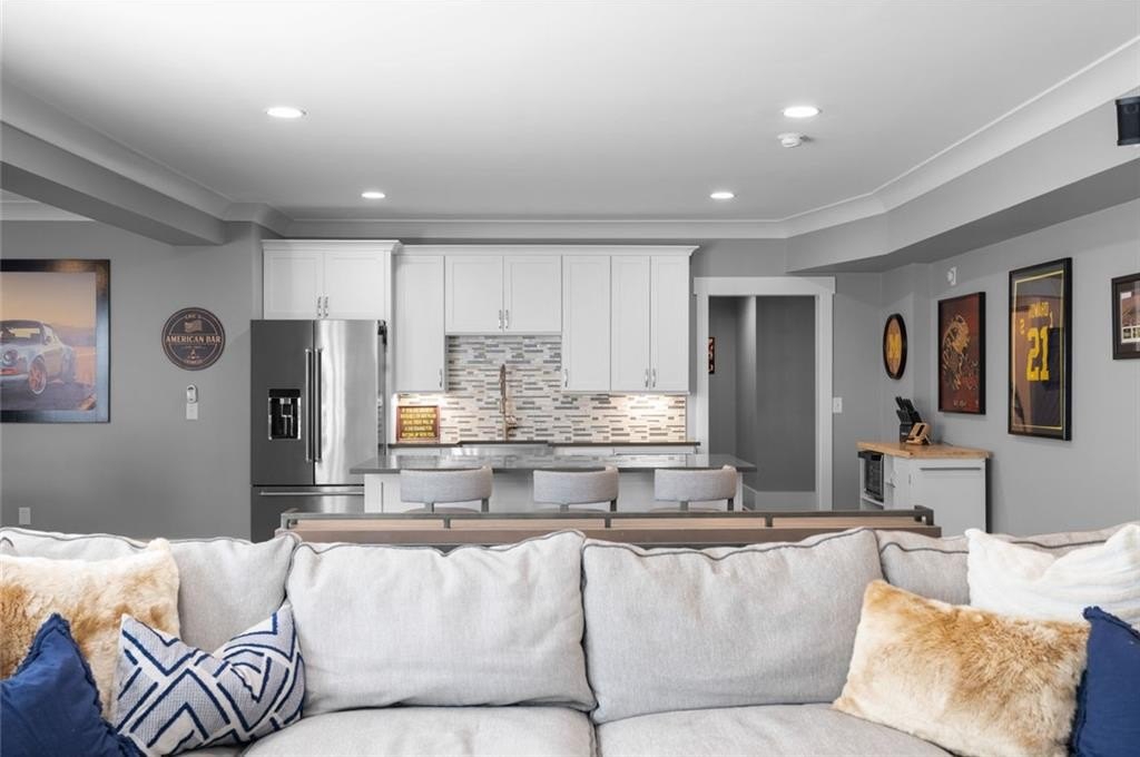 The finished basement offers an impressive extension of living space — featuring a custom bar, fitness room, recreation area, and additional bedroom and full bath.