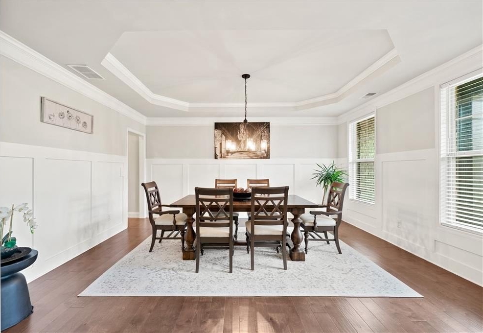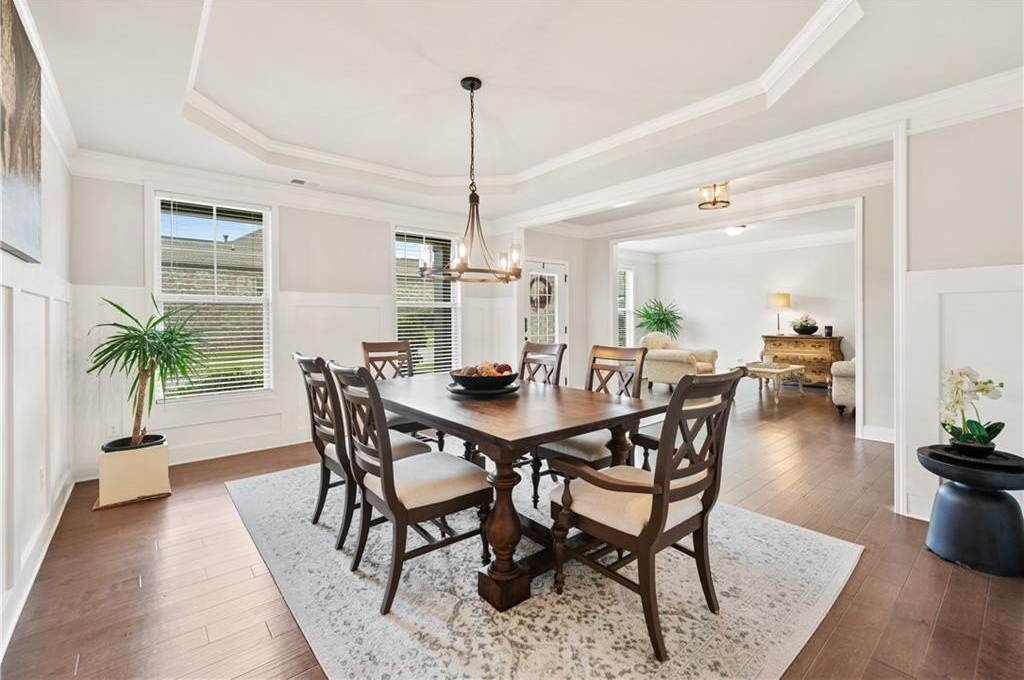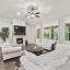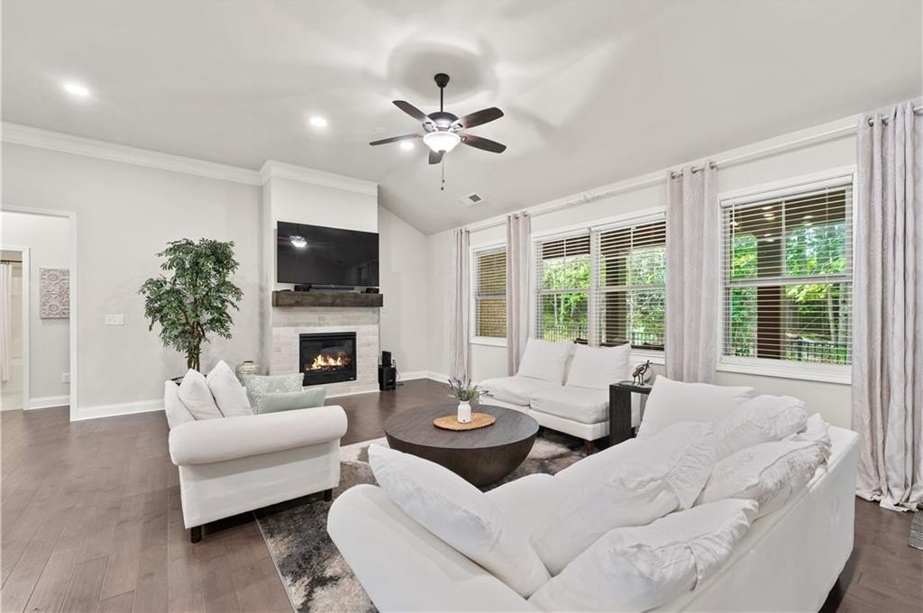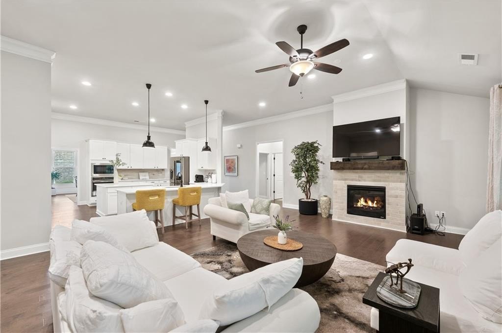 As you enter, you’ll be greeted by a wide foyer flanked by spacious formal living and dining rooms. Though built only six years ago, this home feels almost brand new. The open-concept main living area features 11-foot ceilings, hardwood flooring throughout the entire main level, including the master bedroom, and a cozy fireplace with a floating mantle and tile surround.