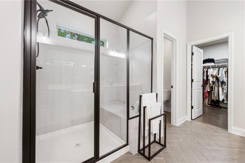 The split-bedroom layout offers two secondary bedrooms with a full bath between them—one featuring a versatile queen-size Murphy bed. The spacious master suite includes a double vanity, a beautifully tiled shower with a bench, and a large walk-in closet.
