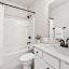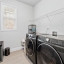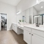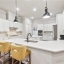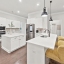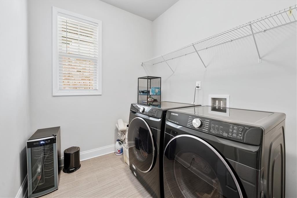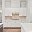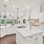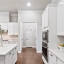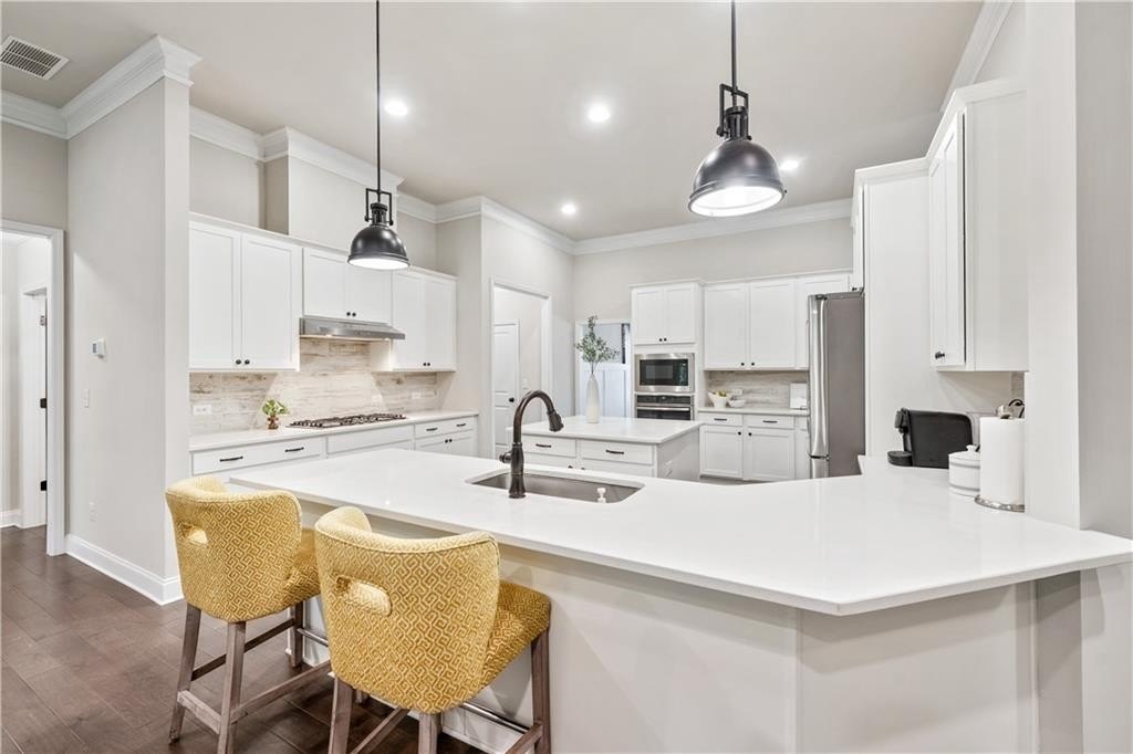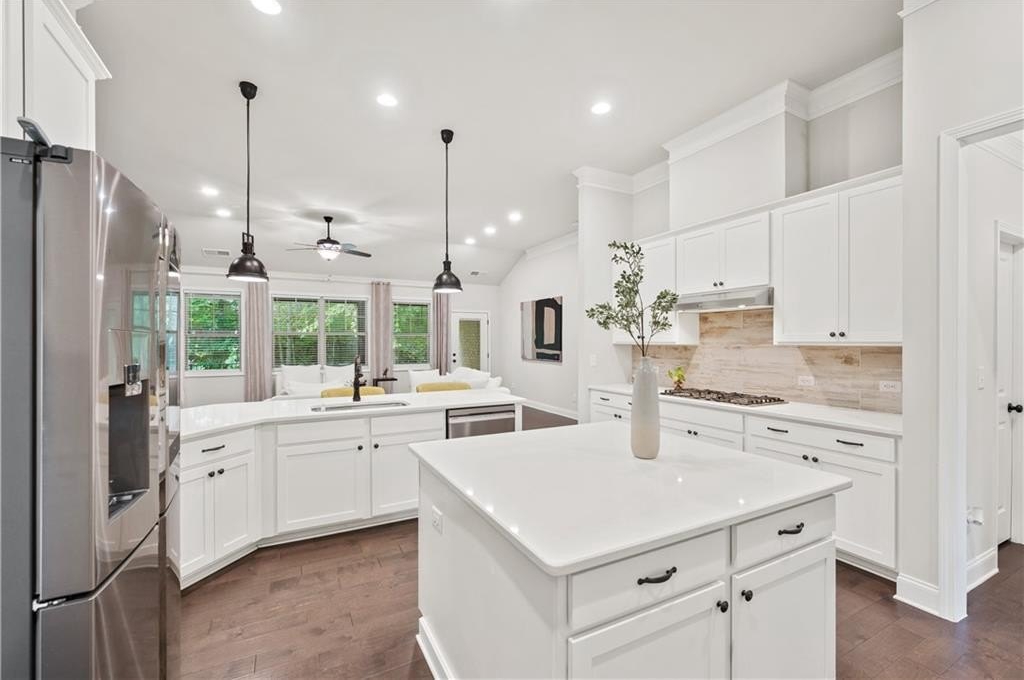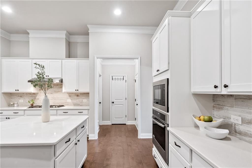 The chef’s kitchen is a true showpiece with 42" white cabinets, white quartz countertops, stainless steel appliances, and a modern weathered wood-look tile backsplash that adds warmth and character. The split cooking design includes a wall-mounted oven and microwave with a separate gas cooktop and vent hood vented to the outside.