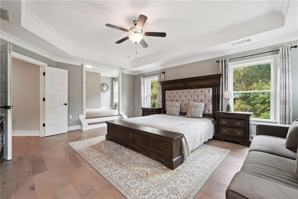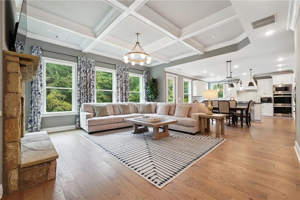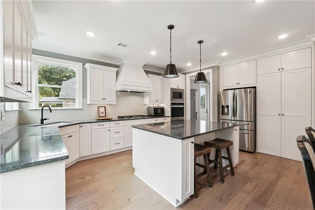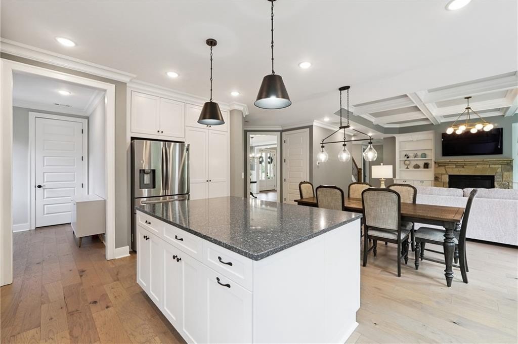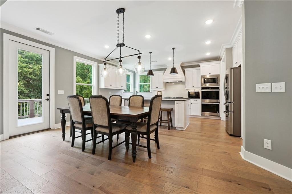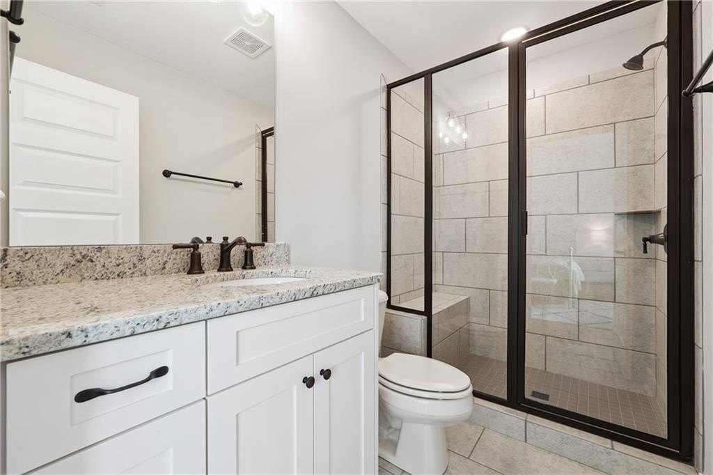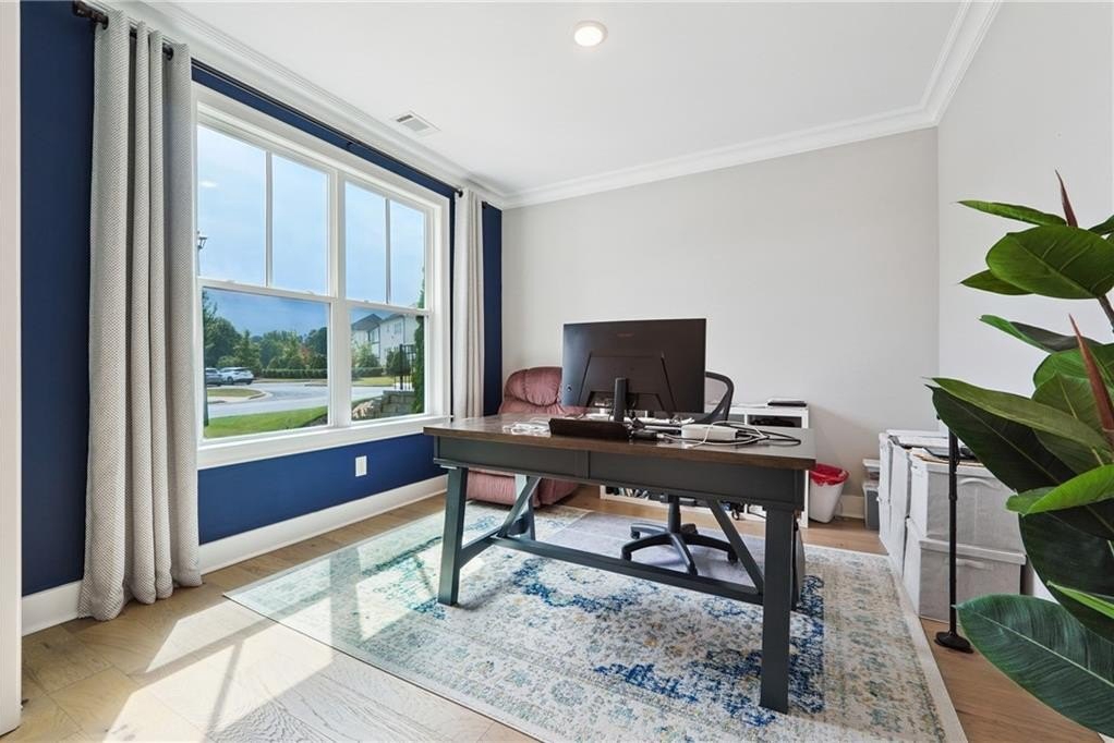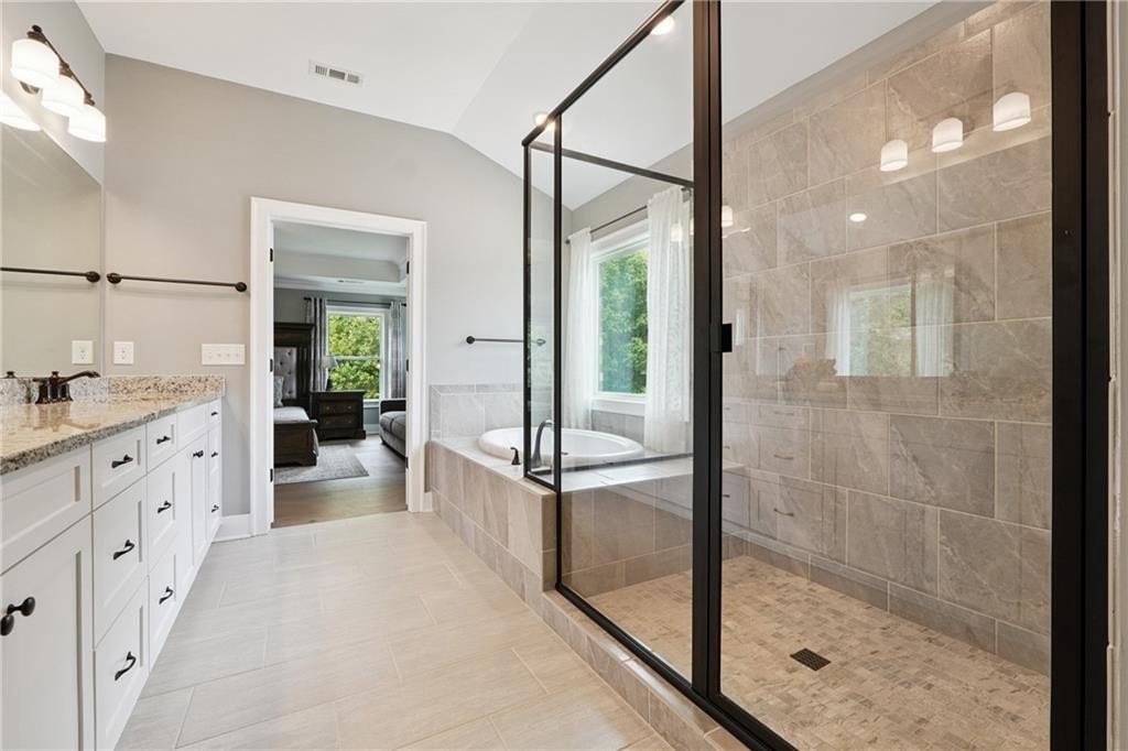 Breathtaking custom craftsman estate with 3 fully finished levels in sought after Montebello community. Walk across the street to the Olympic pool, tennis/pickle ball courts and clubhouse. Grand 2-story entry with custom double door entry with gleaming hardwood floors. Chef’s kitchen boasts granite countertops, crisp white cabinetry, an oversized island, and a hidden walk-in pantry, seamlessly flowing into the breakfast nook. Great Room impresses with coffered ceilings, custom built-ins, and a natural stone fireplace. A main-level guest suite with a full bath provides comfort and privacy for visitoMain level also offers a formal dining room and a private office. Upstairs, the owner’s suite is a true retreat, complete with a serene sitting area, spa-inspired bath, and a generous walk-in closet. Three additional bedrooms, two full baths, a media room, and a spacious laundry room complete the upper level. fully finished terrace level expands your lifestyle options—perfect for a home gym, game room, media lounge, or in-law suite—with walk-out access to a peaceful backyard. Additional highlights include a 2-car garage equipped with a Tesla EV charger, combining convenience and sustainability. Schedule your showing today!
