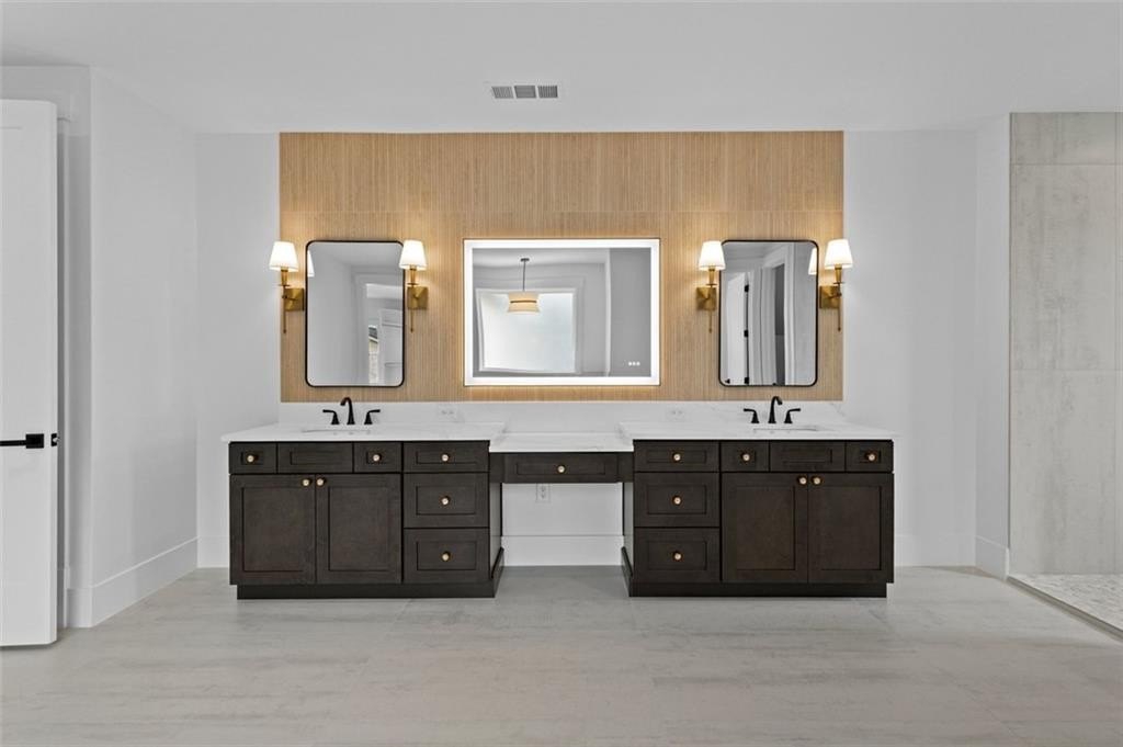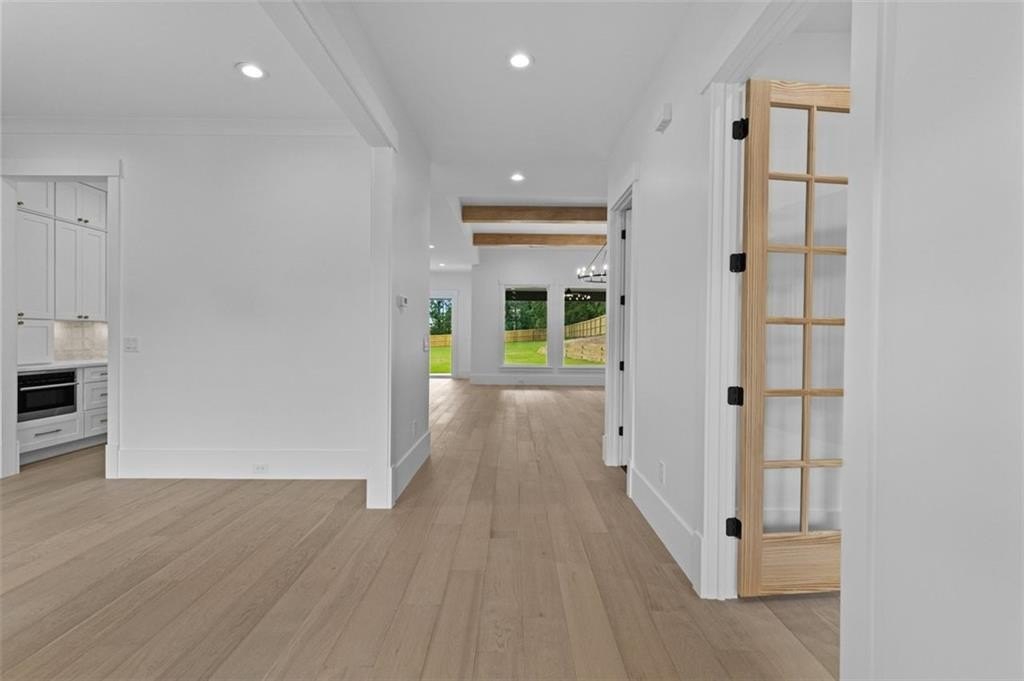 Inside, an open-concept layout filled with natural light showcases elegant custom finishes throughout. The main level features a private office, a stunning in-law or mini-master suite with a spa-style bath, walk-in closet with stackable laundry, and direct access to the backyard perfect for future pool plans. The chef’s kitchen is designed to impress with quartz countertops, an oversized island, premium stainless steel appliances, a custom tile backsplash, and a hidden butler’s prep kitchen tucked inside the walk-in pantry. The spacious living room offers large bay windows, beautiful wood-beam ceilings, and a custom fireplace wall that creates an inviting atmosphere. Upstairs, the expansive owner’s suite is a private retreat complete with dual vanities, a custom tiled shower, built-in sauna, and an oversized walk-in closet with custom shelving and a center island. A bonus room inside the suite is ideal for a nursery, reading nook, or gym, while a separate media room provides the perfect spot for movie nights or game-day gatherings. Three additional bedrooms offer plenty of space for family, guests, or flexible use. Additional features include wide plank hardwood floors, designer tile work, a tankless gas water heater, and an oversized three-car garage with room for storage or a workshop. The backyard is perfect for entertaining with a built-in gas grill, sink, and gas fire pit ideal for relaxing under the stars.