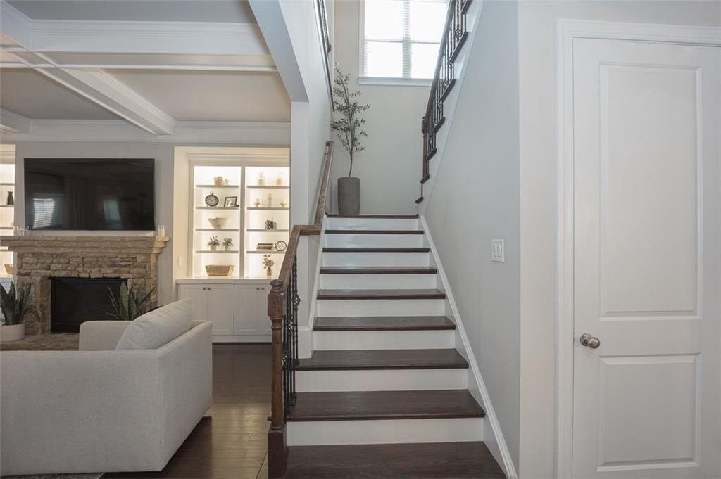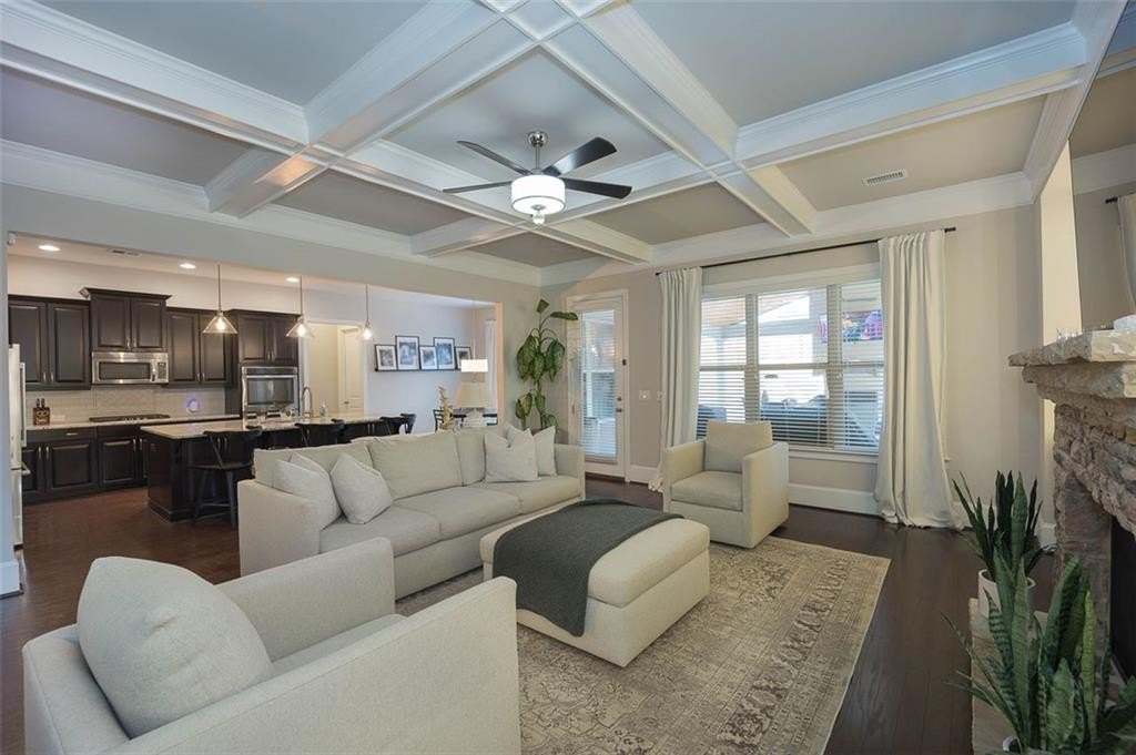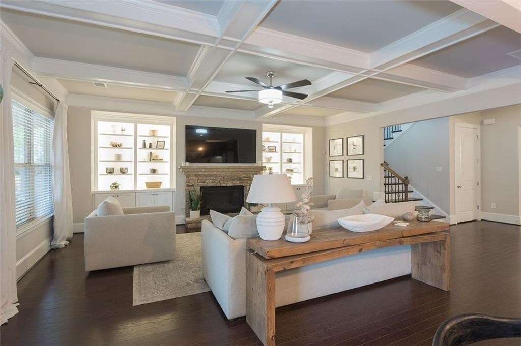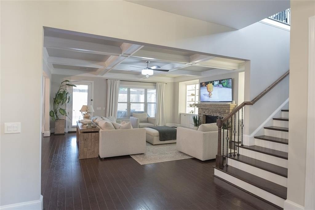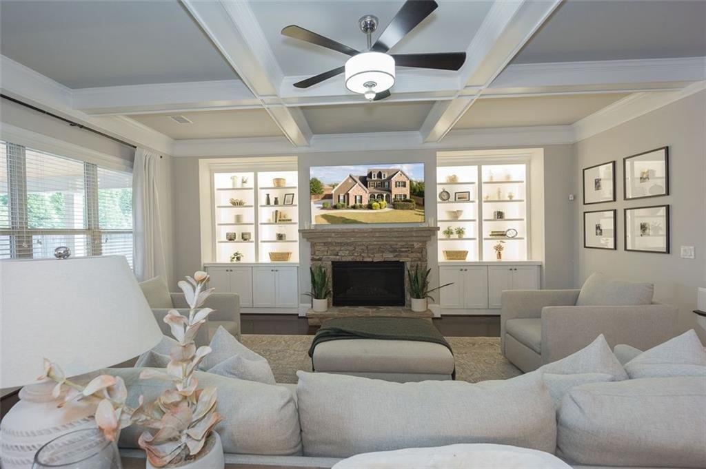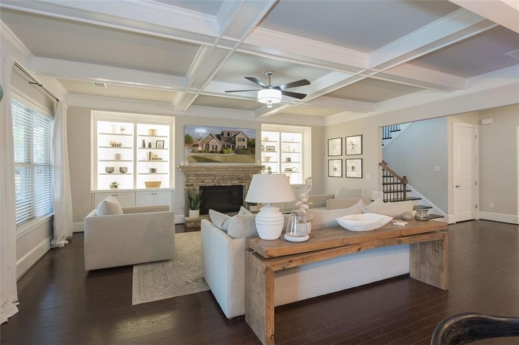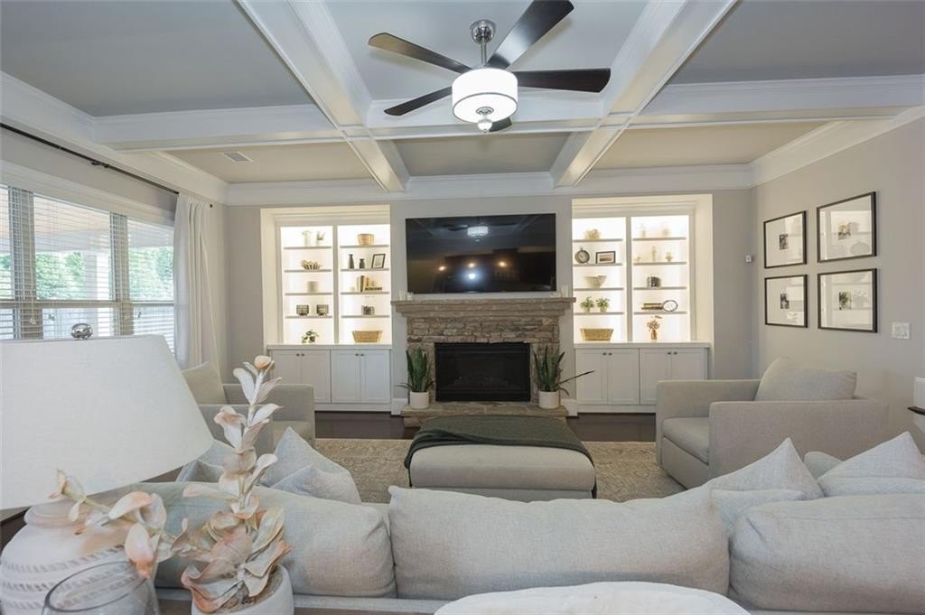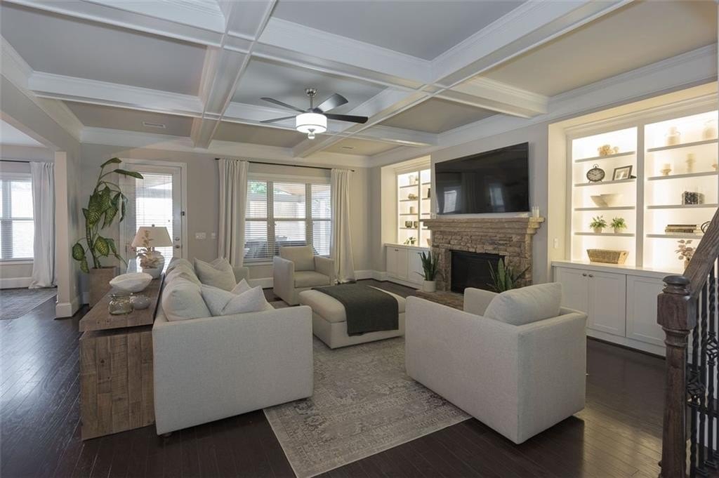 This stunning two-story home boasts luxury features throughout and is nestled on a private cul-de-sac. Upon entry, you'll find rich, dark hardwood floors stretching across the main level. To your left, there's a versatile living room that can serve as a dining area, office, or flex space. Moving further inside, the open floor plan reveals a family room with built-in bookcases, coffered ceilings, and an inviting fireplace.
