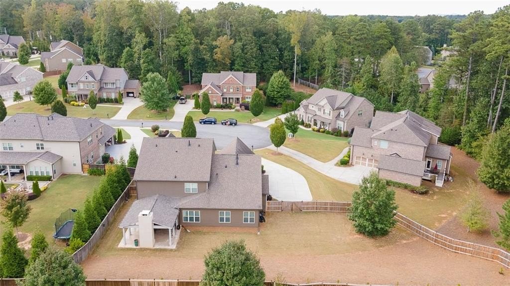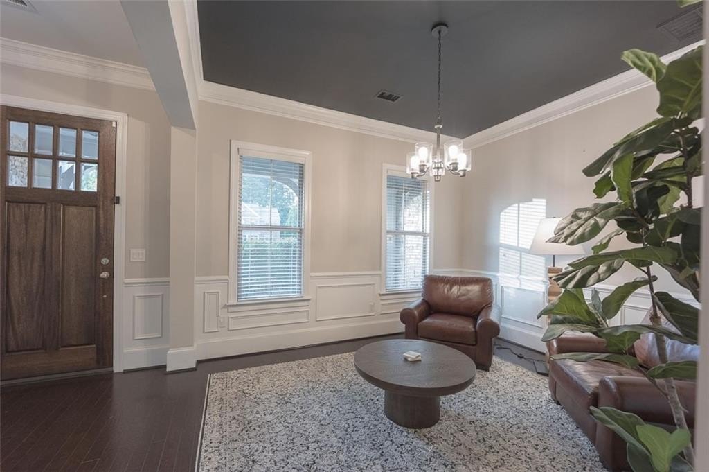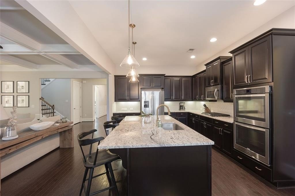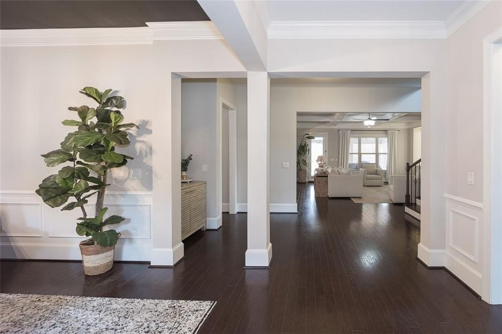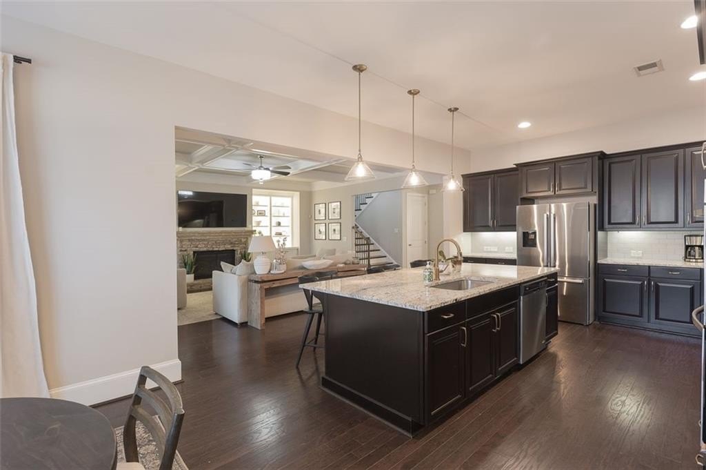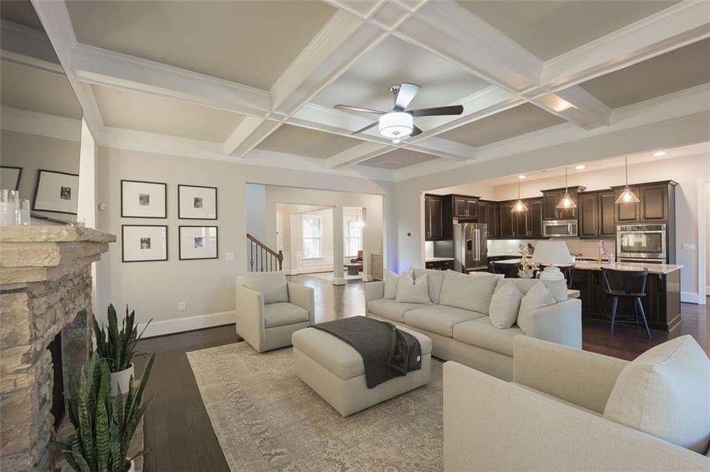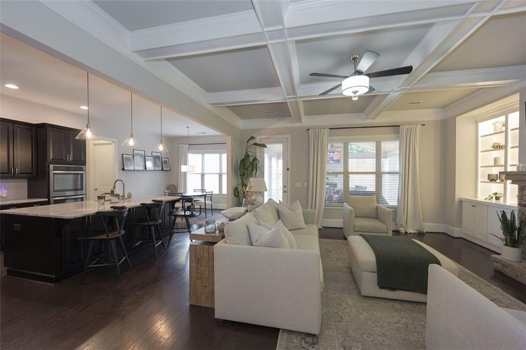 This stunning two-story home boasts luxury features throughout and is nestled on a private cul-de-sac. Upon entry, you'll find rich, dark hardwood floors stretching across the main level. To your left, there's a versatile living room that can serve as a dining area, office, or flex space. Moving further inside, the open floor plan reveals a family room with built-in bookcases, coffered ceilings, and an inviting fireplace.