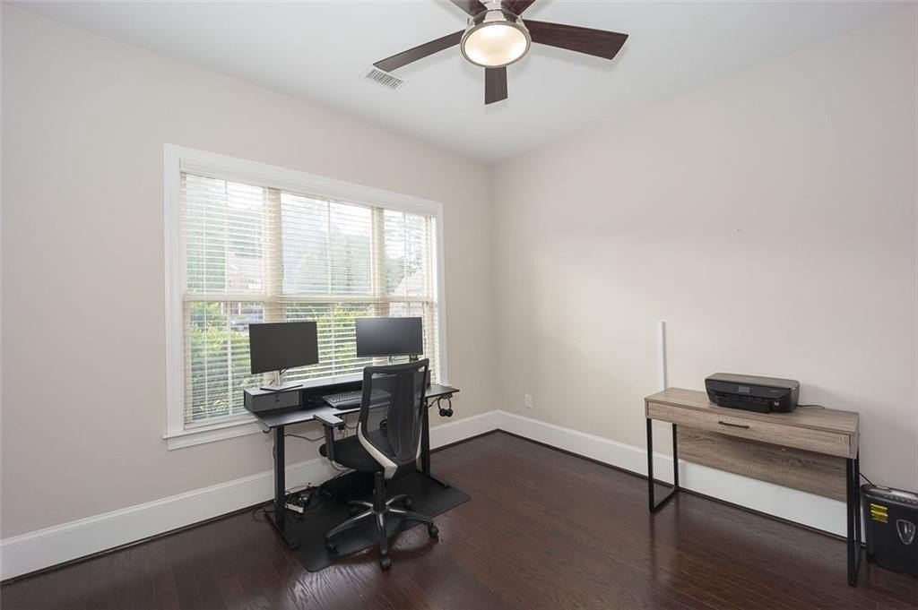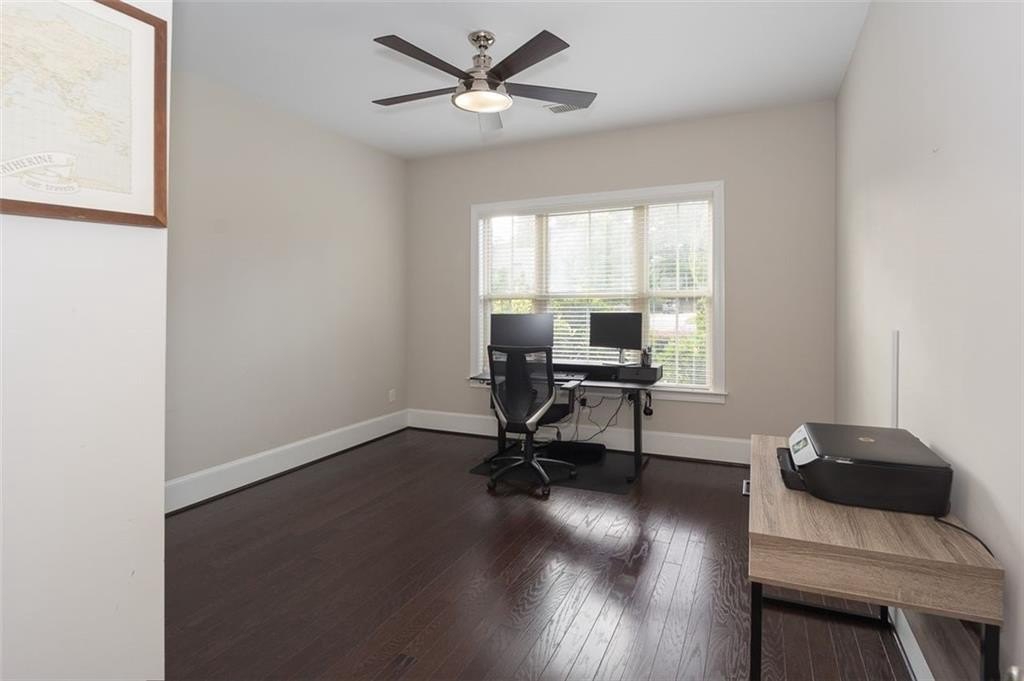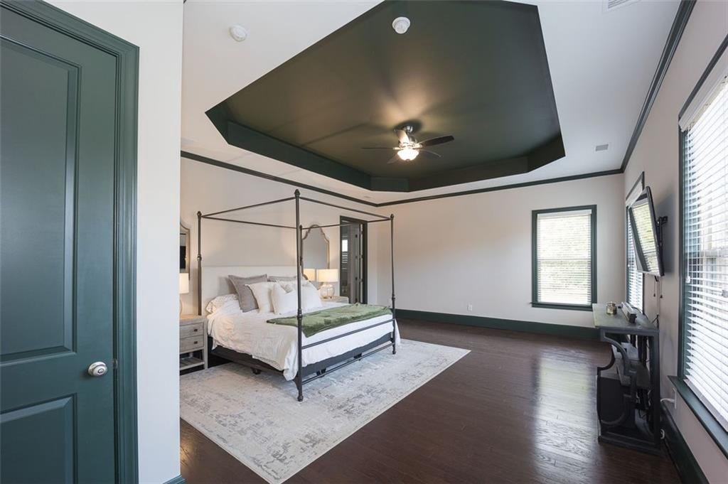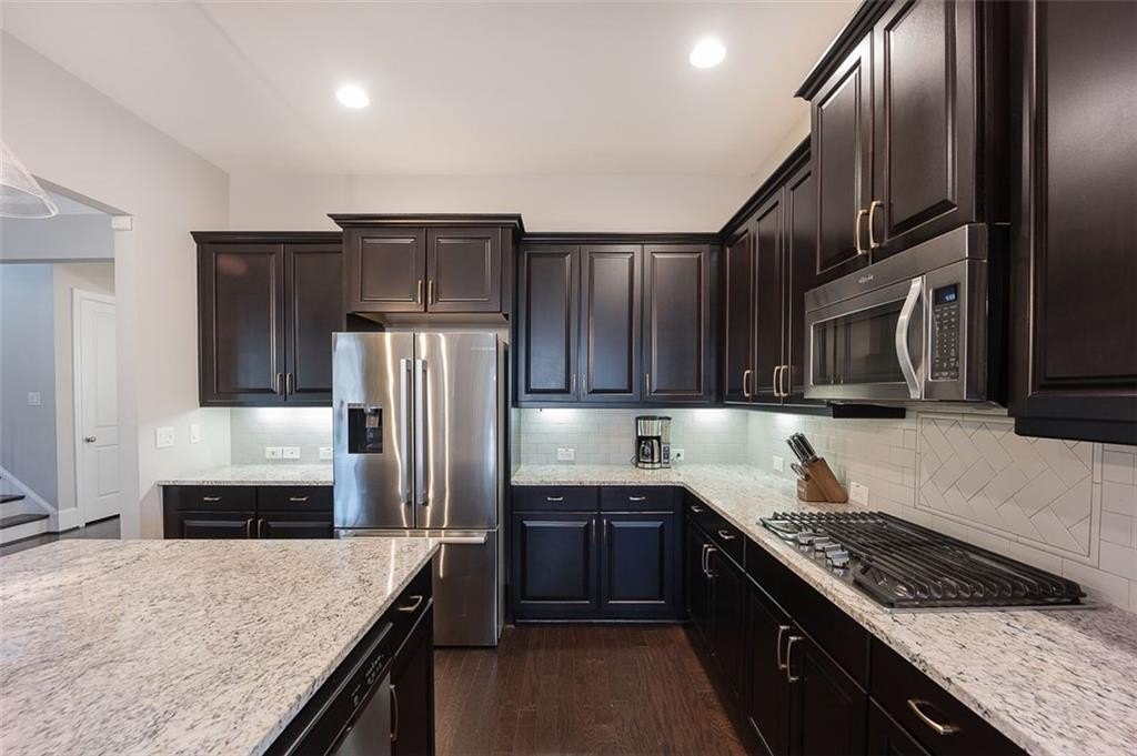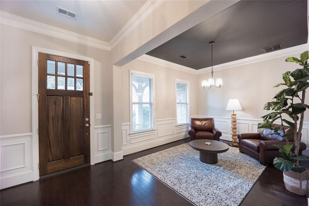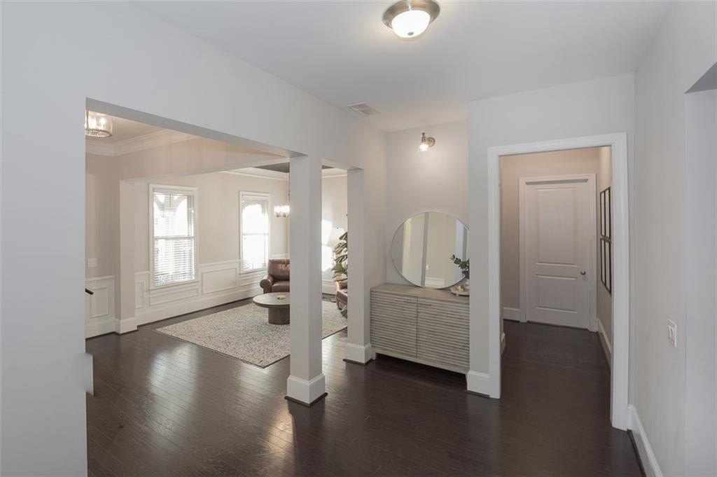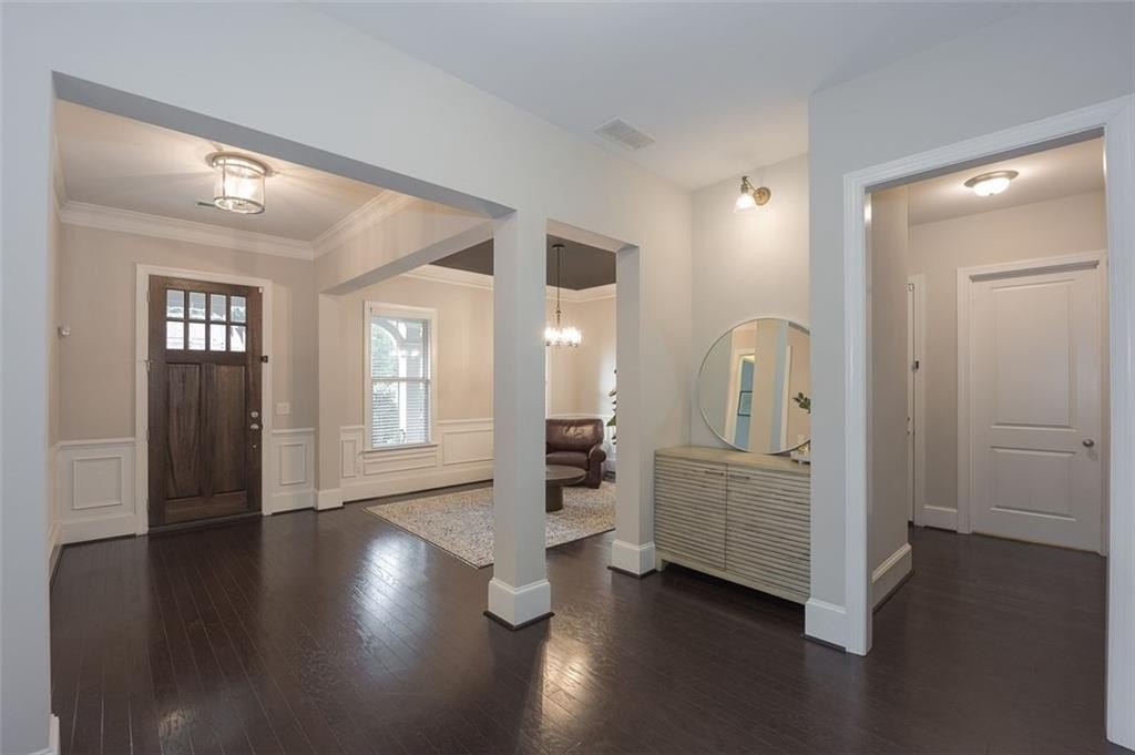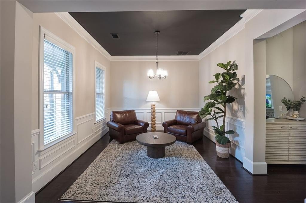 This stunning two-story home boasts luxury features throughout and is nestled on a private cul-de-sac. Upon entry, you'll find rich, dark hardwood floors stretching across the main level. To your left, there's a versatile living room that can serve as a dining area, office, or flex space. Moving further inside, the open floor plan reveals a family room with built-in bookcases, coffered ceilings, and an inviting fireplace.