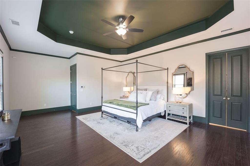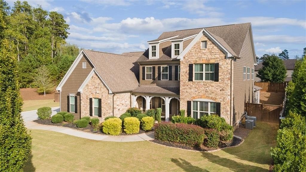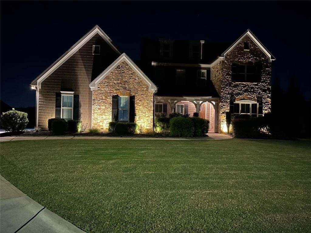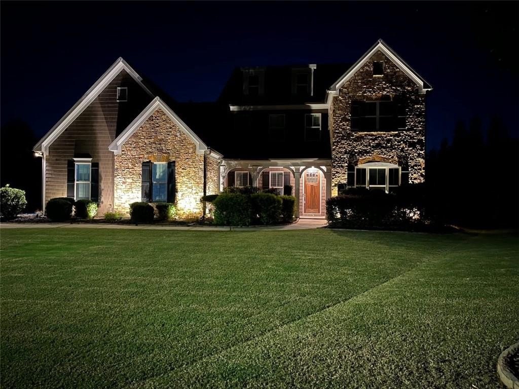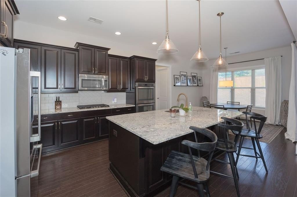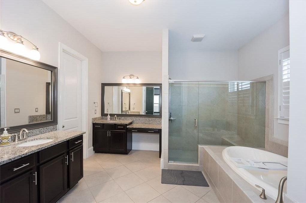 The kitchen is equipped with double ovens, stainless steel appliances, granite countertops, and a spacious center island overlooking the family room and breakfast nook. Also located on the main level is an oversized primary bedroom suite, featuring a large walk-in shower, garden tub, dual vanities, and a generous walk-in closet with direct access to the laundry room. An additional bedroom and full bath complete the first floor.
