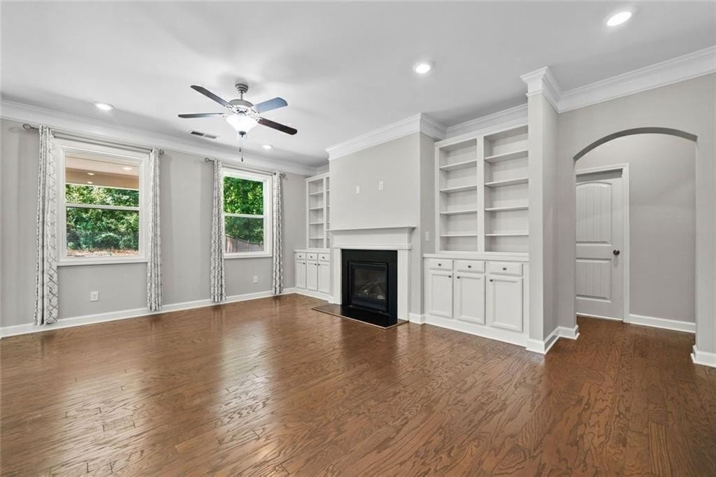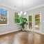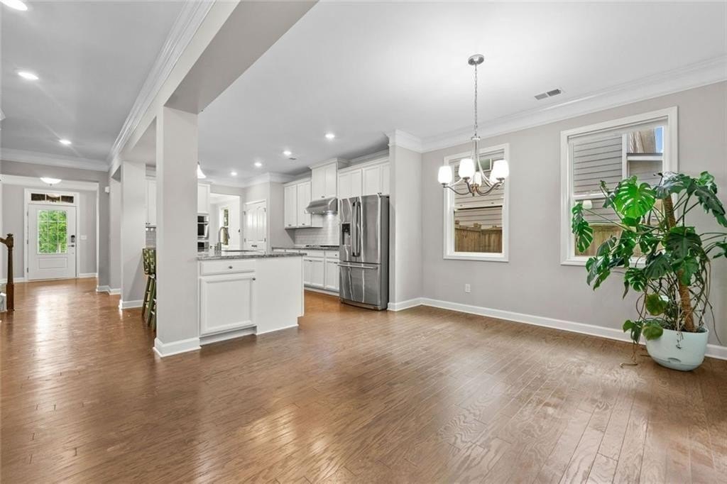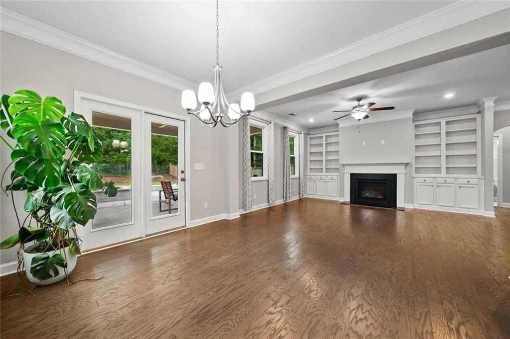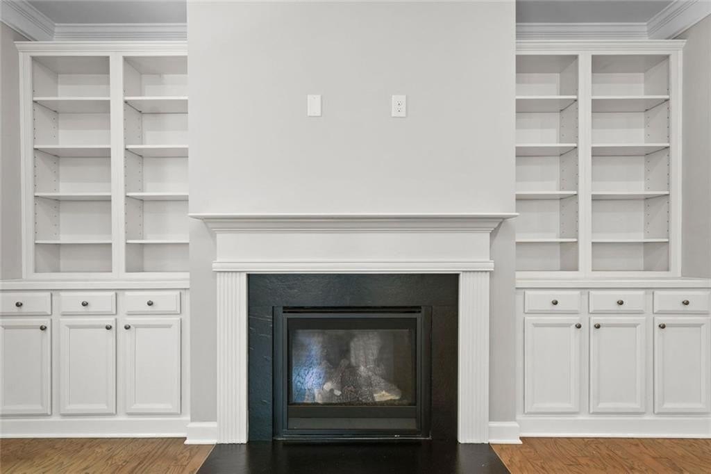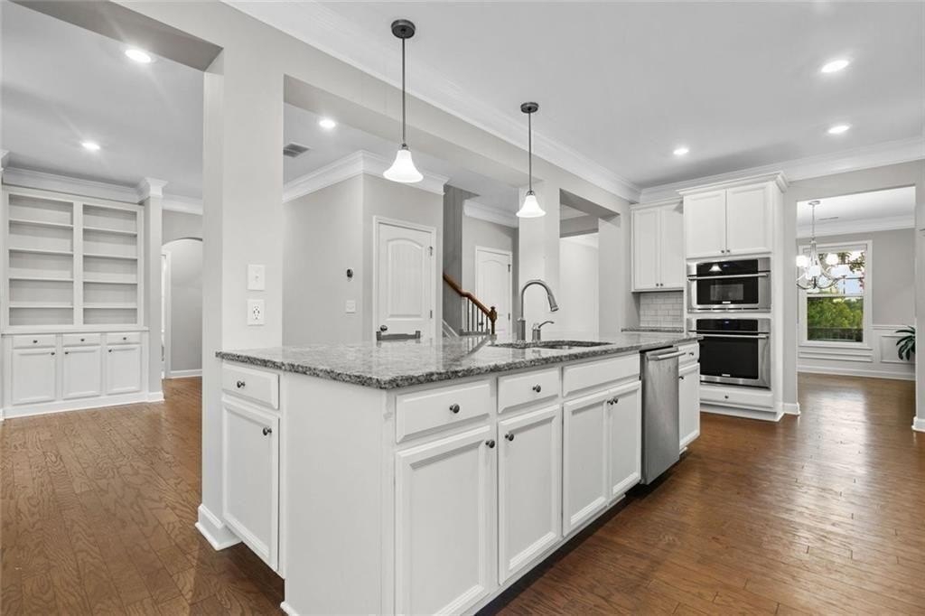Step into the oversized dining room, perfect for hosting gatherings and holiday meals. The bright white kitchen has a large island with pendant lights. It includes a gas cooktop, built-in oven, and microwave. Also, there’s a sunny eat-in area that flows into the living room. Enjoy cozy evenings by the gas fireplace surrounded by custom built-in bookshelves.