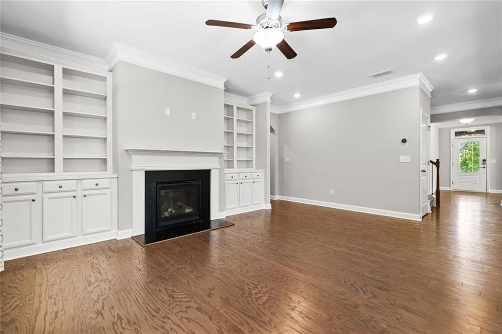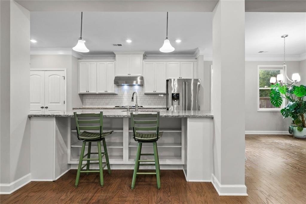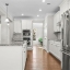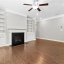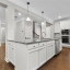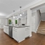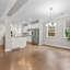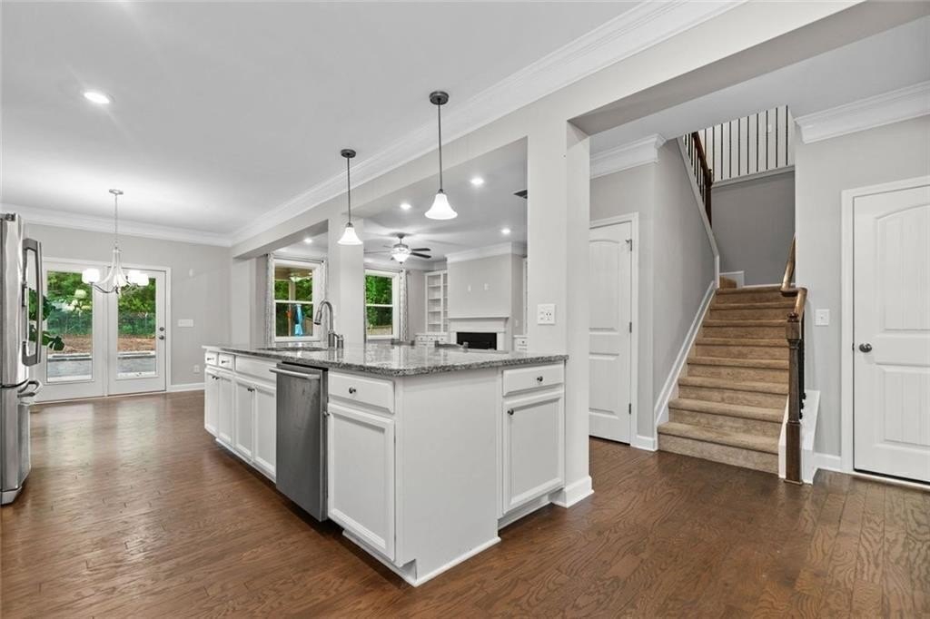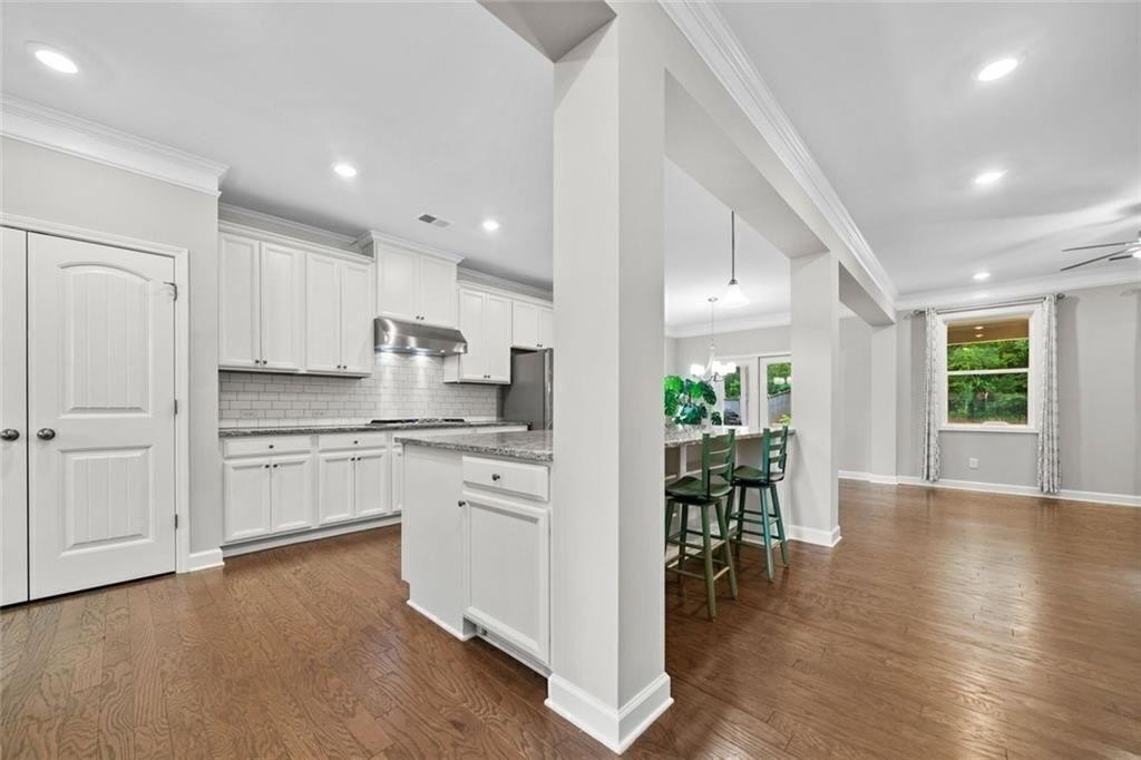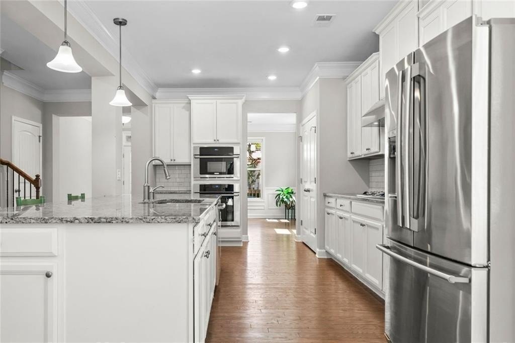 Step into the oversized dining room, perfect for hosting gatherings and holiday meals. The bright white kitchen has a large island with pendant lights. It includes a gas cooktop, built-in oven, and microwave. Also, there’s a sunny eat-in area that flows into the living room. Enjoy cozy evenings by the gas fireplace surrounded by custom built-in bookshelves.