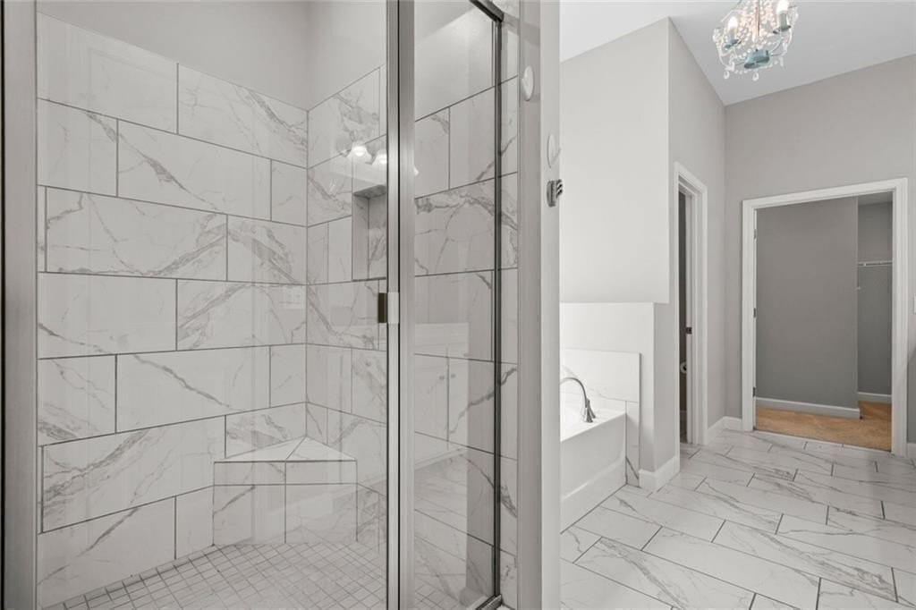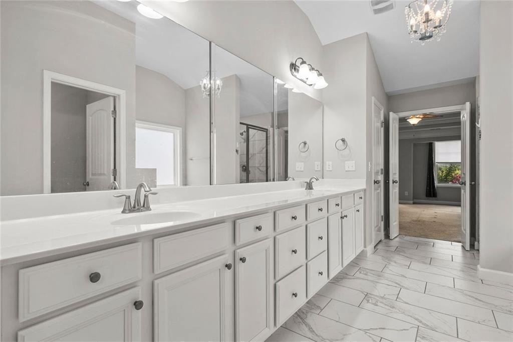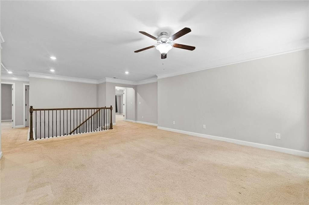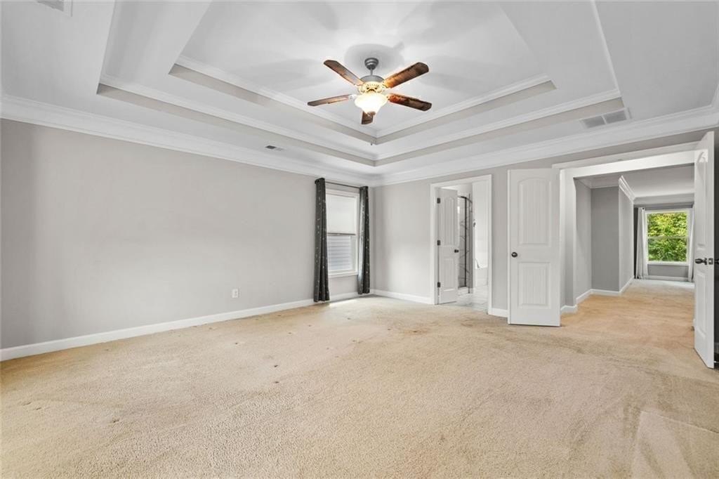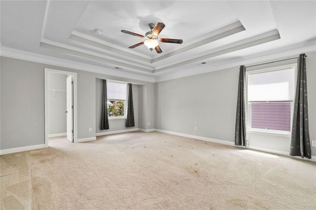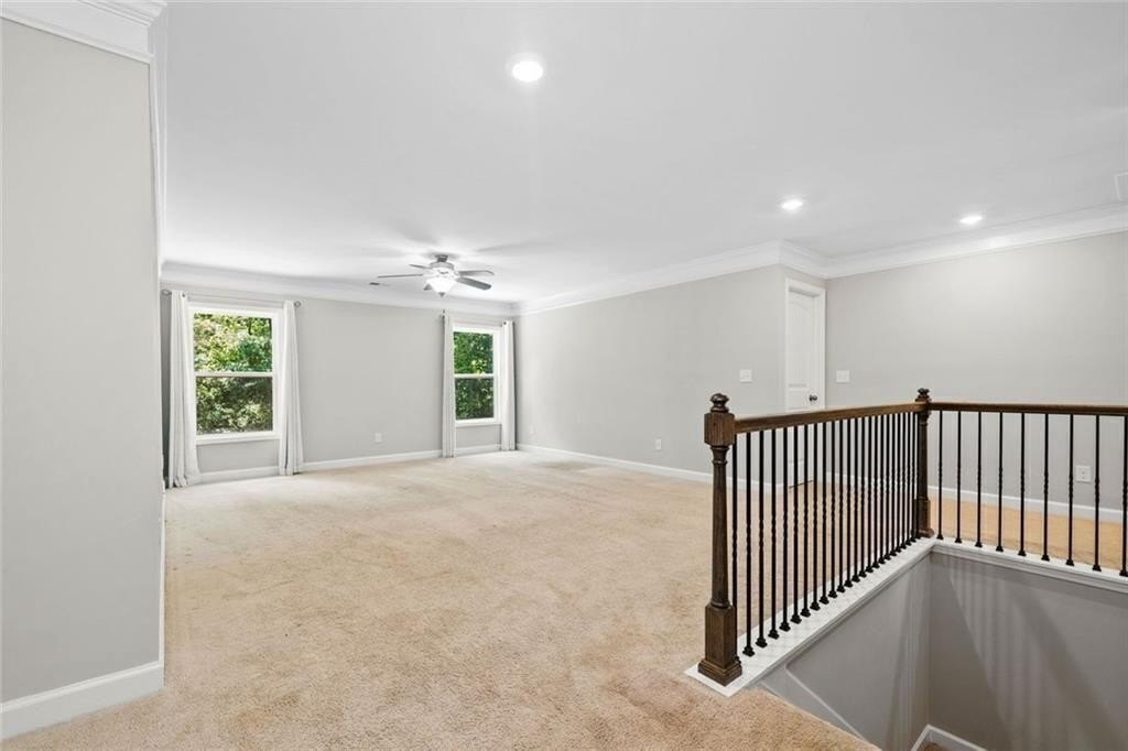Upstairs, there’s a flexible loft great for gaming, working, or relaxing. You’ll also find three good-sized bedrooms, and a full bath. The roomy primary suite boasts a double trey ceiling. It includes a large walk-in closet and a lovely en suite bath. The bath features a soaking tub, a tiled shower, and double vanities.
