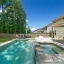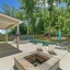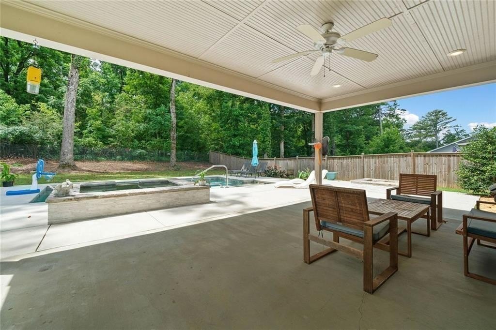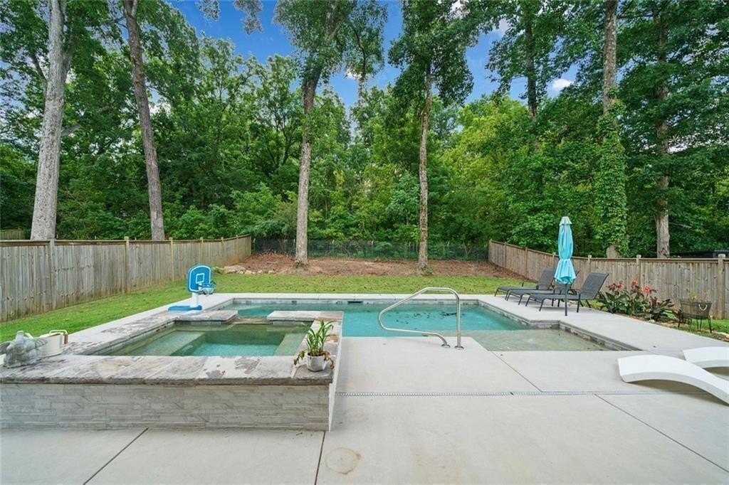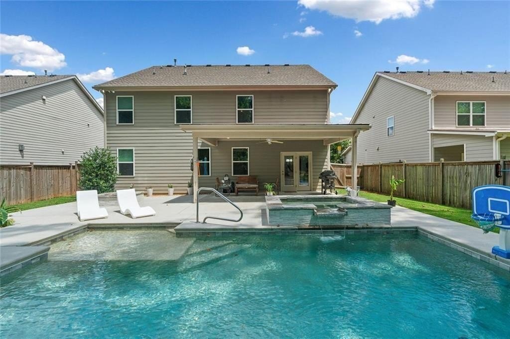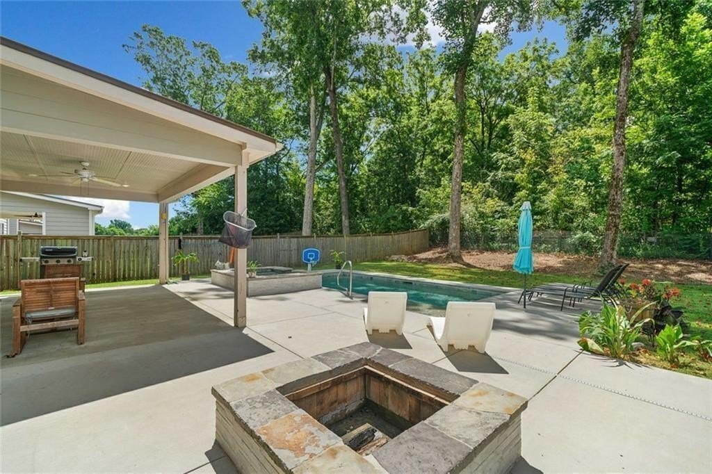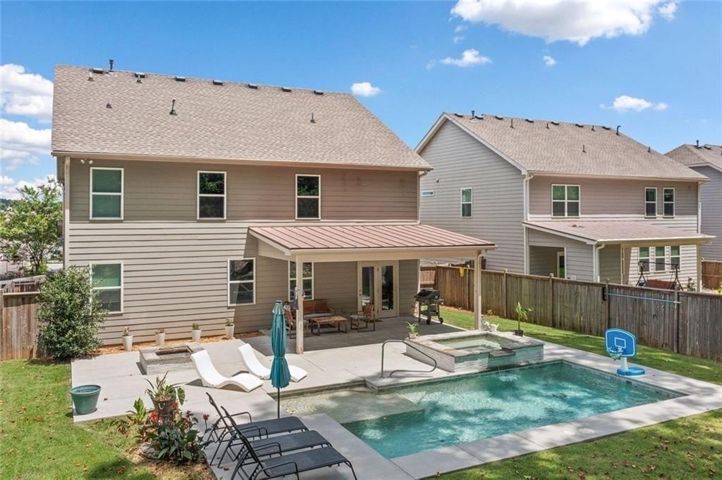 Step outside to your private retreat. The covered patio looks out over a fenced backyard oasis. It has a fire pit, a hot tub with a waterfall, and a sparkling saltwater in-ground pool.