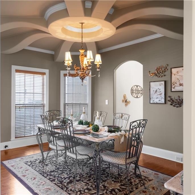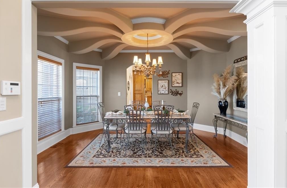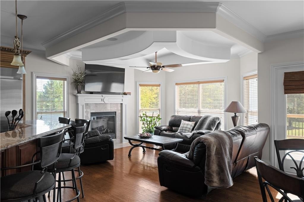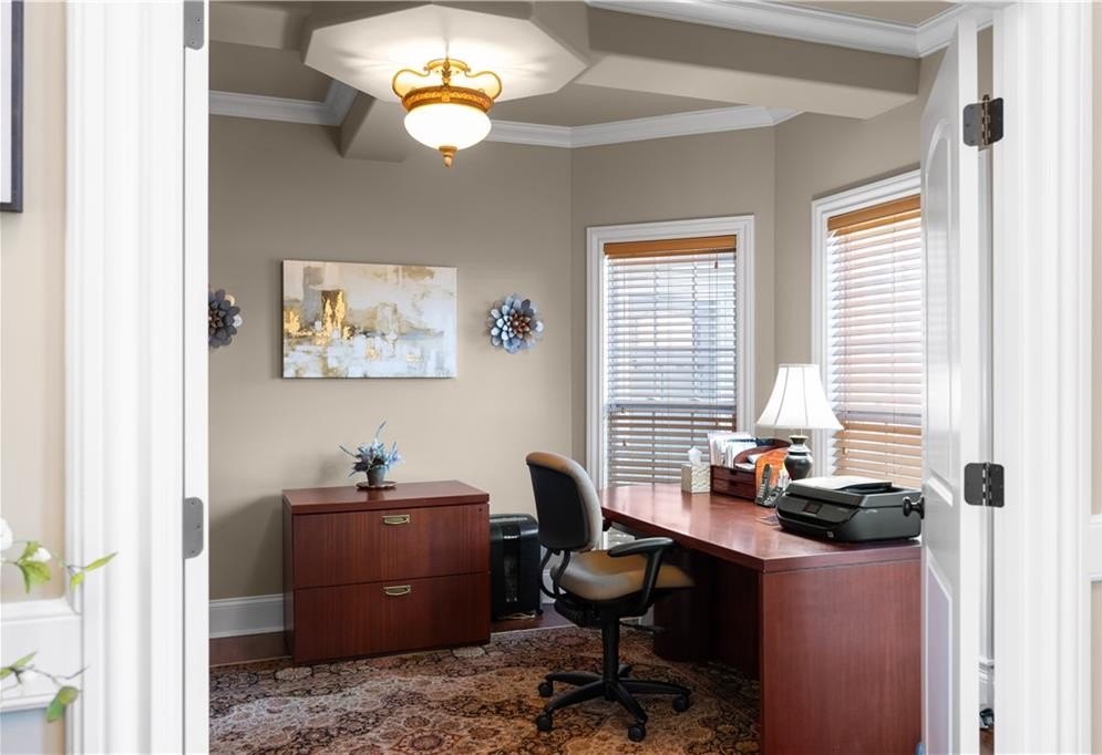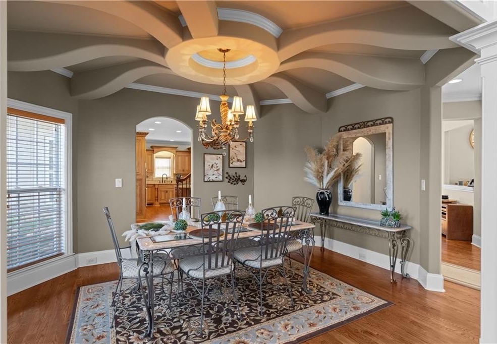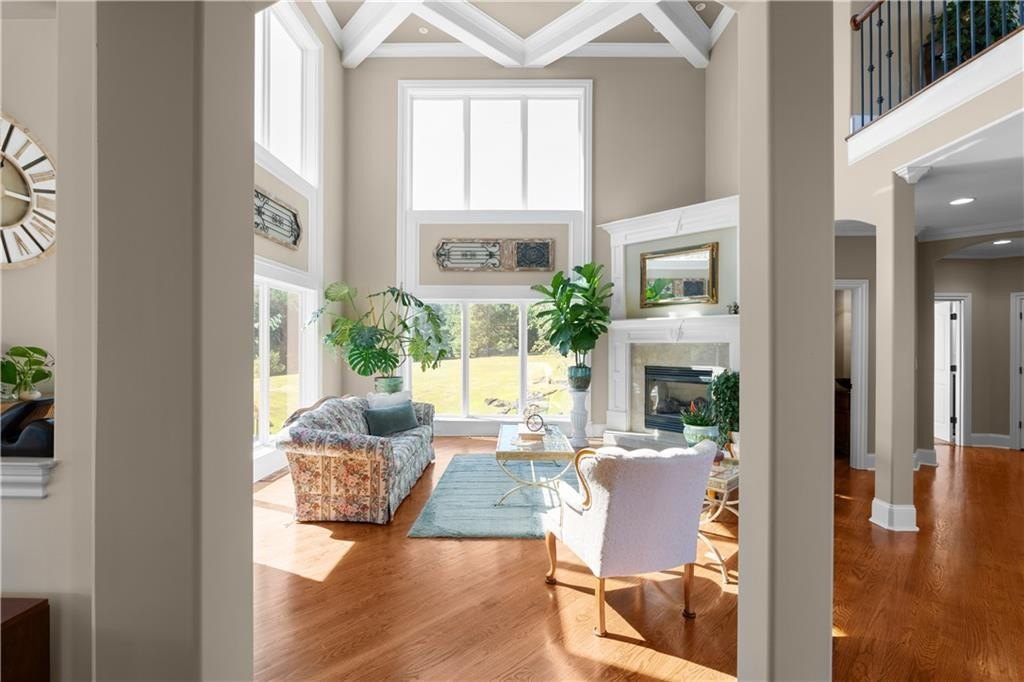Step inside to an open-concept floor plan filled with natural light and accented by four elegant fireplaces. The dining room, living room, and both owner’s suites feature exquisite Art Deco-inspired coffered ceilings that add timeless character and sophistication.