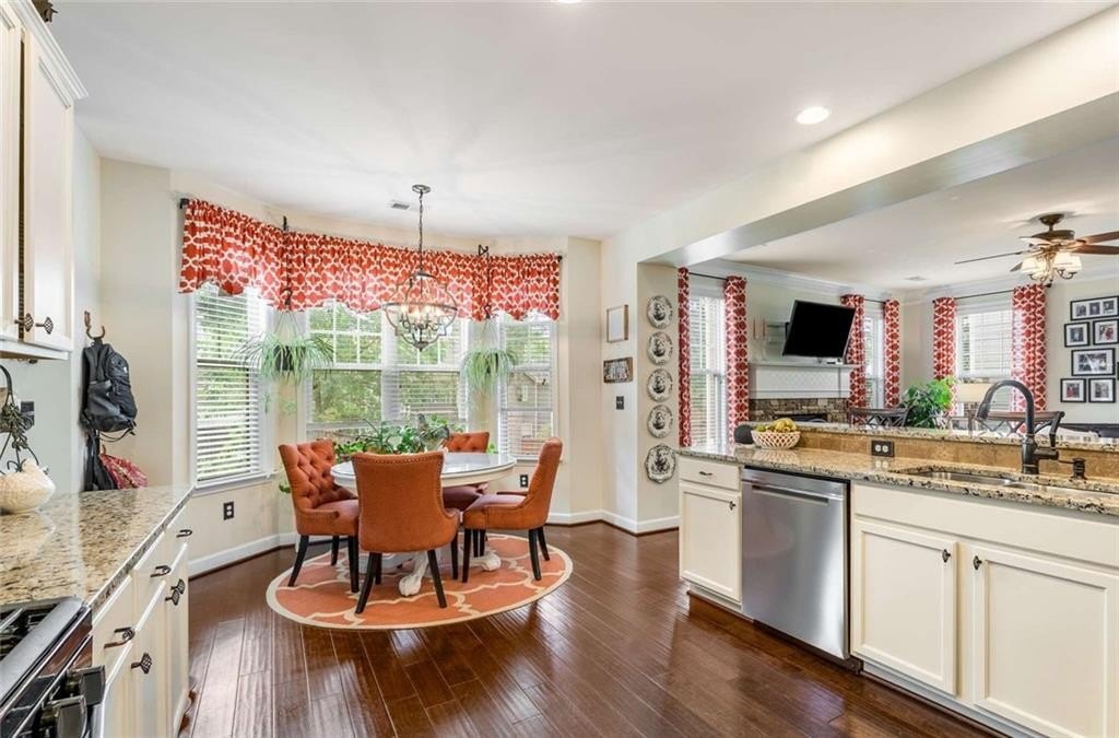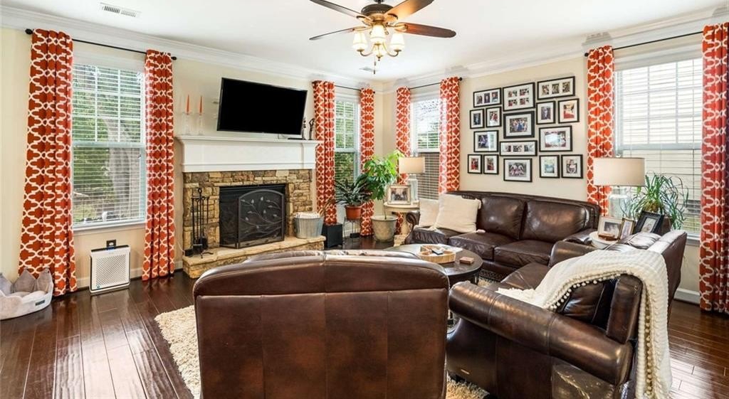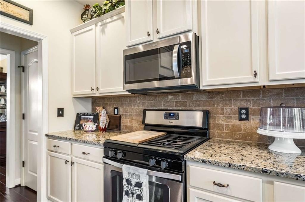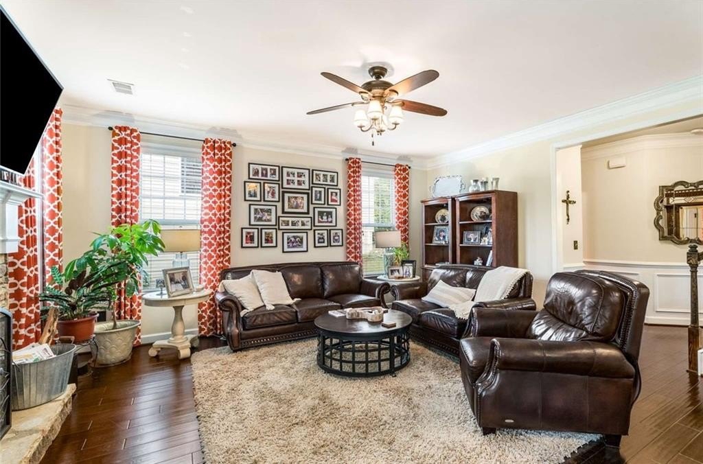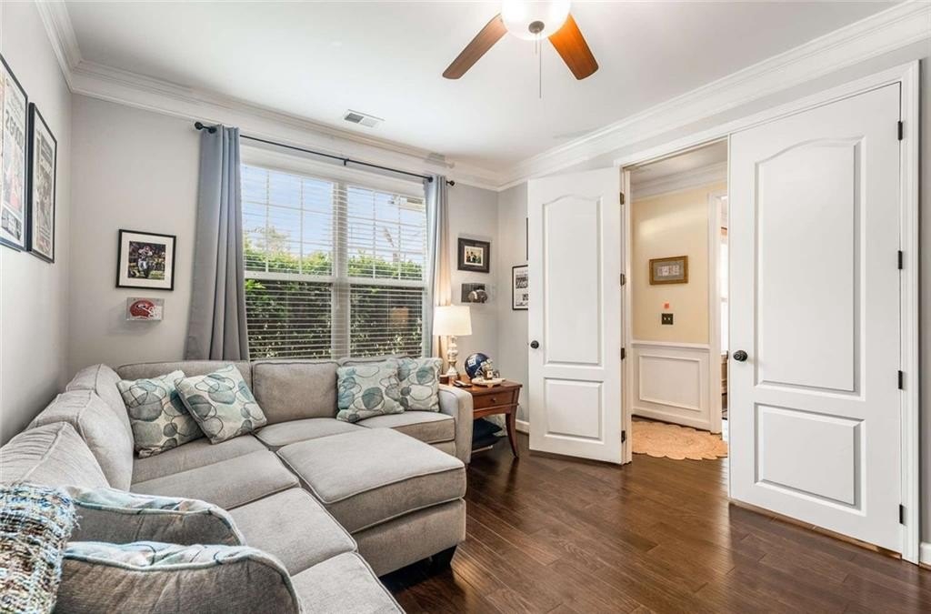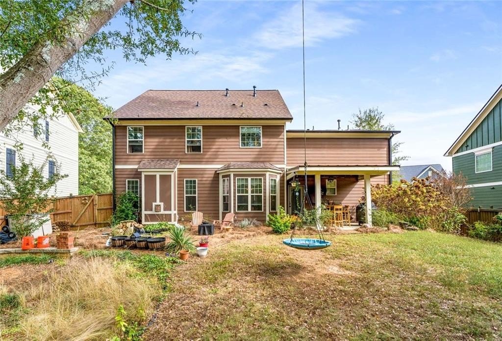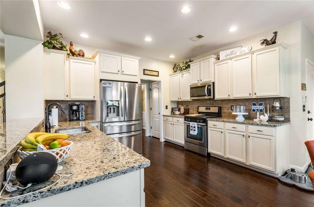 Welcome to this beautifully maintained Craftsman-style home located in a gated community just minutes from the vibrant Marietta Square. Offering 5 bedrooms and 3.5 bathrooms, this spacious residence seamlessly blends timeless style, modern updates, and functional design—perfect for today’s lifestyle. Gleaming hardwood floors flow throughout the main level, leading to an open-concept living space that includes a generous family room, formal dining room, den/study, and a gourmet kitchen featuring granite countertops, updated cabinetry, and stainless-steel appliances—including a new refrigerator, microwave, and dishwasher (2024/2025). The redesigned laundry room enhances everyday convenience with a modern, efficient layout. Upstairs, you’ll find newly installed hardwood flooring and carpeted stairs (2024), a large primary suite with en-suite bath, and three additional bedrooms—one with a private bath, ideal for guests or multigenerational living. The third level offers a versatile bonus suite with a fifth bedroom, perfect for a home office, media room, or private retreat. Step outside to a large, fenced backyard complete with a tranquil pond and a stunning mature hardwood tree offering shade and natural beauty. The custom covered porch provides a serene space to enjoy your morning coffee or unwind in the evenings. Additional upgrades include a new roof (2022), new interior paint, updated light fixtures, and thoughtful enhancements throughout. This home offers a rare combination of privacy, elegance, and convenience in a prime location close to shopping, dining, and cultural attractions.