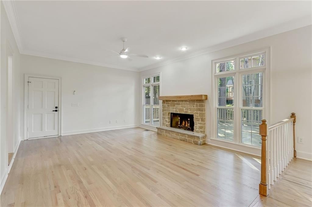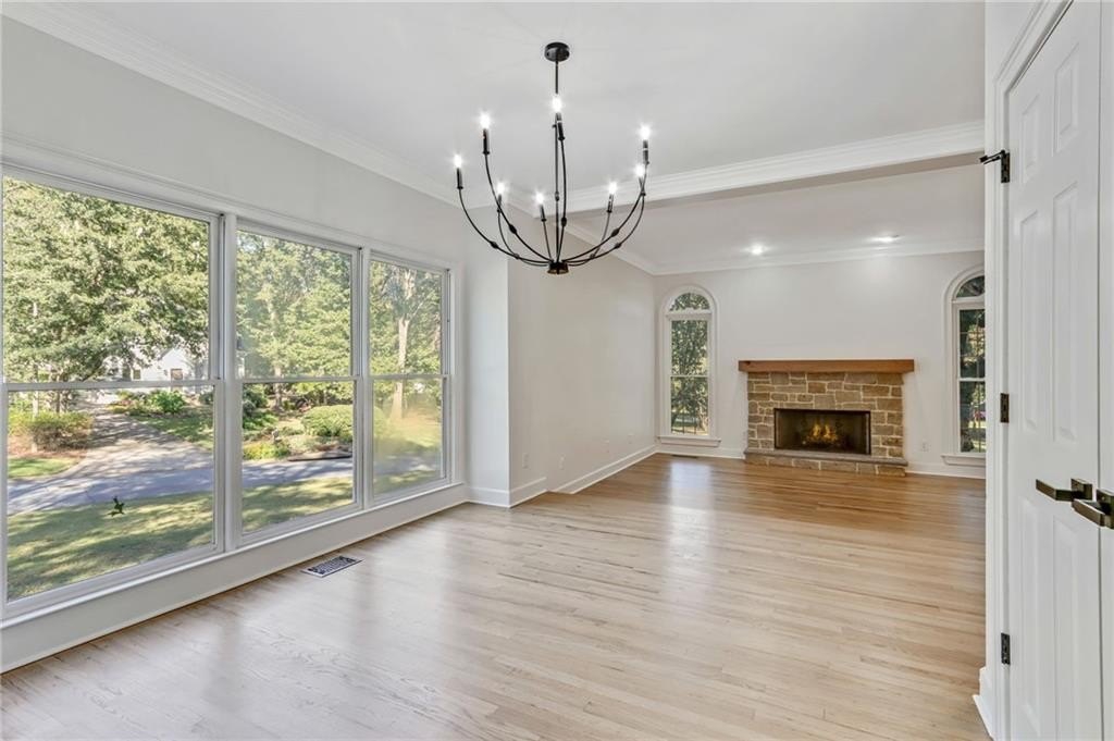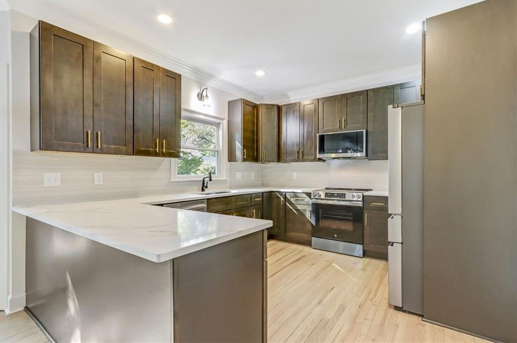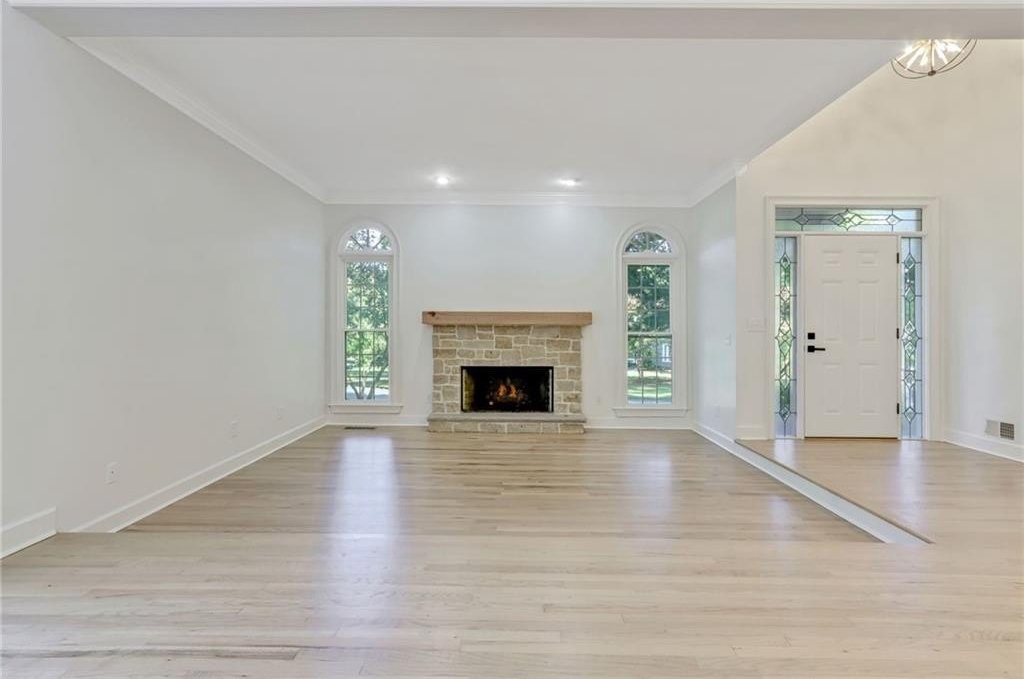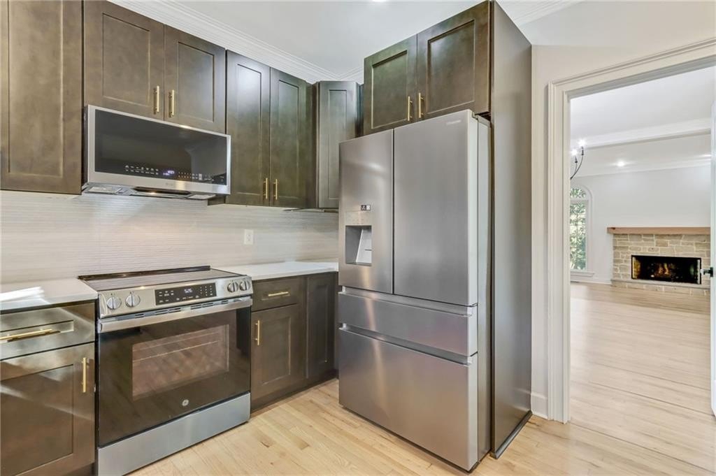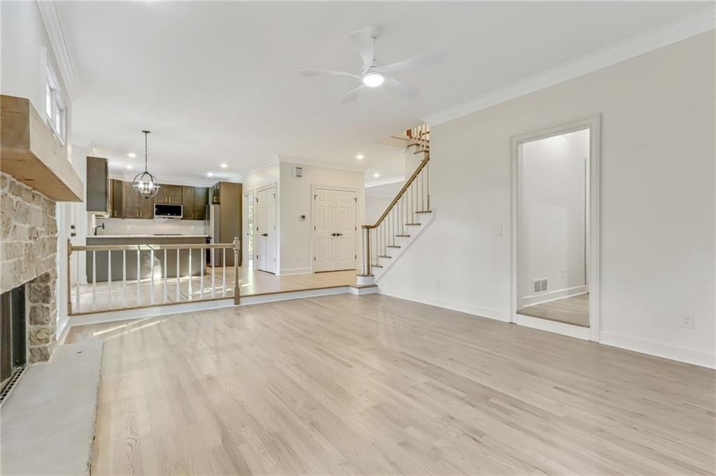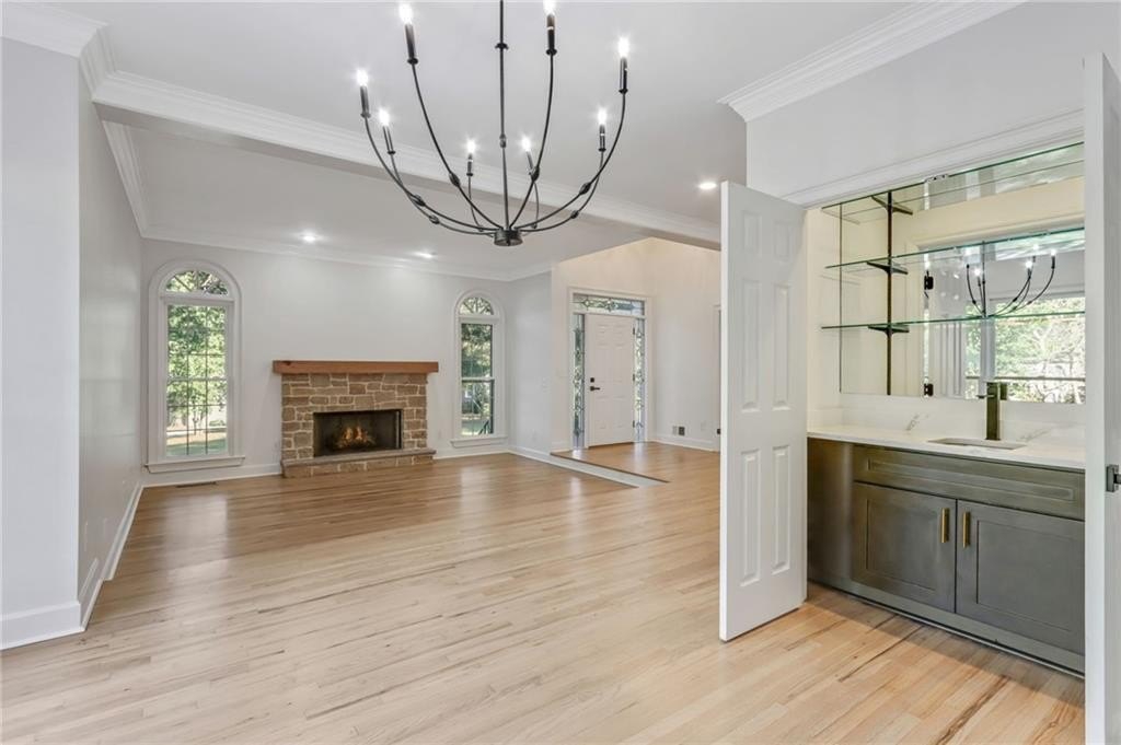 Completely remodeled modern home featuring two sunken living rooms and stunning designer finishes throughout. The all-new kitchen boasts quartz countertops, new cabinetry, stainless-steel appliances, and updated lighting fixtures. Hardwood floors flow through the main level and upstairs hallway, with new carpet in all bedrooms. A wet bar with new cabinet, sink, and quartz adds the perfect entertaining touch. Main level offers an office or bedroom plus full bath, ideal for guests or work-from-home. Upstairs features the primary suite with its own fireplace, plus three additional bedrooms. Enjoy three fireplaces total (all professionally re-stoned), fully remodeled bathrooms, a new deck, professionally landscaped yard and exterior, and a refreshed front stoop (cleaned and re-mortared). Unfinished basement provides room for future expansion. Move-in ready and beautifully updated inside and out this modern renovation truly has it all!