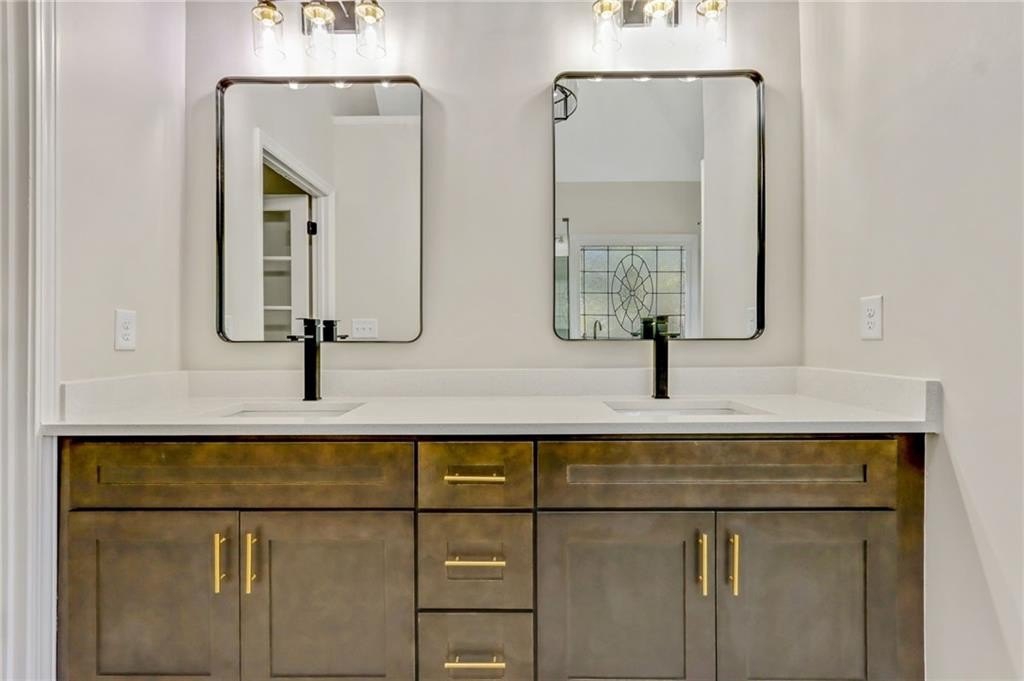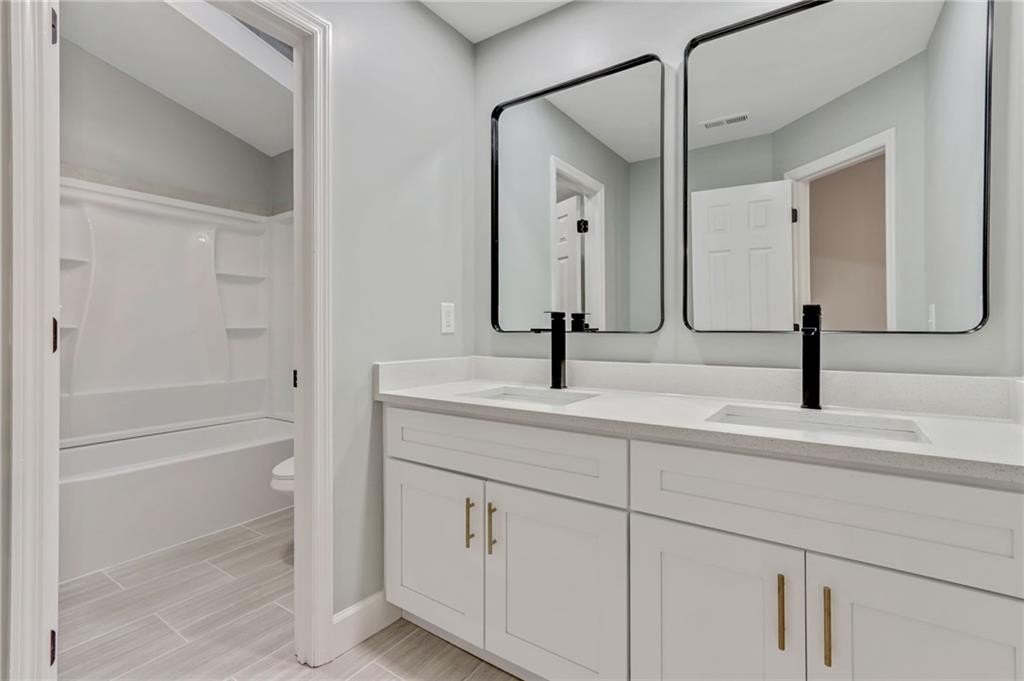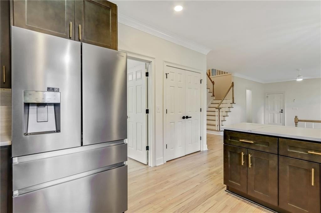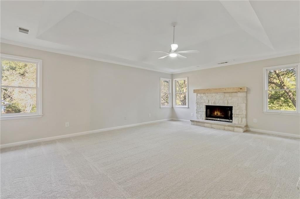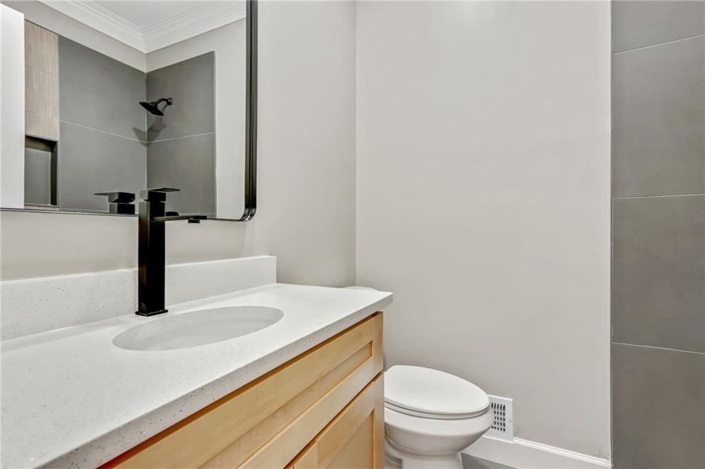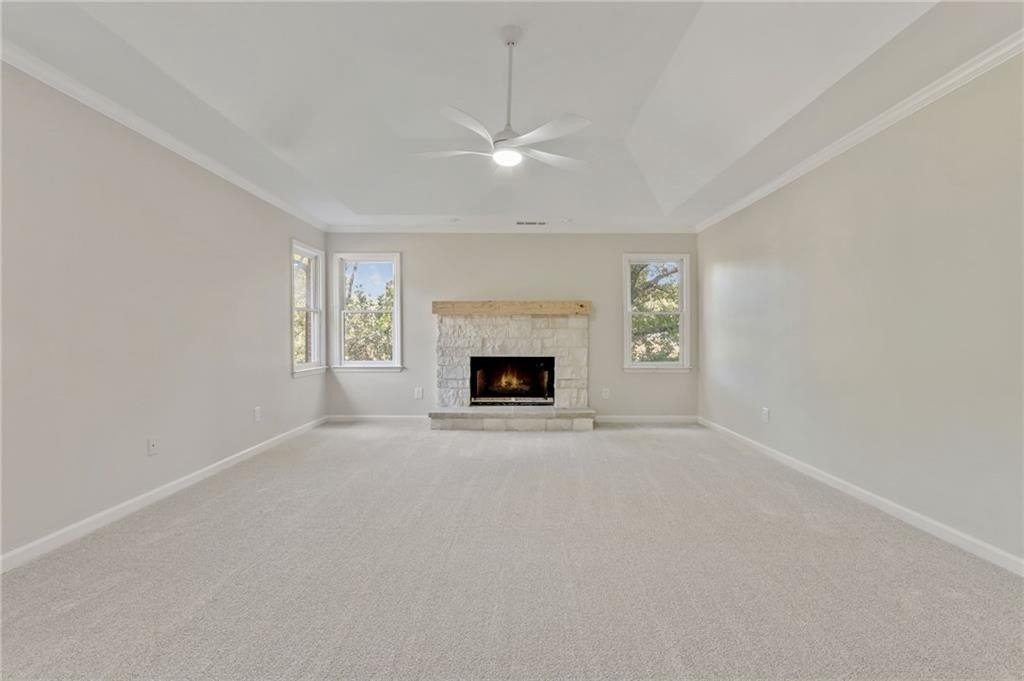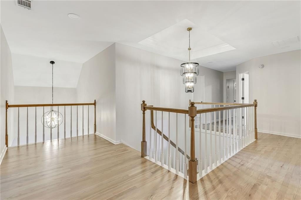 Completely remodeled modern home featuring two sunken living rooms and stunning designer finishes throughout. The all-new kitchen boasts quartz countertops, new cabinetry, stainless-steel appliances, and updated lighting fixtures. Hardwood floors flow through the main level and upstairs hallway, with new carpet in all bedrooms. A wet bar with new cabinet, sink, and quartz adds the perfect entertaining touch. Main level offers an office or bedroom plus full bath, ideal for guests or work-from-home. Upstairs features the primary suite with its own fireplace, plus three additional bedrooms. Enjoy three fireplaces total (all professionally re-stoned), fully remodeled bathrooms, a new deck, professionally landscaped yard and exterior, and a refreshed front stoop (cleaned and re-mortared). Unfinished basement provides room for future expansion. Move-in ready and beautifully updated inside and out this modern renovation truly has it all!