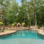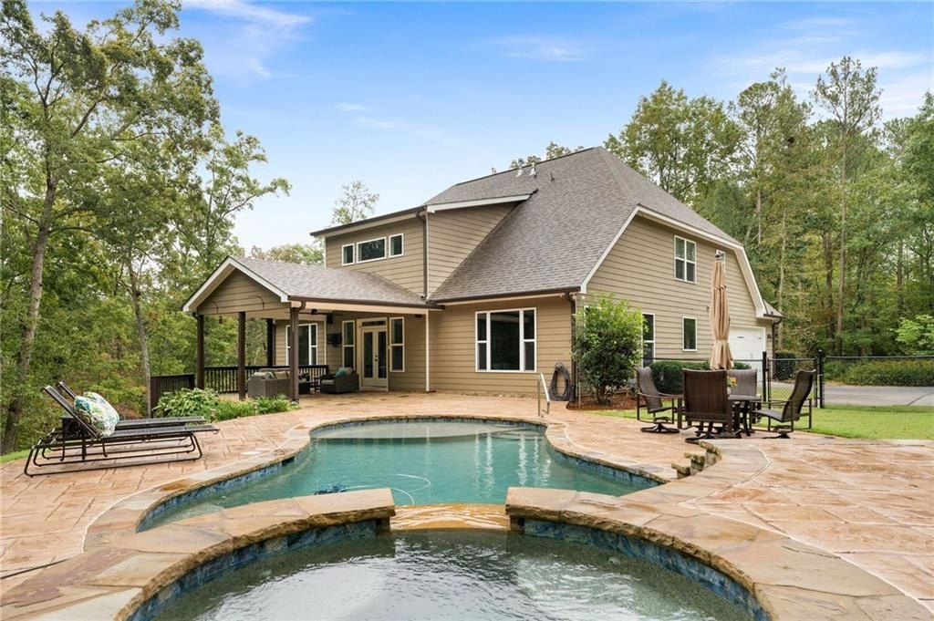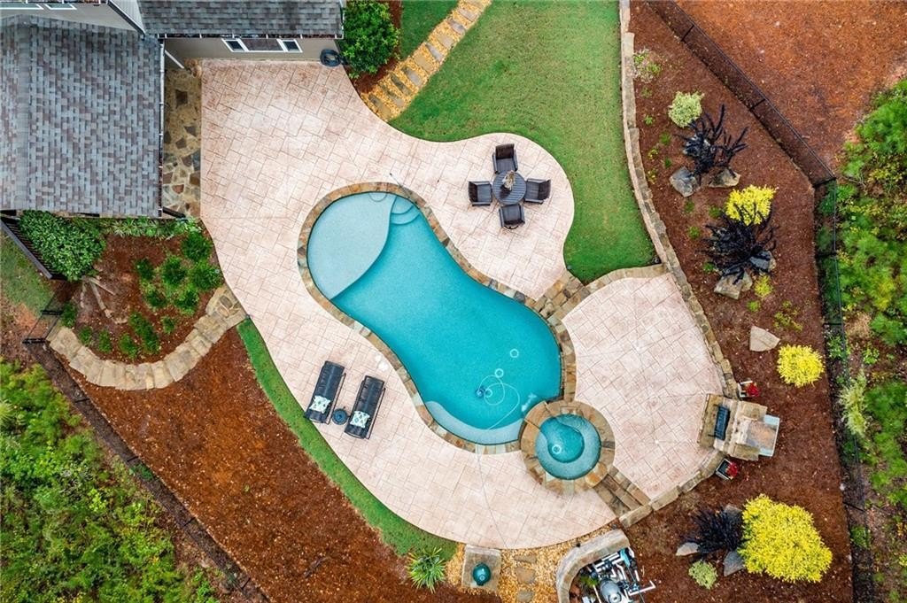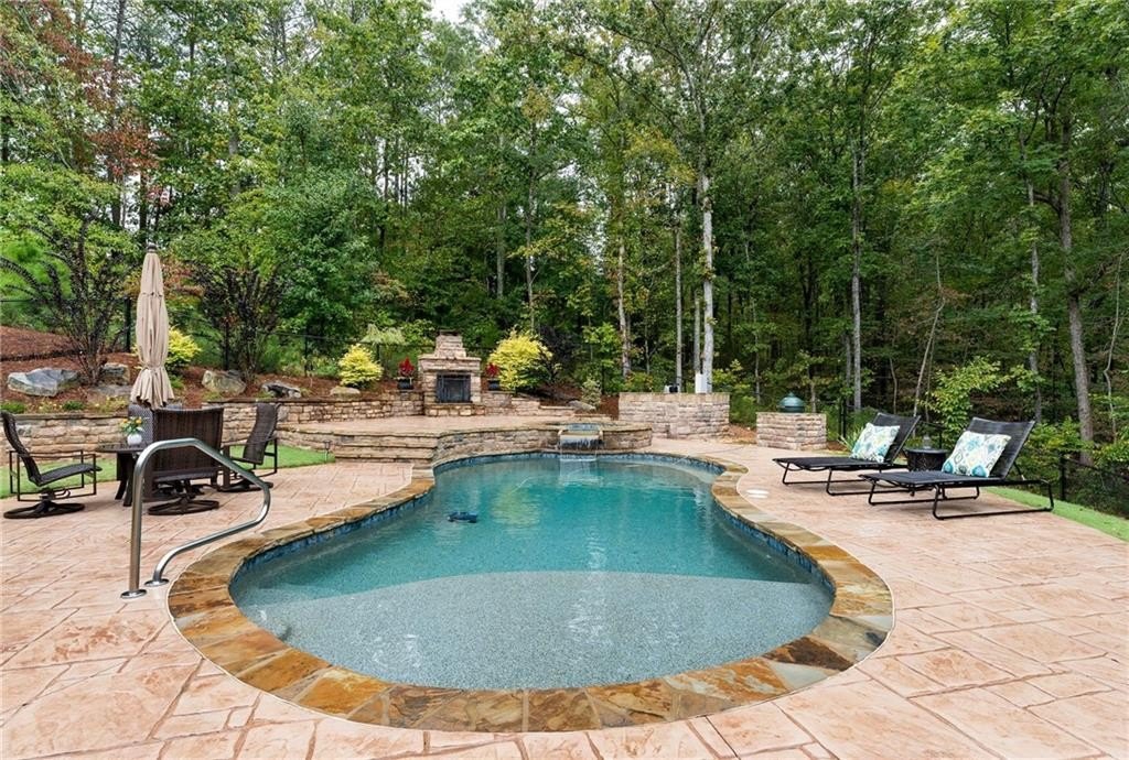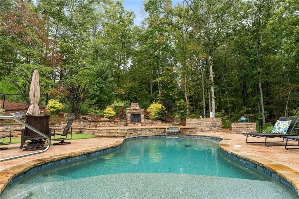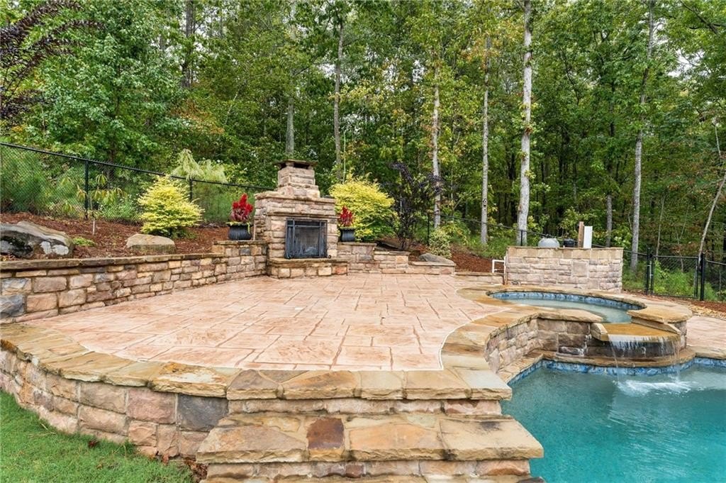Step outside to your own private oasis: a custom gunite pool and spa with a cascading waterfall, surrounded by lush landscaping and a cozy outdoor fireplace plus a Big Green Egg smoker for the ultimate backyard experience.