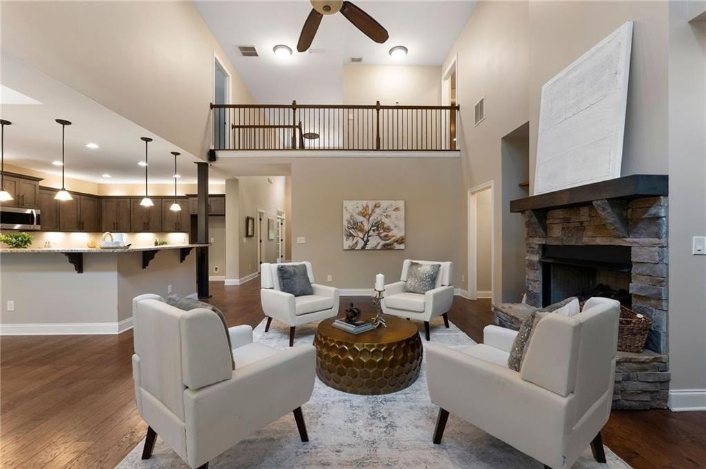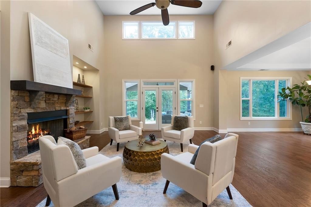 Step inside to discover high ceilings and walls of windows that fill the home with natural light and showcase peaceful wooded views. The open-concept kitchen, dining, and living areas create an inviting flow—ideal for entertaining or quiet evenings by the fire. The primary suite on the main level offers a tranquil escape with easy access to the outdoors.