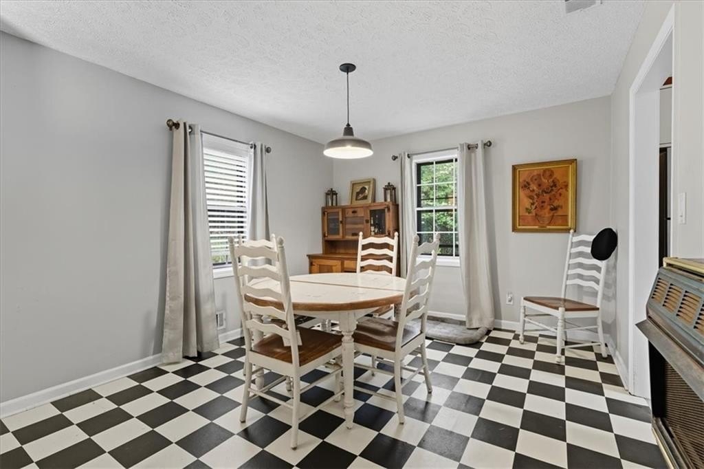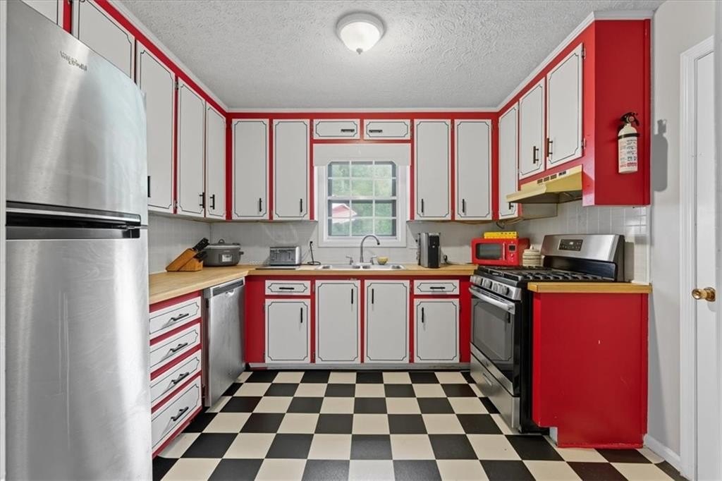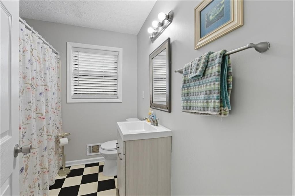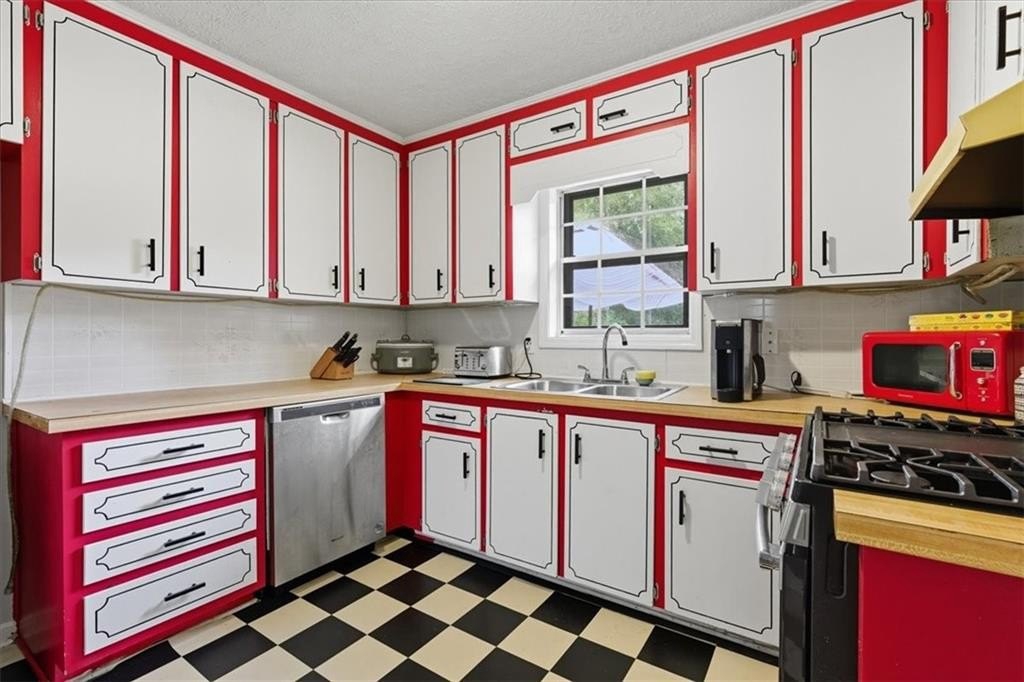 Step inside to discover a layout that balances comfort and practicality. The sunlit living room welcomes you with rich hardwood floors, a warm brick fireplace, and plenty of room for family gatherings. The kitchen’s retro flair shines through its red and white cabinetry and classic checkerboard floor, a cheerful backdrop for cooking and conversation. The primary suite offers a peaceful escape, while two additional bedrooms on the main level provide flexibility for family, guests, or a home office. Downstairs, a finished basement with a full bath opens endless possibilities, from an in-law suite to a media room or creative workspace.