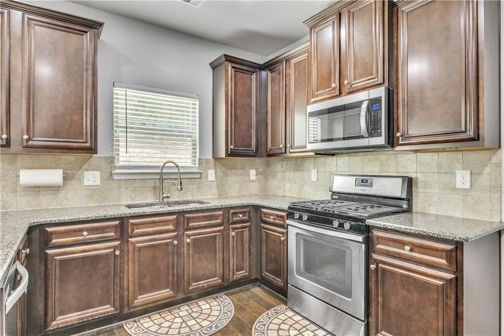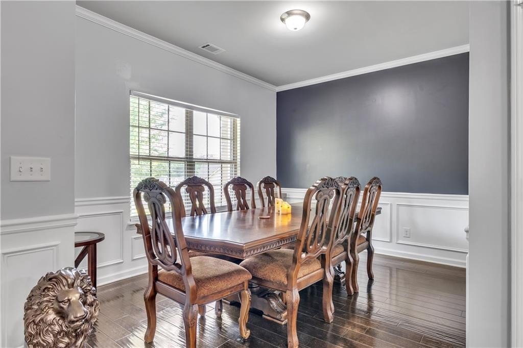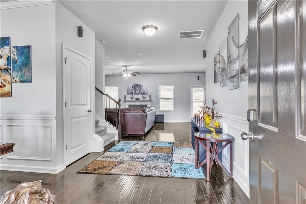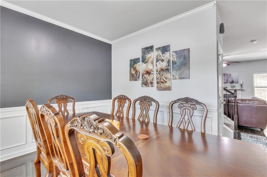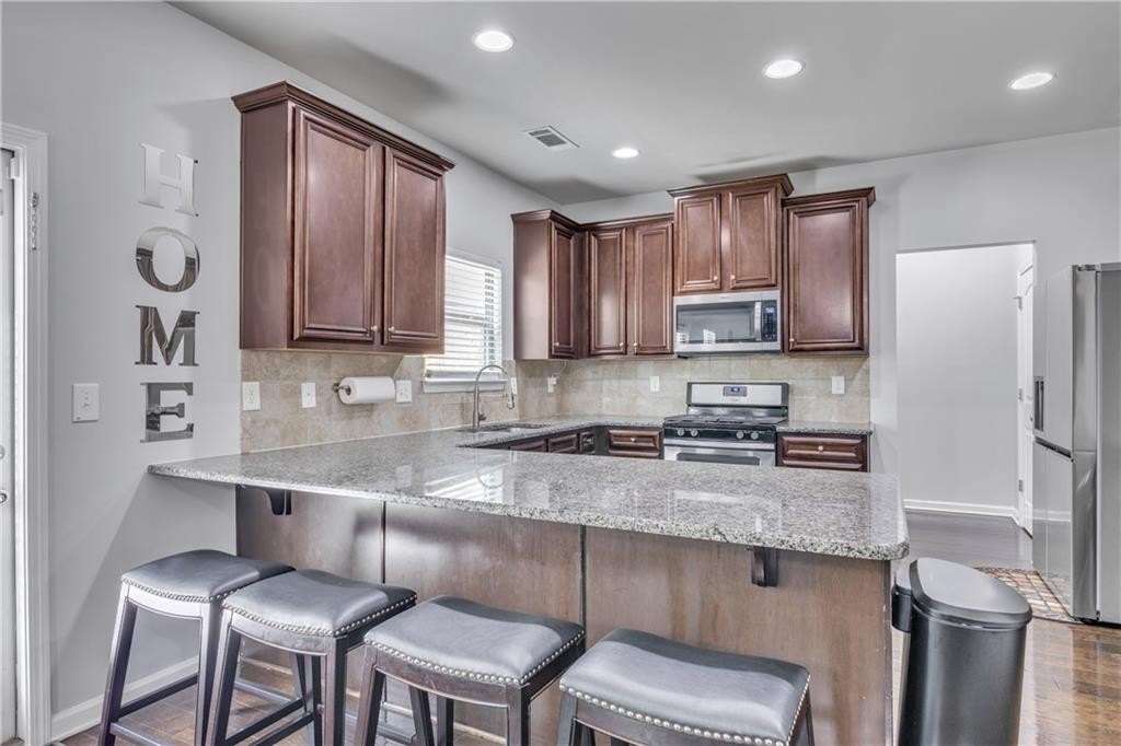 The kitchen comes equipped with brand new appliances and features an oversized breakfast bar, ideal for casual dining, meal prep, or gathering with friends and family. An independent dining room offers a dedicated space for formal meals and entertaining, accommodating both daily routines and special occasions. On the main level, hardwood flooring adds elegance and durability, while all granite countertops throughout the home deliver a modern, high-end touch. Upstairs, new carpeting ensures comfort and a fresh feel, and the entire interior has been freshly painted, contributing to a move-in ready environment.