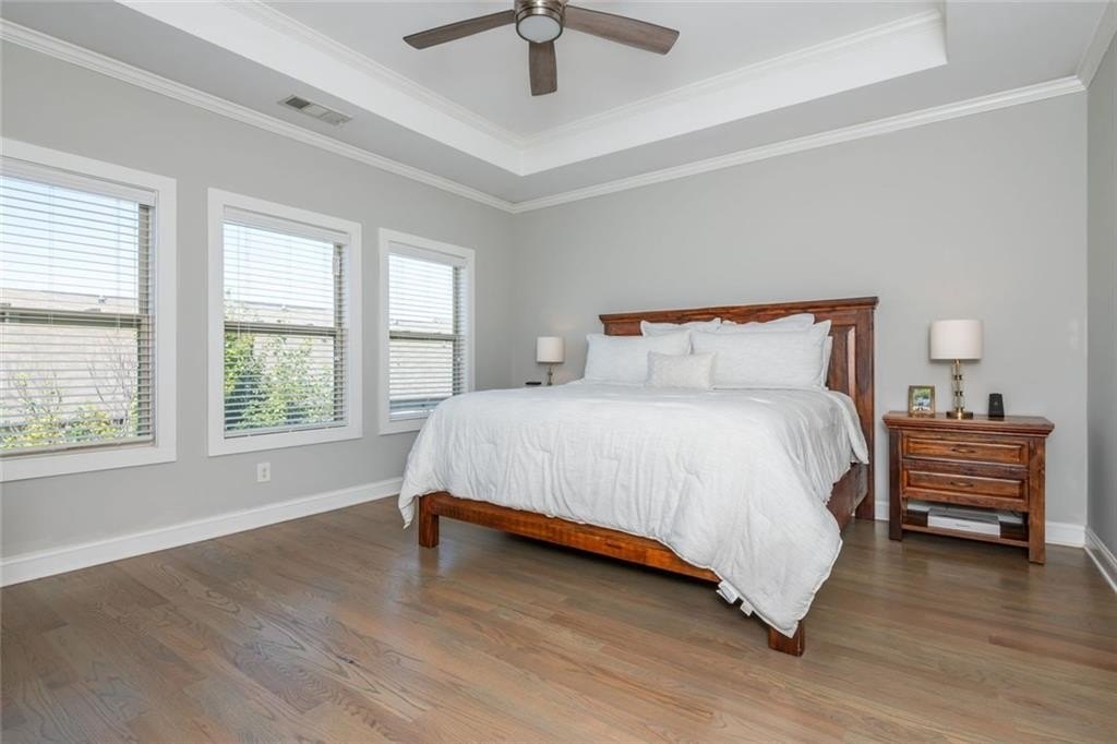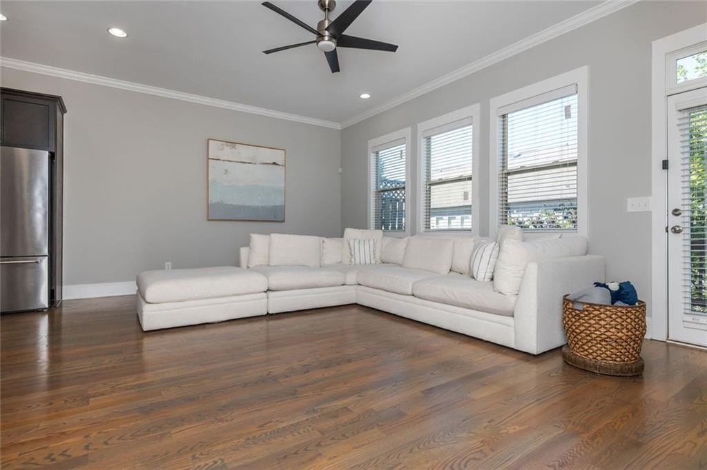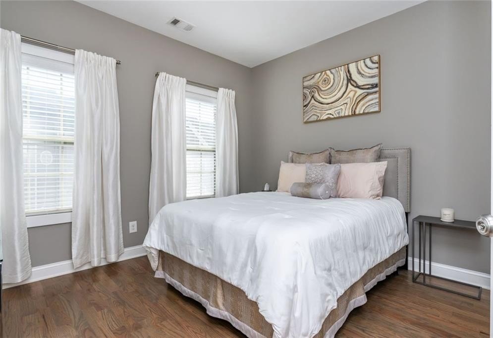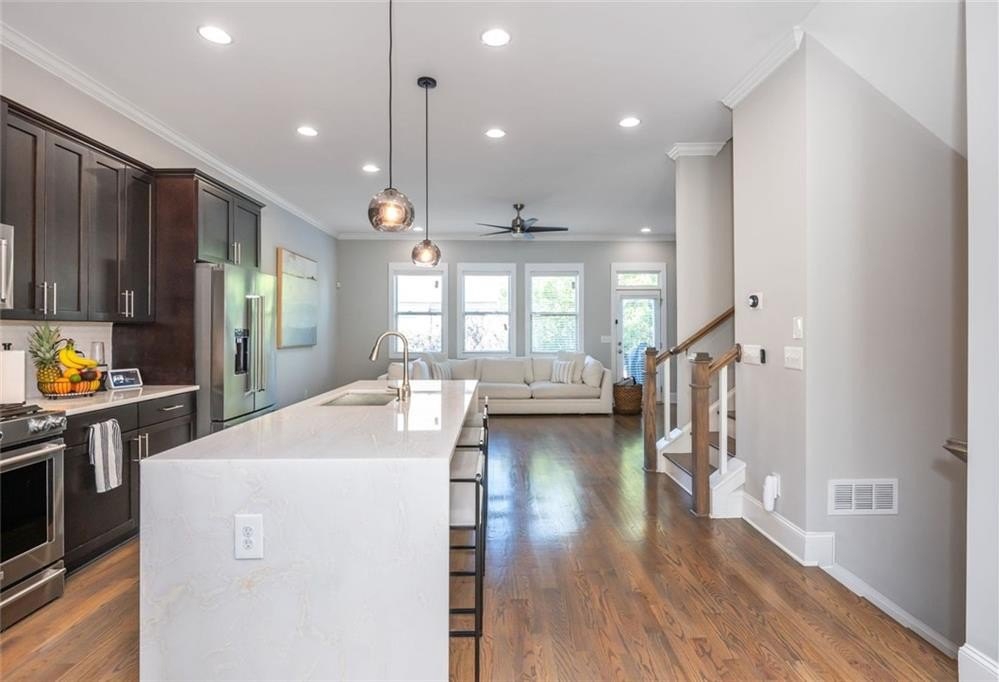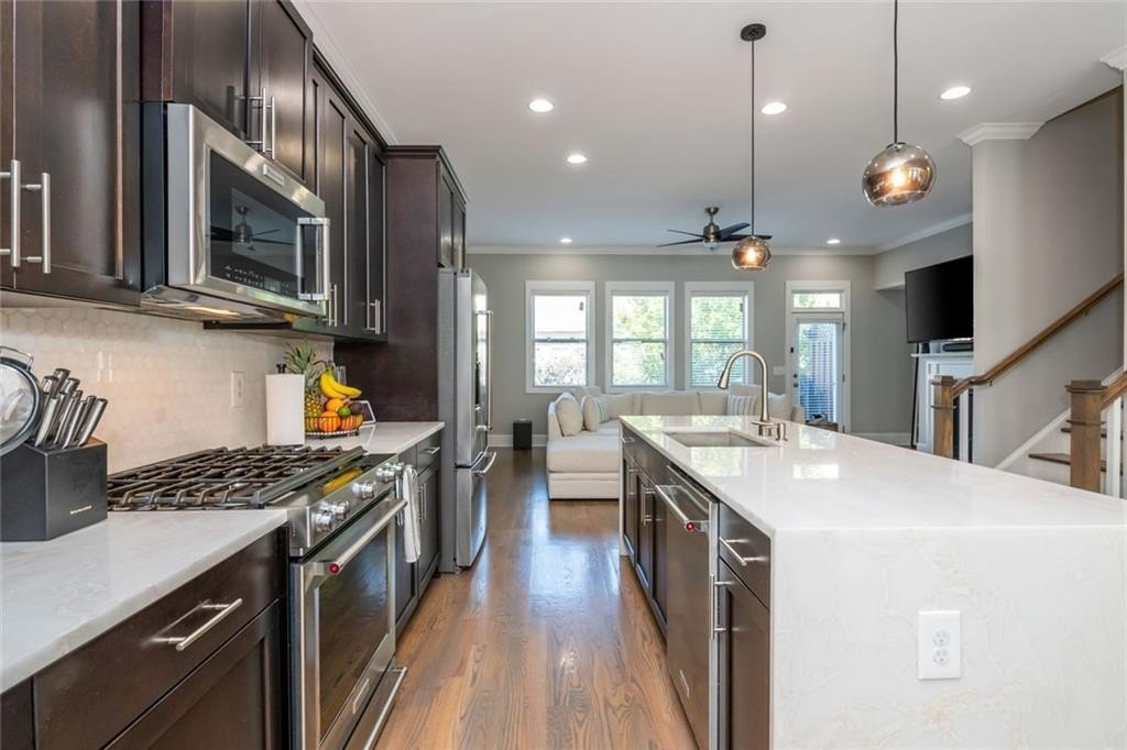 Brock Built craftsmanship meets a best-in-class location. Set in Vinings on the Chattahoochee, this townhome puts Westside Provisions, The Battery/Truist Park, Vinings Jubilee, Smyrna Market Village, Buckhead and Midtown within easy reach—two quick turns to I-285/I-75, yet tucked into a quiet, sidewalked, swim/tennis community. Inside, a designer kitchen with waterfall quartz island, hex backsplash, gas range and rich shaker cabinetry anchors an open main level framed by all-hardwood floors. The great room lives large with a modern gas fireplace and a wall of windows that step out to a treetop deck—private, green, and perfect for evenings in.