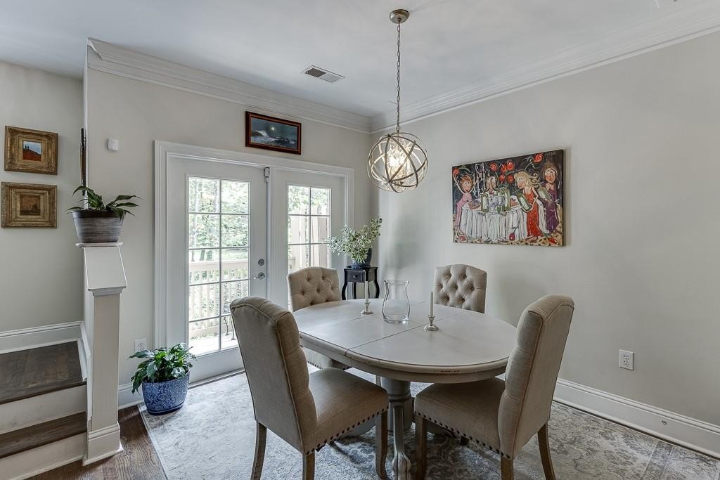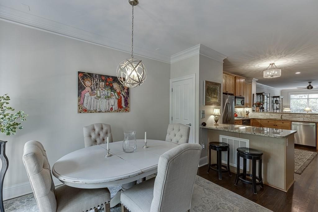 The open concept three level townhome features a large front living room, with the kitchen is located in the middle, and the dining area overlooks the wooded view. The current owner enjoyed time with her family while she was cooking in the kitchen; a group was watching football in the living room, and the kids were at the dining room table playing games. This layout will enable you to spend time with your guests while everyone enjoys different activities. The light-filled living area has hardwood floors, a half bathroom, beautiful designer light fixtures, and deluxe crown molding. Modern shaker style maple cabinets envelope the kitchen. Stainless-steel appliances and plenty of neutral granite counter tops grace this highly coveted U-shaped kitchen layout. One of the favorite things the current owner enjoys is the wooded view from both the dining room as well as the primary suite.