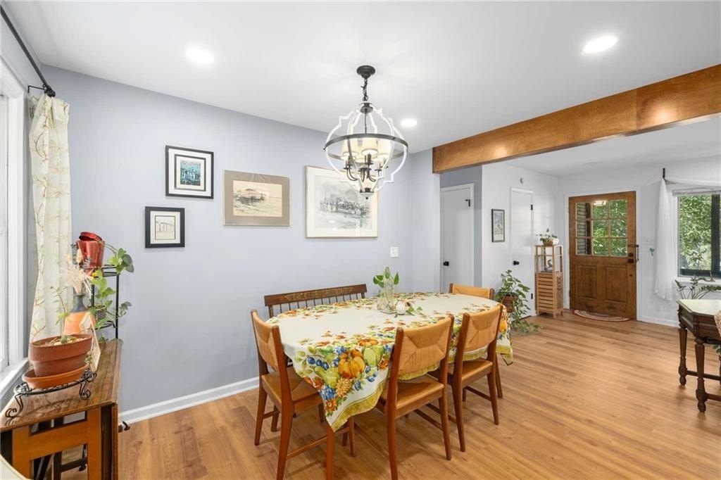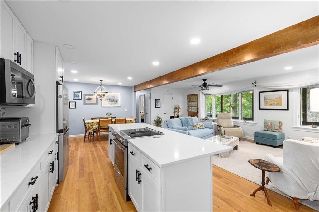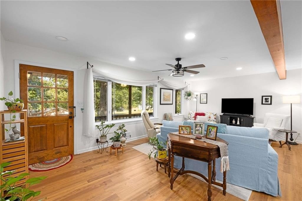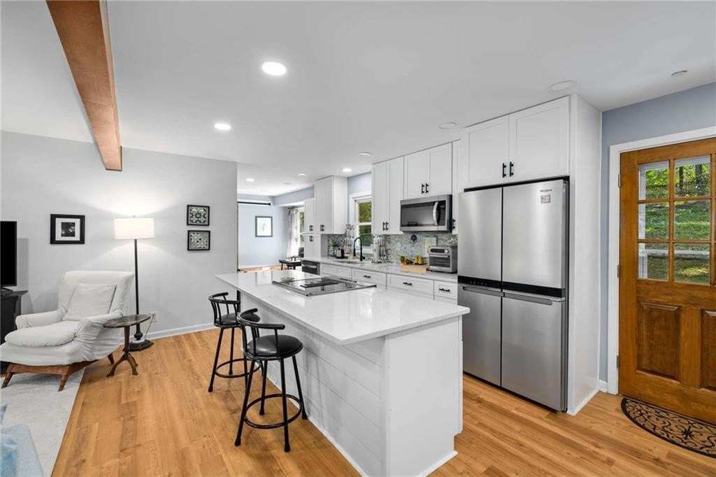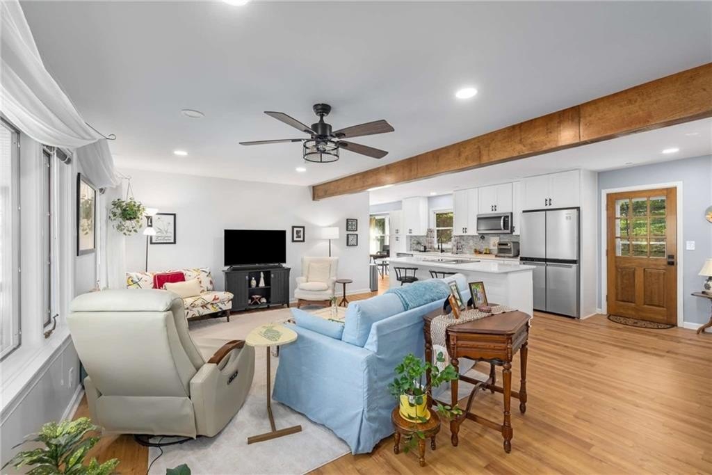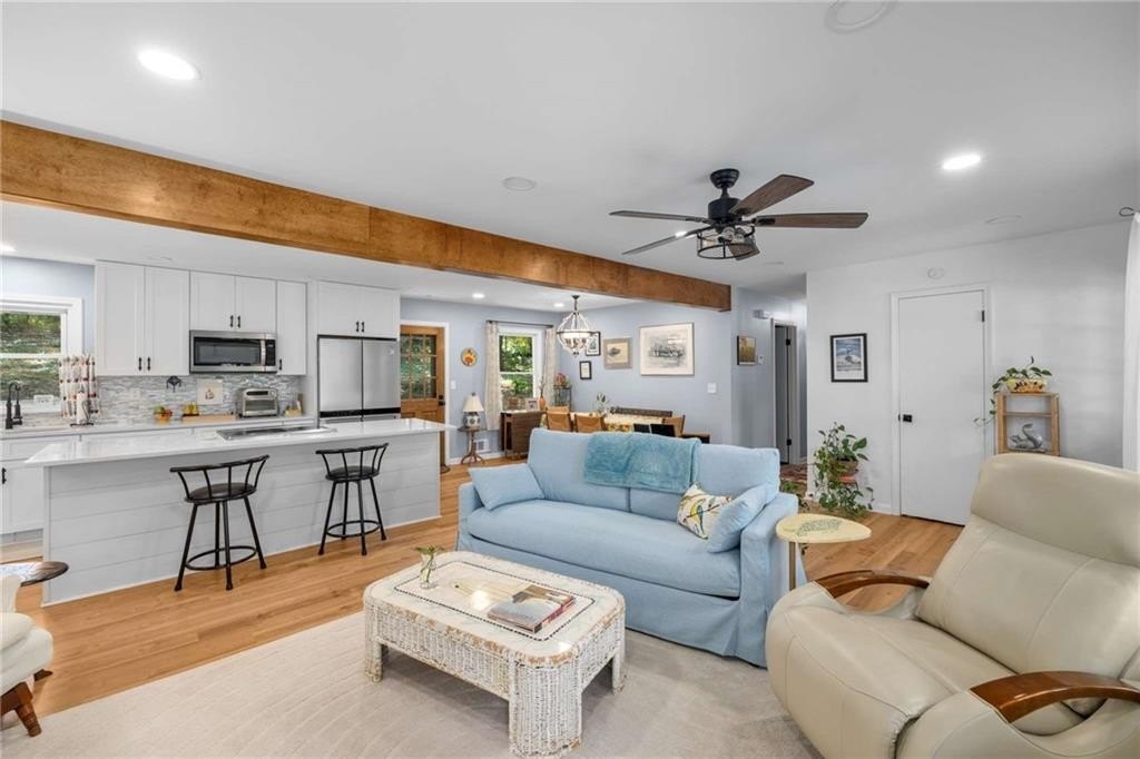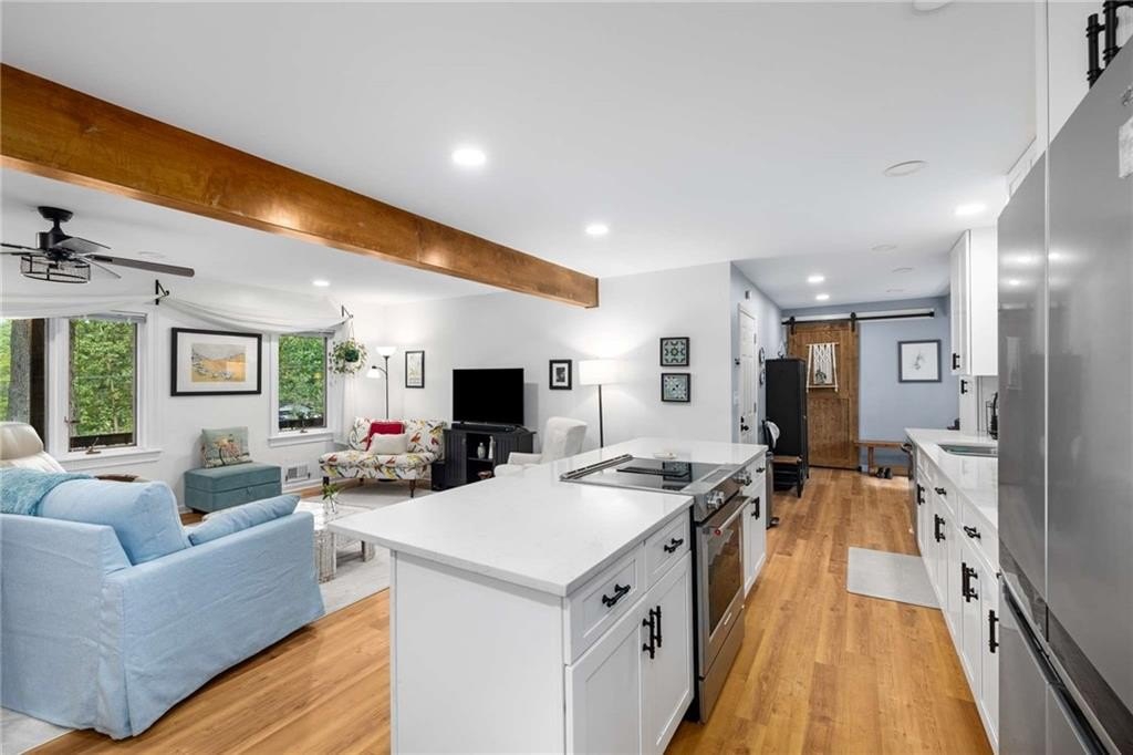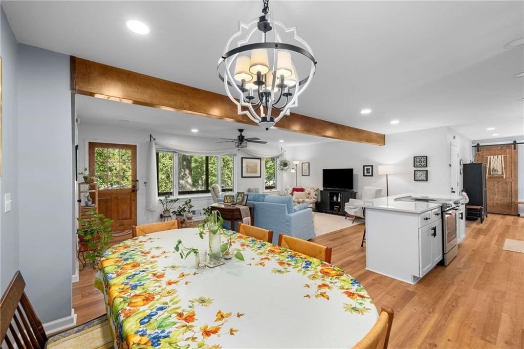 Discover your dream home in this fully renovated mid-century all-brick Ranch, situated less than 10 minutes from the charming historic downtown Lilburn! Step inside to be greeted by an abundance of natural light that fills the open floor plan, featuring elegant light-colored luxury vinyl floors that enhance the seamless flow of one-level living. The spacious great room effortlessly combines a generous living area, dining space, and a modern kitchen, all designed with window-lined walls to let the sunshine pour in. The chef's kitchen boasts sleek cool-tone cabinets, a kitchen island that opens to the living and dining areas with convenient counter seating, a stylish backsplash, and newer appliances, all connecting to a cozy kitchen nook / mudroom and full laundry area.