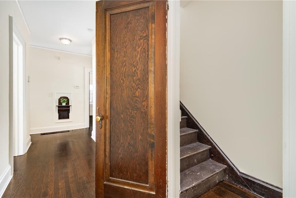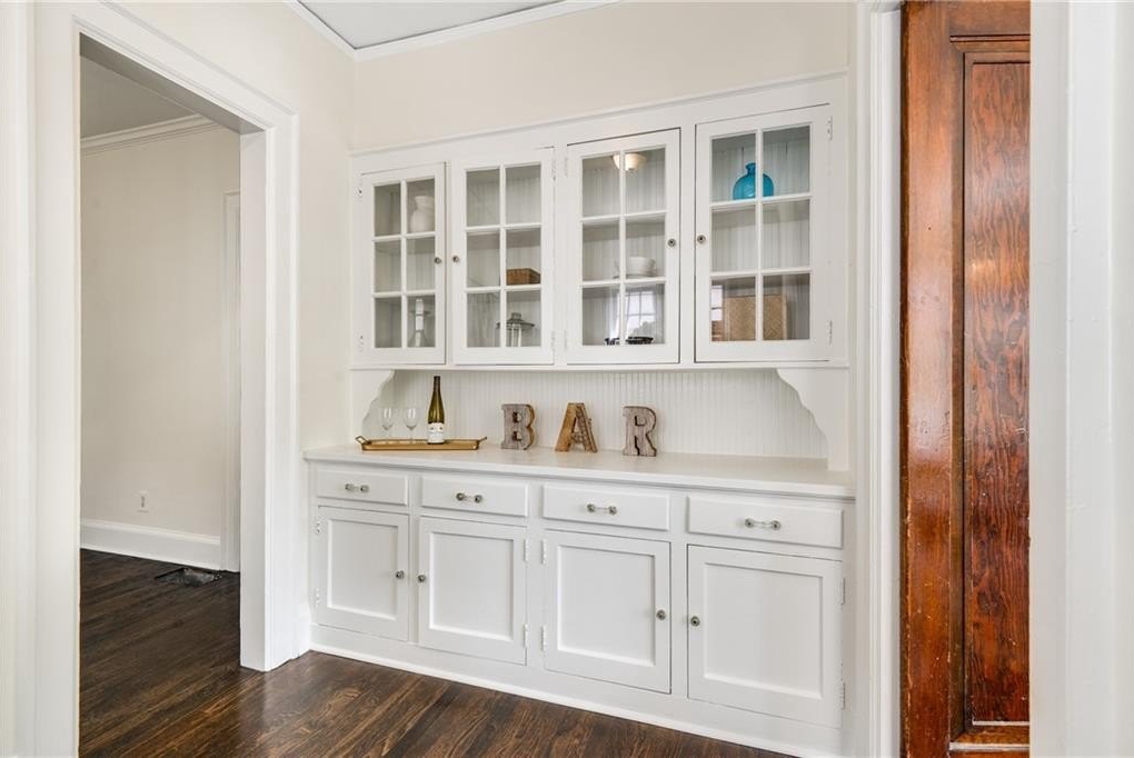 The living room, complete with a cozy fireplace and access to the porch, offers the perfect spot to relax or entertain. Through the formal dining room, walk along the butler’s pantry with original built-ins (coffee station, anyone?) to the kitchen that combines vintage charm with modern convenience, featuring granite countertops, stainless steel appliances, and a nearby laundry area.
