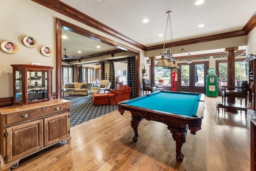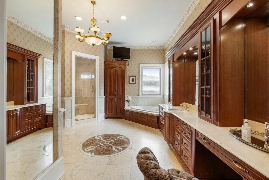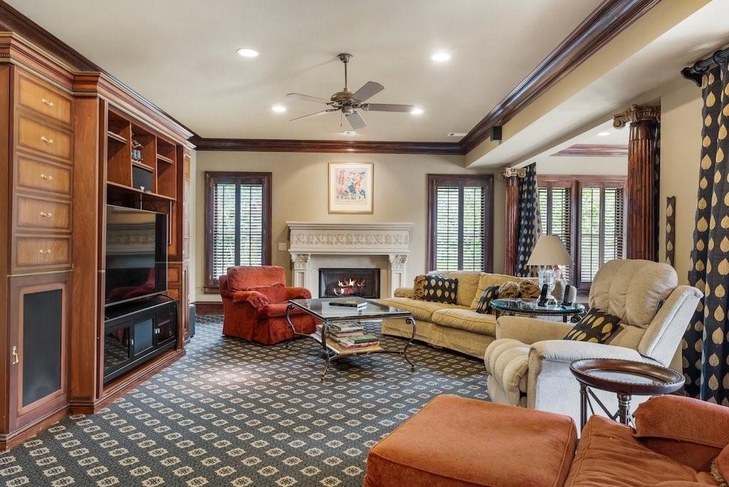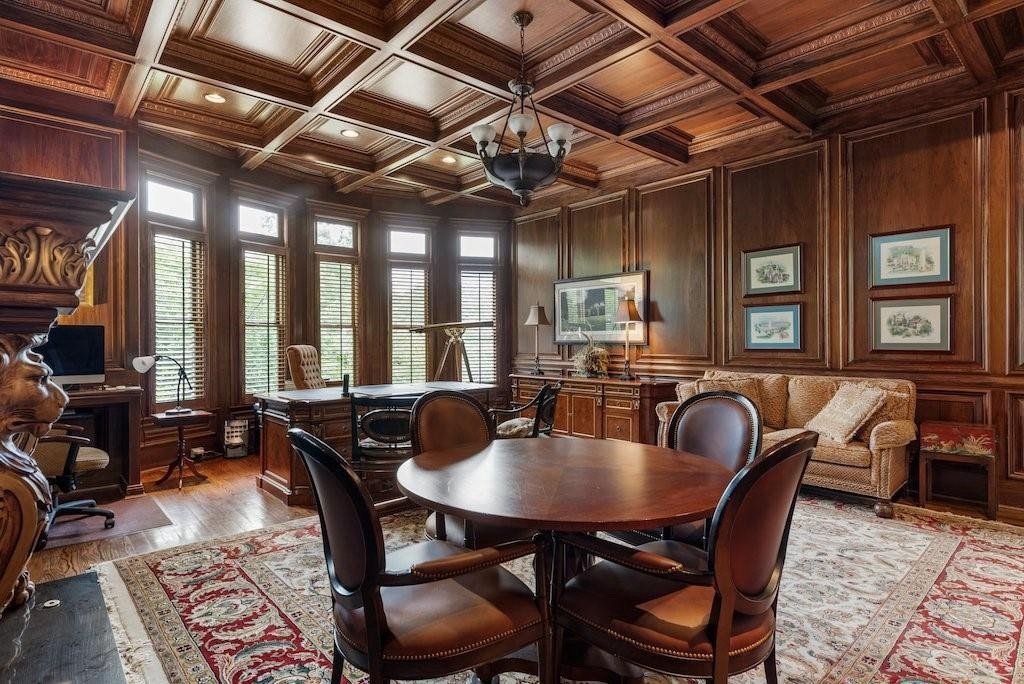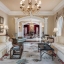 Double doors open to a grand foyer, where a sweeping staircase and statement chandelier create an unforgettable first impression. Flanking the entrance are a fireside sitting room and an elegant formal dining room with its own fireplace.