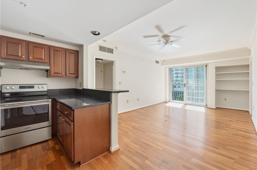 Highly desirable Dorchester floorplan ready for your buyer! Sensational unit with extra den for home office or guest/live in! Brand new dishwasher, disposal, range w/hood, toilet, HVAC!!!! Hardwoods throughout & fabulous view of landscaped pool next door & city's tree canopy! Less than a mile walk to Piedmont Park, this Highrise has 24 hour Concierge, gated assigned parking, gym, bike racks in deck, clubhouse; Walk score of 92, easy access to Marta, shops, restaurants! Great income potential for an Investor!!