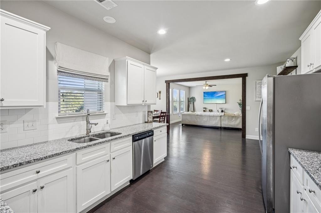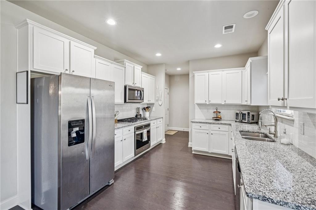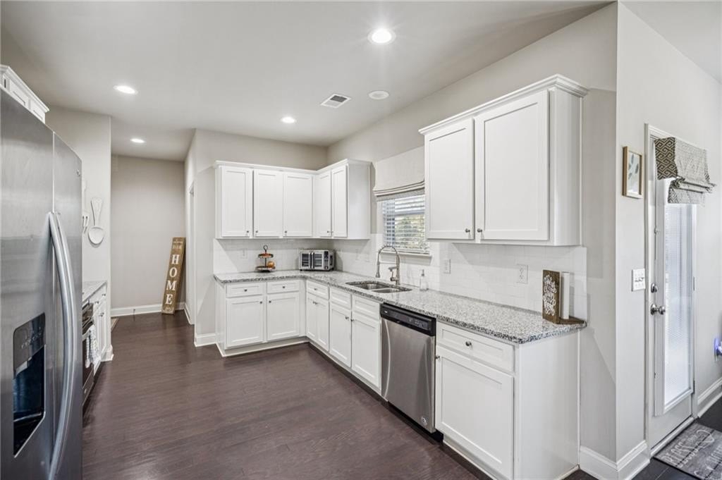 Host with ease. A formal dining room sits off the entry. A flexible formal living room doubles as an office. The family room brings in natural light and connects to an eat-in kitchen with shaker cabinetry, subway tile, granite counters, and stainless appliances. Main-level laundry and a convenient half bath.