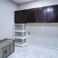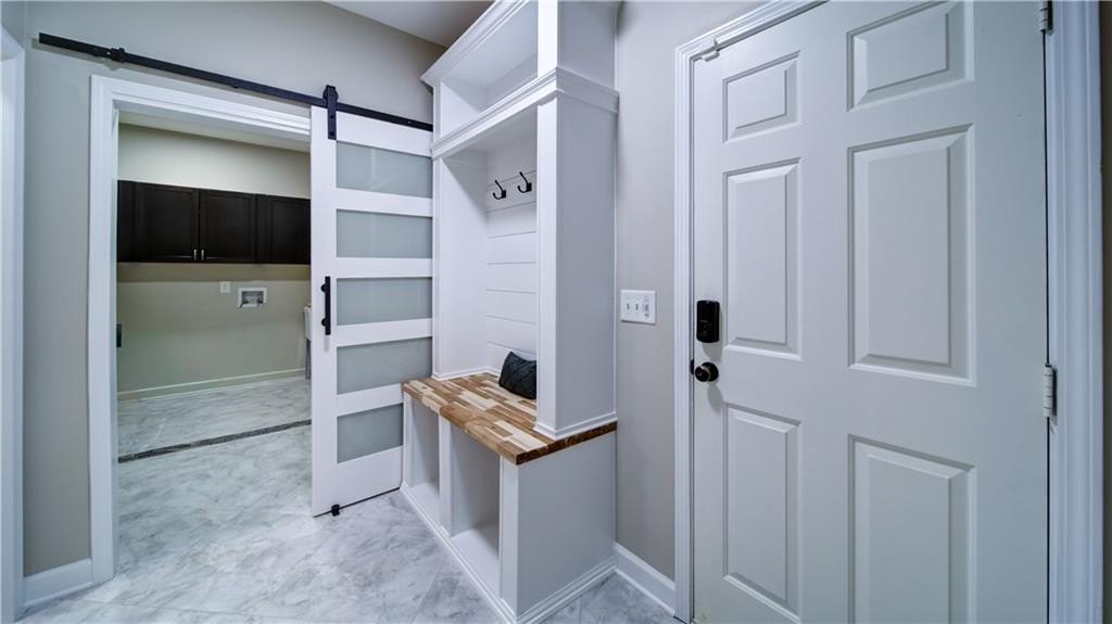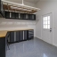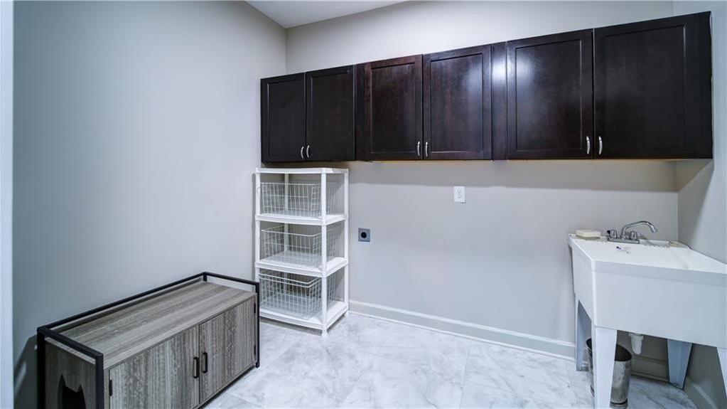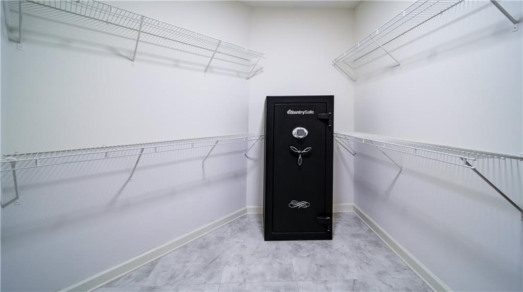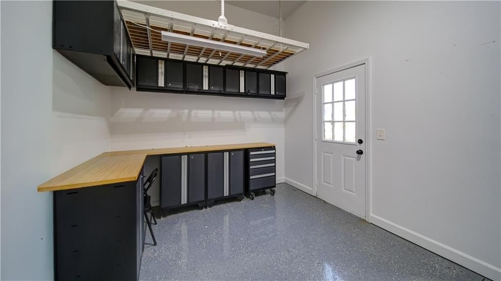Practicality meets design with a large laundry room featuring multiple clothes racks, cabinetry, a utility sink, and two lockable storage cabinets. The epoxy-finished garage offers 12-foot ceilings, overhead racks, under-stair storage, and a professional-grade shop area with metal cabinets.
