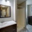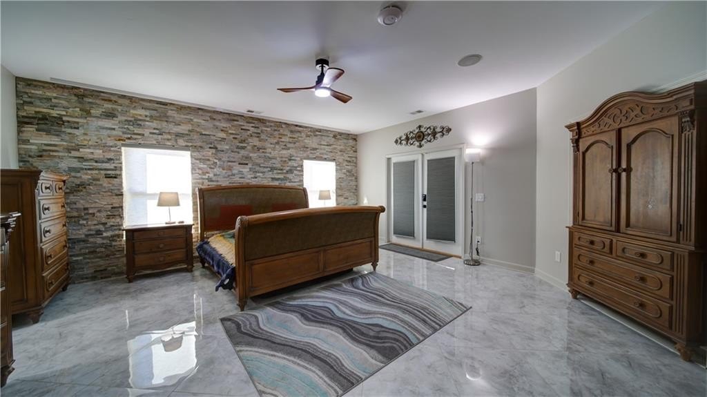 The main-level master suite is a true retreat, featuring double entry doors, a ledger-stone feature wall, heated floors, dual vanities, and separate toilets. Adjoining the suite is a private screened spa room complete with a hot tub and a sitting area.