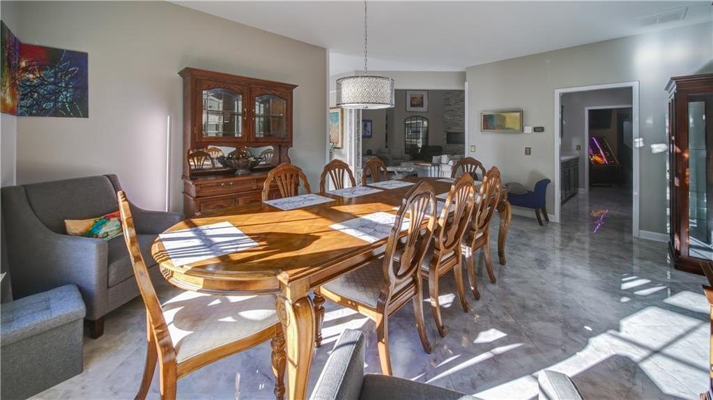 A highlight of the home is the climate-controlled sunroom, designed to feel like a mountain lodge with log siding, a stacked river-rock fireplace, slate floors, and a power skylight. Quad French doors open to a beautifully landscaped backyard with a spacious patio and tranquil water feature, creating the ultimate indoor-outdoor living experience.