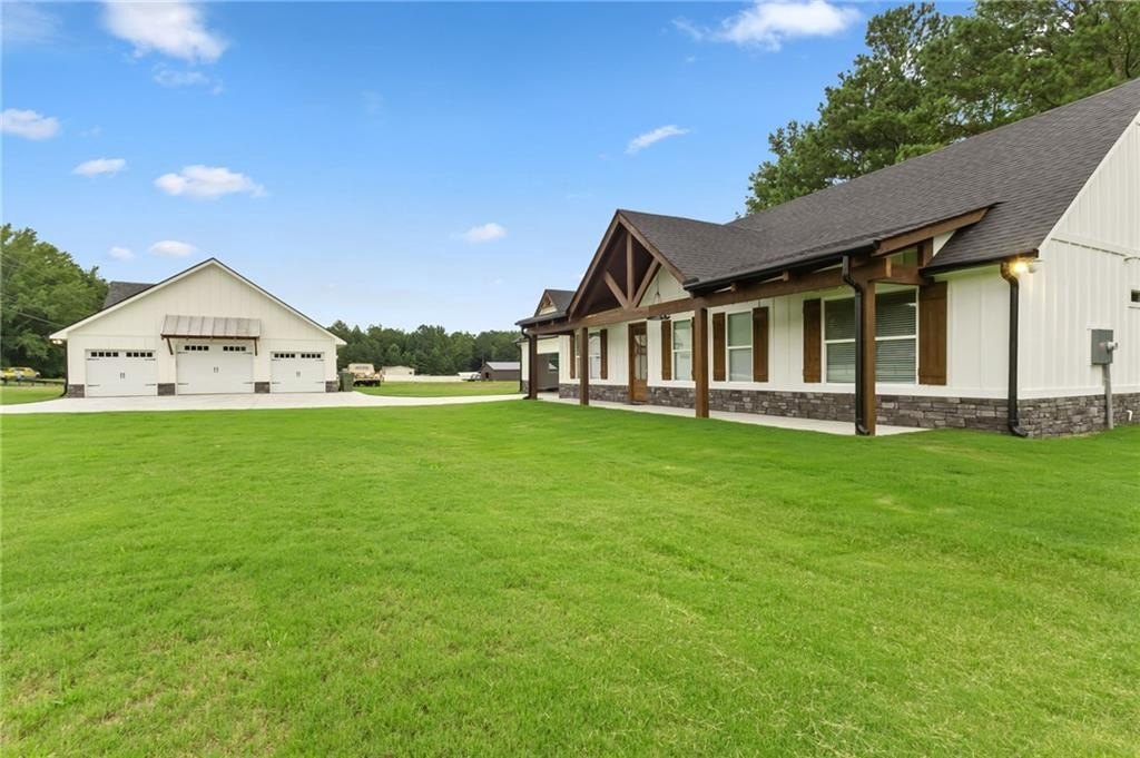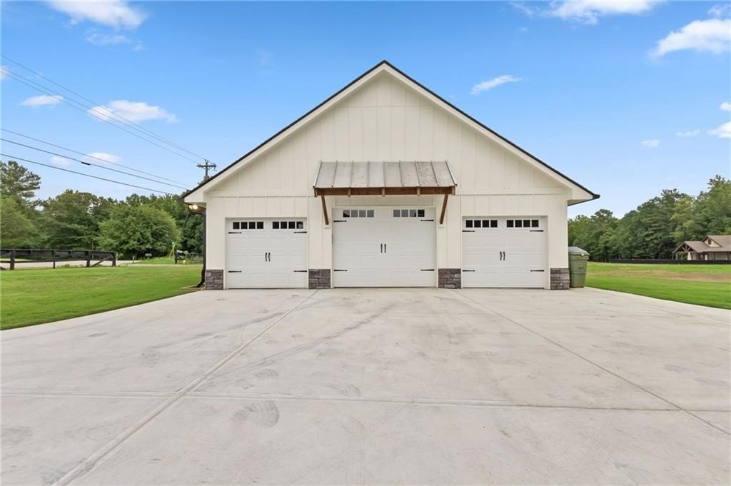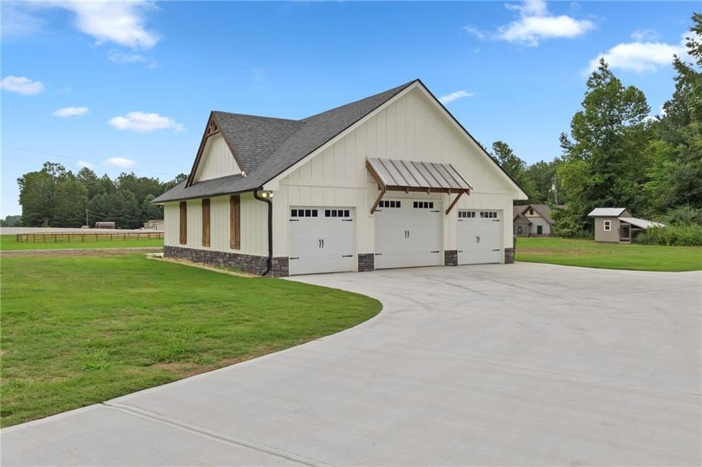 Welcome to a car lover’s dream home — a stunning blend of craftsmanship, functionality, and farmhouse charm! Built in 2024, this nearly new property features a beautifully designed modern farmhouse offering 1,600 square feet of living space paired with an impressive, almost 3,000 square feet of total garage and outdoor living space. Step inside to find soaring ceilings, an open-concept living area, and a designer kitchen complete with a large island, luxurious quartz countertops, and stainless steel appliances. The home’s architectural character shines through its rough-cut timber front and back porches, perfect for enjoying peaceful mornings or evening sunsets.