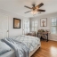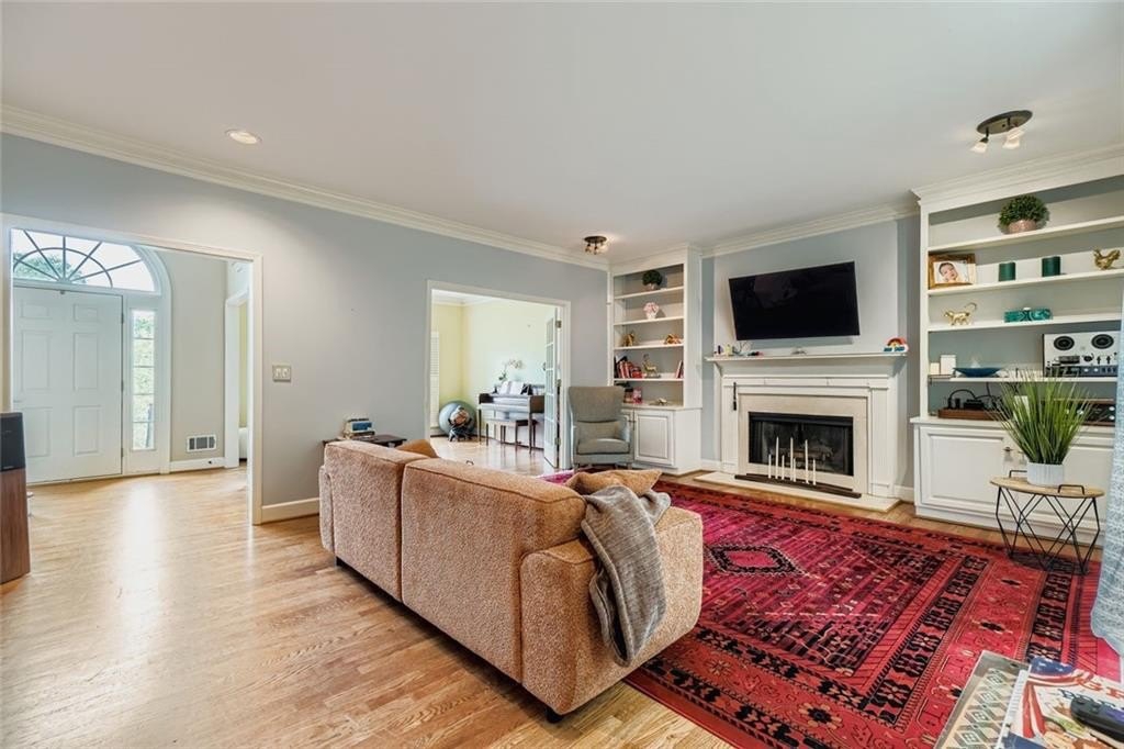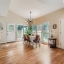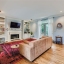 Inside, the layout offers both functionality and character. The kitchen includes an eat-in breakfast area, while separate formal dining and living rooms provide ample space for gatherings. French doors connect the living room to a cozy den featuring built-in bookcases and a wood-burning fireplace. A convenient walk-in laundry room is also located on the main level.