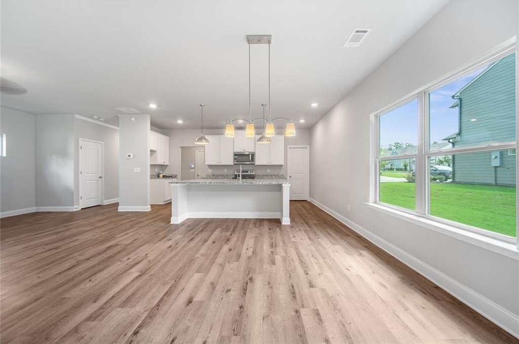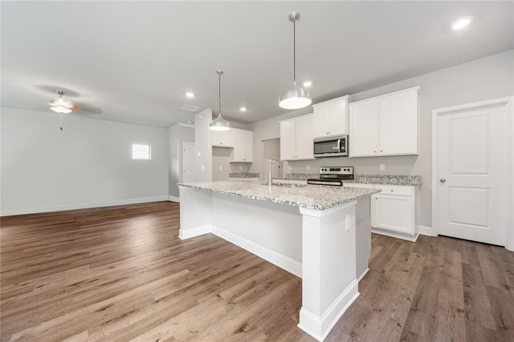 The main level features an open-concept design with a spacious kitchen including white cabinetry, granite countertops, a walk-in pantry, and a large center island. The kitchen flows into the family room, creating a great space for everyday living and entertaining. A set of French doors opens to a private flex room, perfect for a home office, playroom, or den. Garage entry leads directly into the kitchen for added daily convenience.