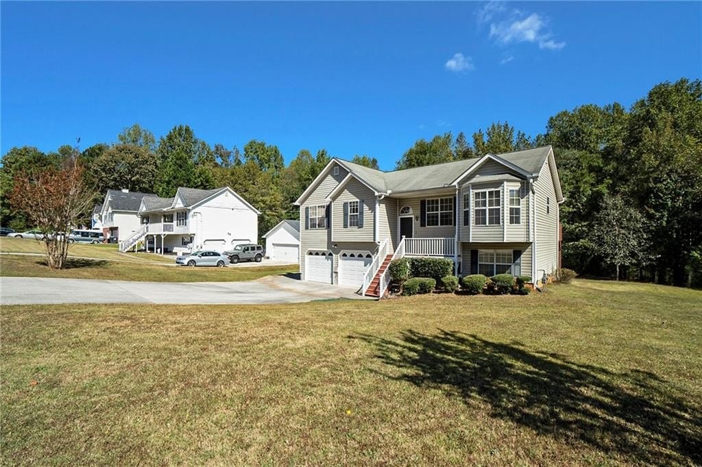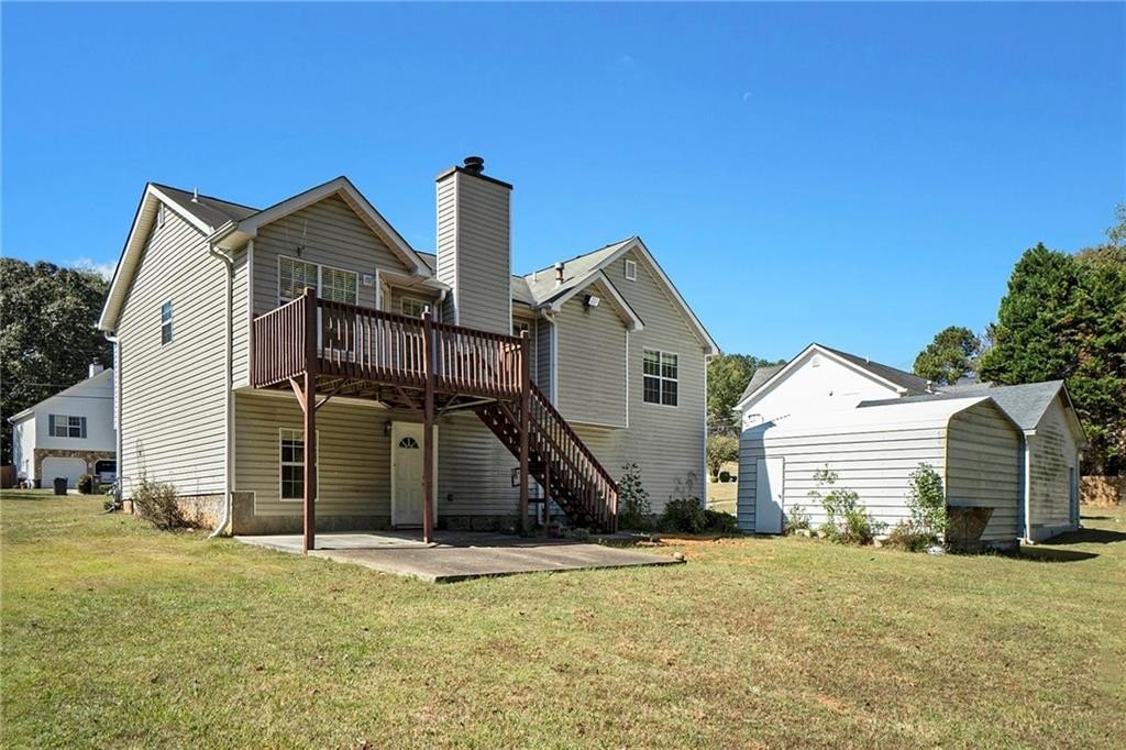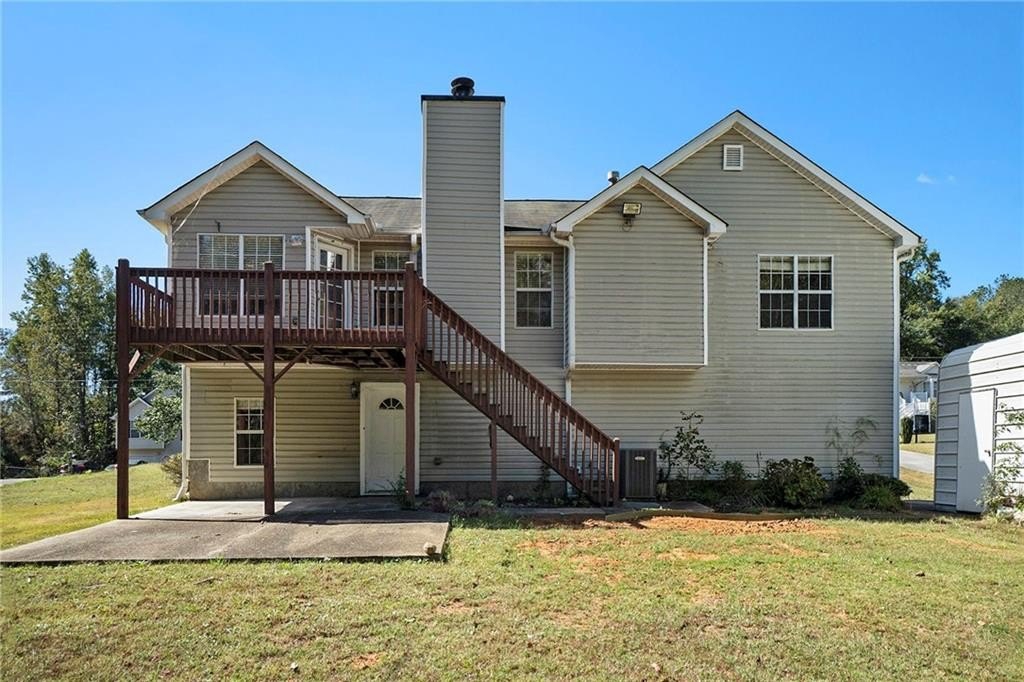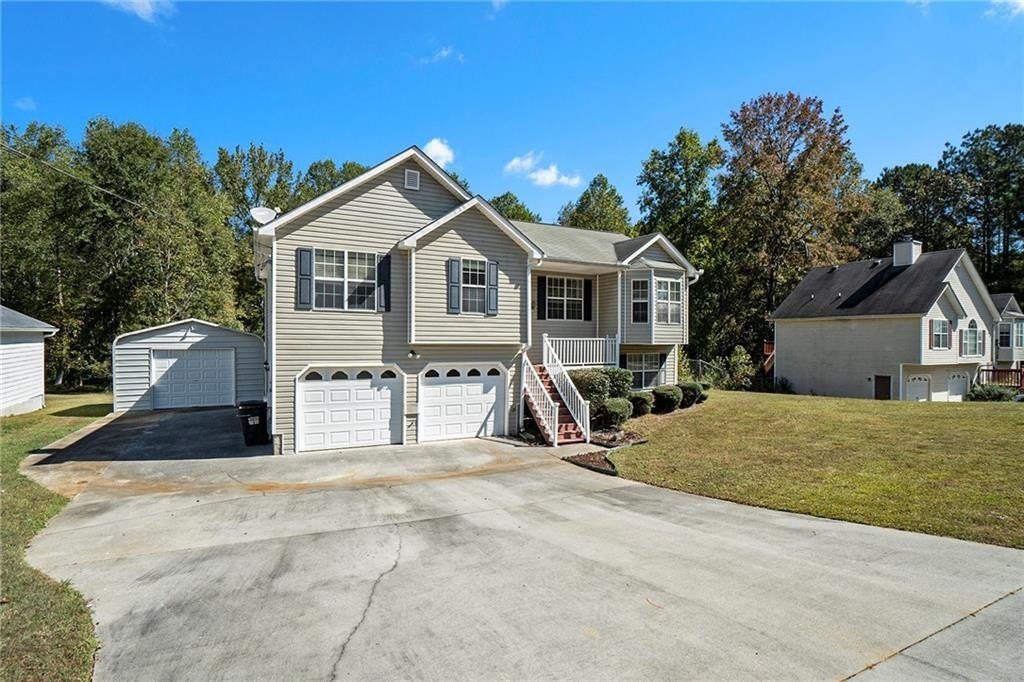 Welcome to this spacious split-level home featuring a vaulted family room with a cozy fireplace and a separate dining room perfect for entertaining. The eat-in kitchen offers solid surface countertops, stainless steel appliances, a pantry, and ample cabinet space. The primary suite boasts a tray ceiling, walk-in closet, and ensuite bathroom with dual vanities. Two additional bedrooms complete the main level. The lower level includes a full bath, a spacious bonus room, and a convenient mini bar—ideal for guests or recreation. Enjoy outdoor living with both a deck and patio overlooking the backyard. Additional highlights include a two-car garage and a storage building for extra space.