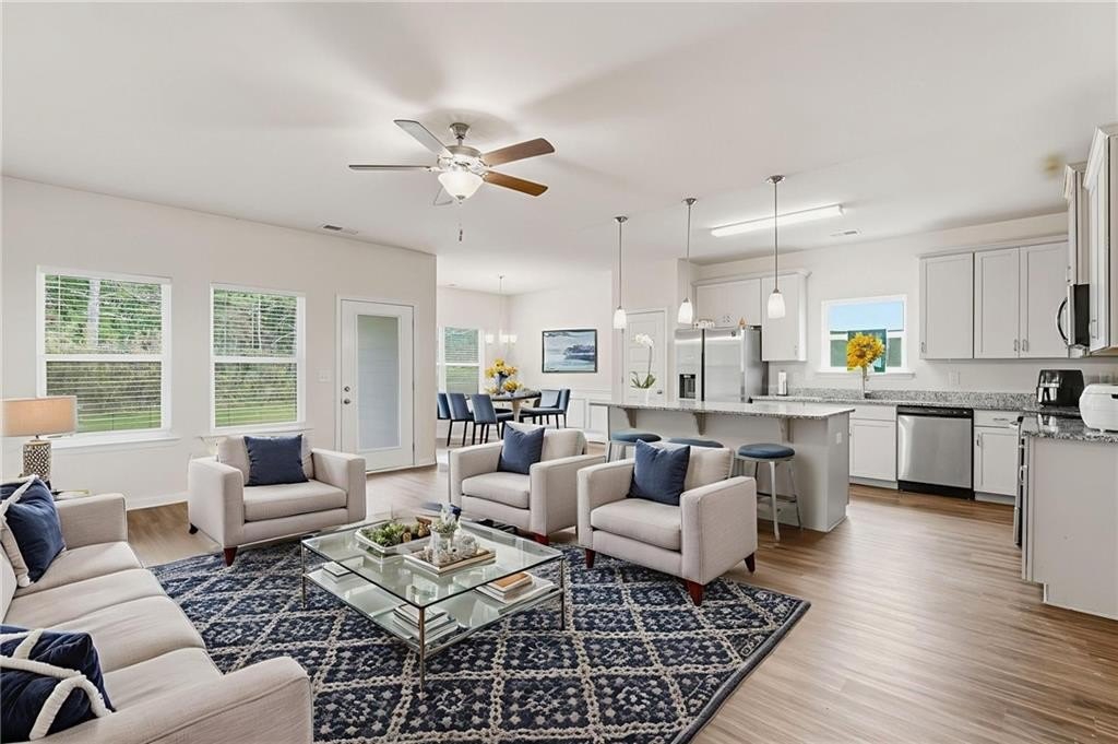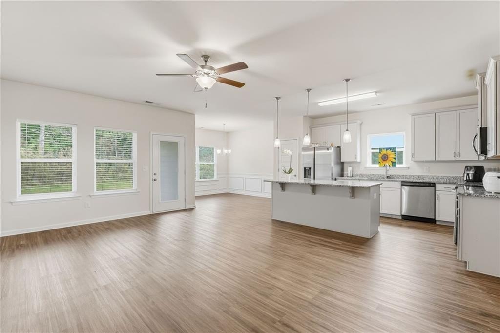 ntertaining. The welcoming foyer, accented with elegant wainscoting and beautiful wood floors, leads to the heart of the home—a stunning white kitchen featuring a large central island, breakfast bar, stainless steel appliances, and pantry. The adjacent dining room, also detailed with wainscoting and backyard views, makes every meal feel special. Unwind on the covered patio, perfect for morning coffee, quiet evenings, or weekend gatherings. The spacious primary retreat boasts a tray ceiling, en-suite bath, and amazing walk-in closet for ultimate comfort. Two additional bedrooms share the main level, while the bonus room above the garage—complete with a full bath—offers endless versatility as a guest suite, media room, playroom, or home office. You’ll love the abundant natural light, five-panel doors, and the large main-level laundry room that make this home as functional as it is beautiful. Conveniently located to shopping, schools, and Hwy 316. Don’t miss your opportunity to own this rare gem in a community where charm, convenience, and modern living come together seamlessly!