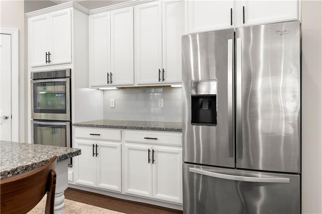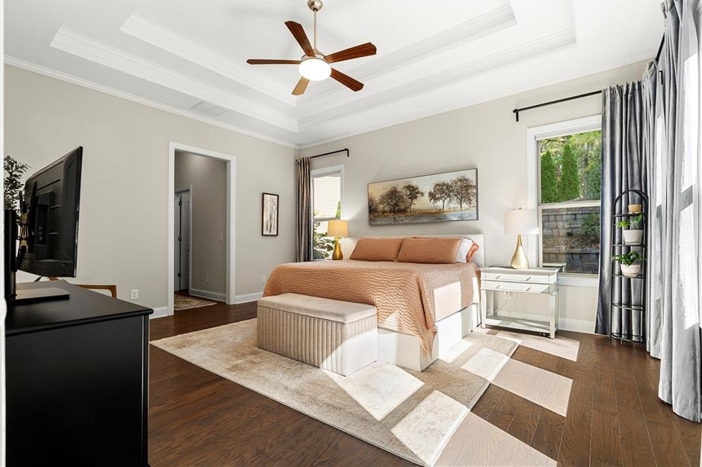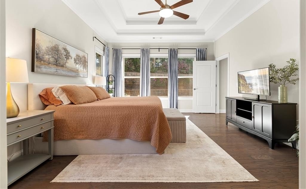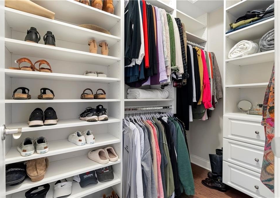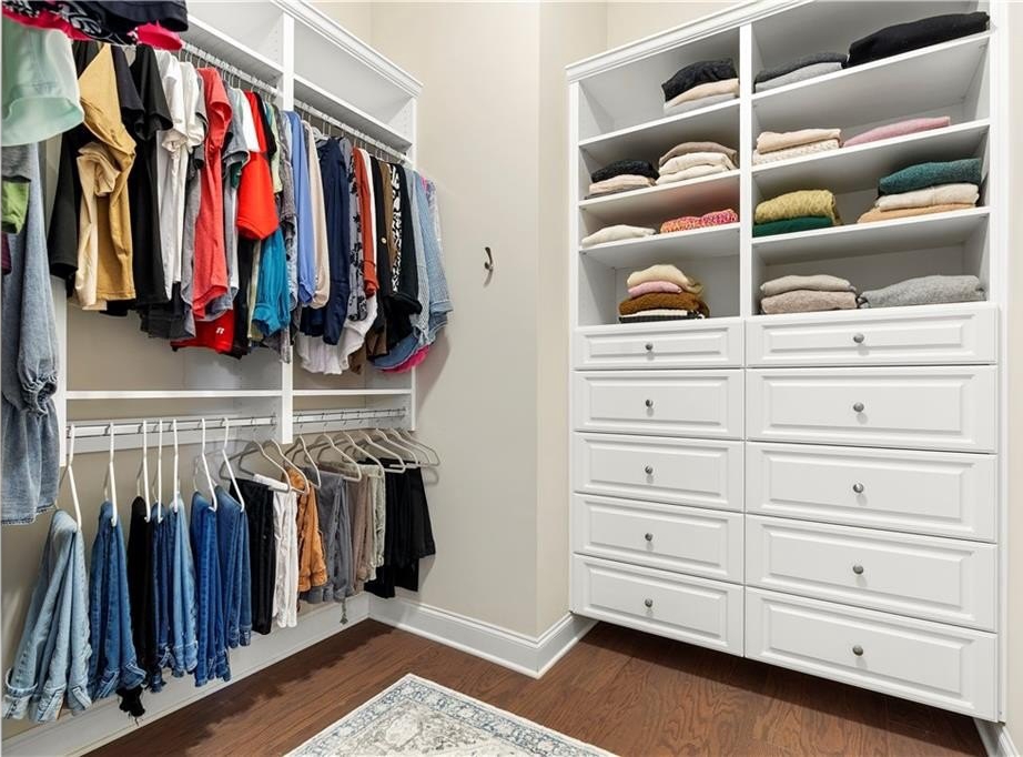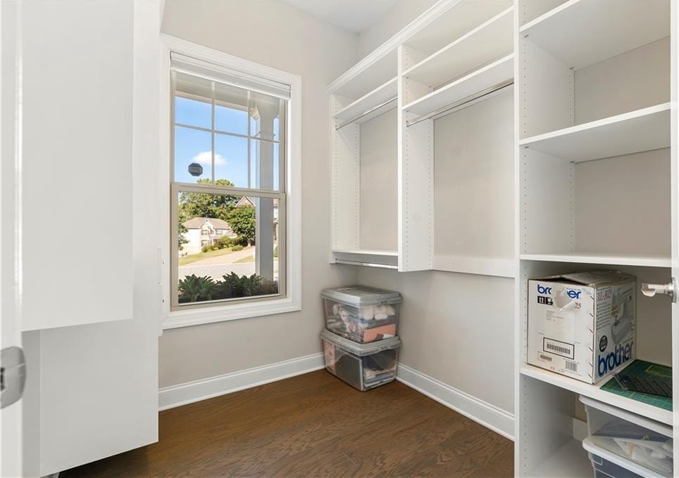 The home features beautiful hardwood floors in every bedroom and closet. The main master suite has a tray ceiling and overlooks the private, wooded backyard. The spa-like bathroom includes a large tile shower with a seat, a soaking tub, and double sinks. There are two big walk-in closets, all with custom Georgia Closet systems—and even the laundry room has built-in storage and a granite countertop! The additional bedrooms also feature custom closet fittings, giving everyone organized storage space.