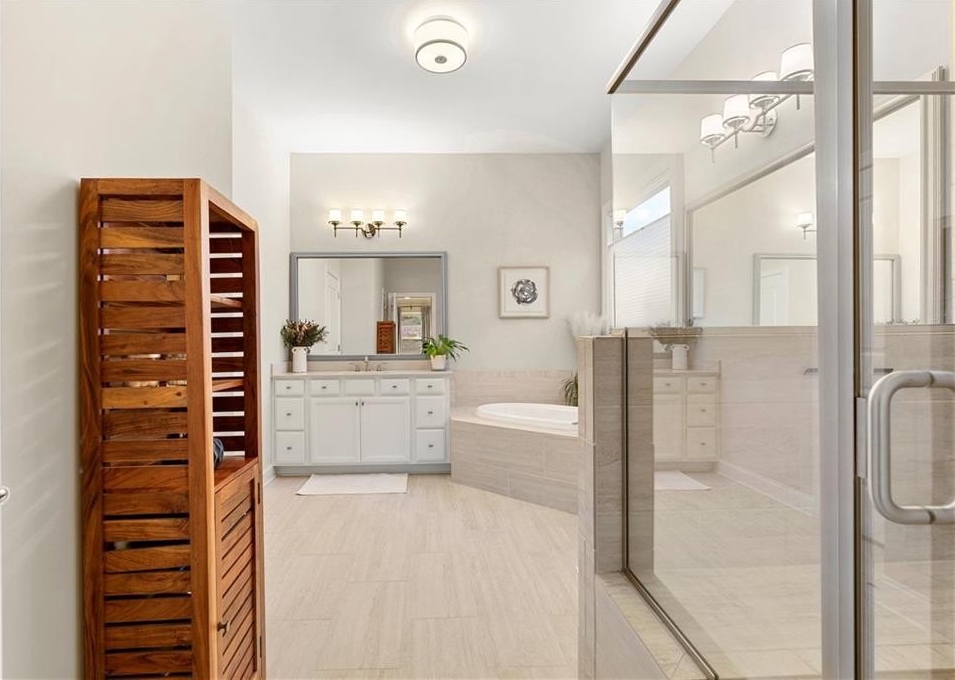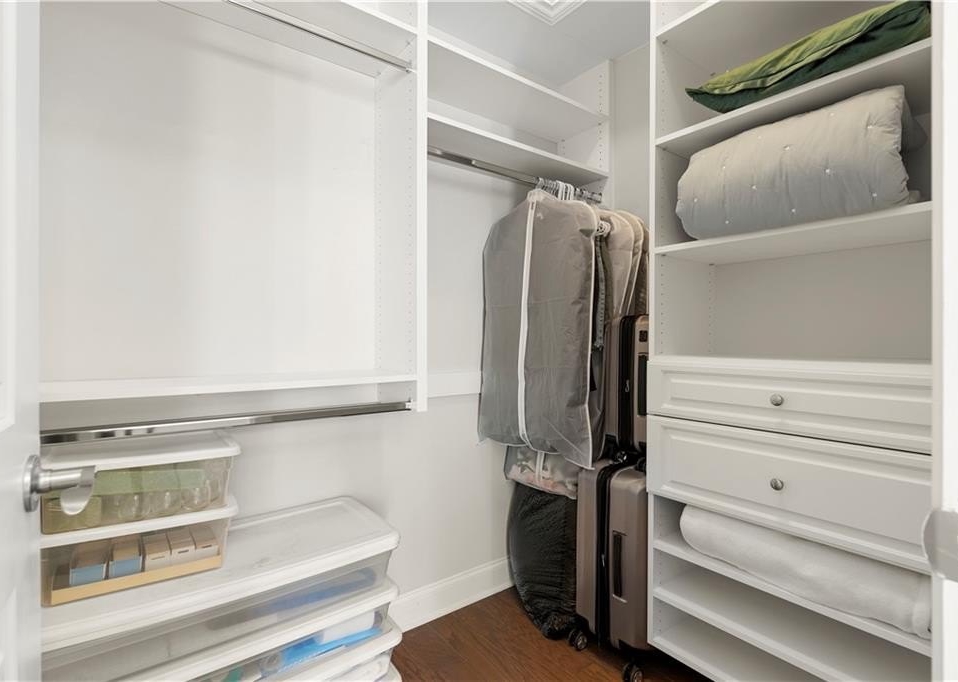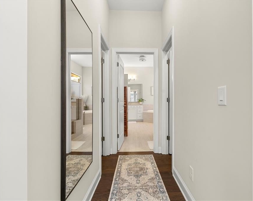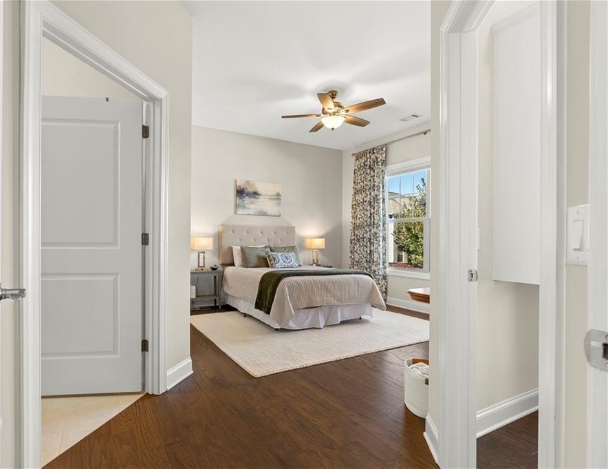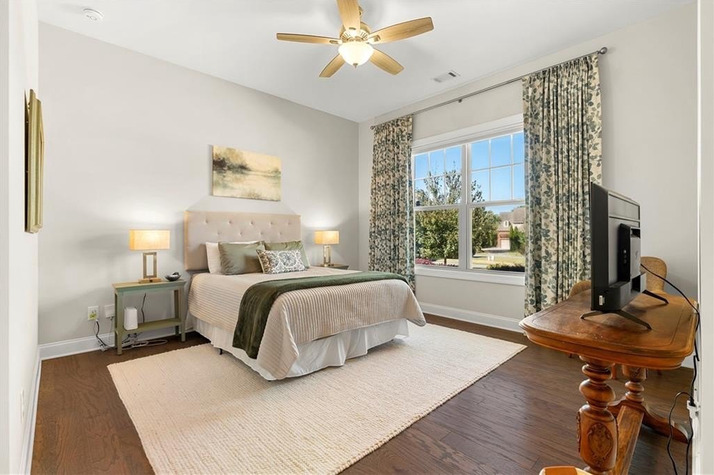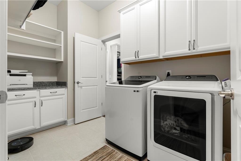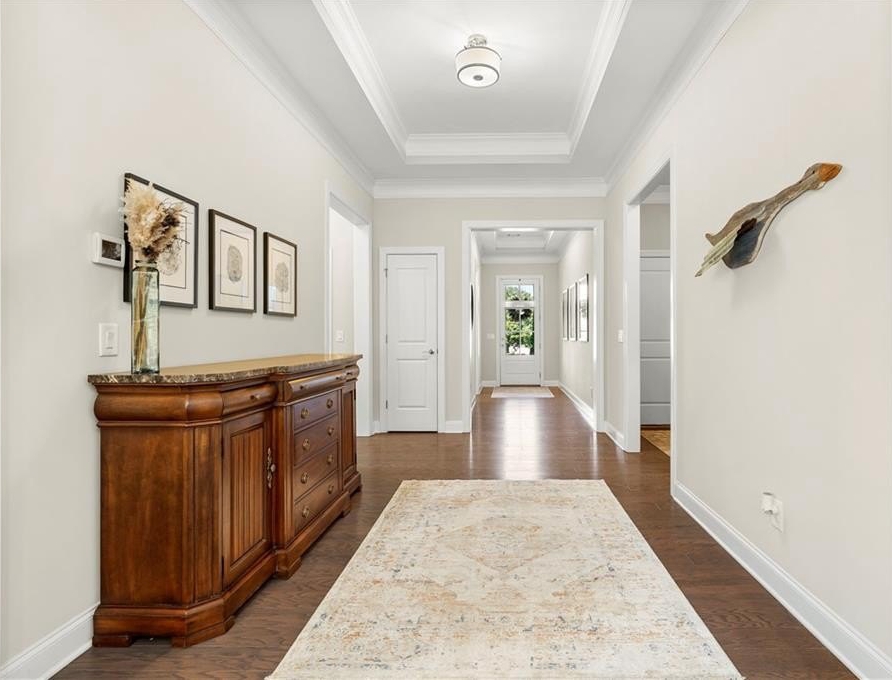 The home features beautiful hardwood floors in every bedroom and closet. The main master suite has a tray ceiling and overlooks the private, wooded backyard. The spa-like bathroom includes a large tile shower with a seat, a soaking tub, and double sinks. There are two big walk-in closets, all with custom Georgia Closet systems—and even the laundry room has built-in storage and a granite countertop! The additional bedrooms also feature custom closet fittings, giving everyone organized storage space.