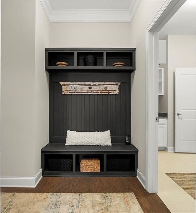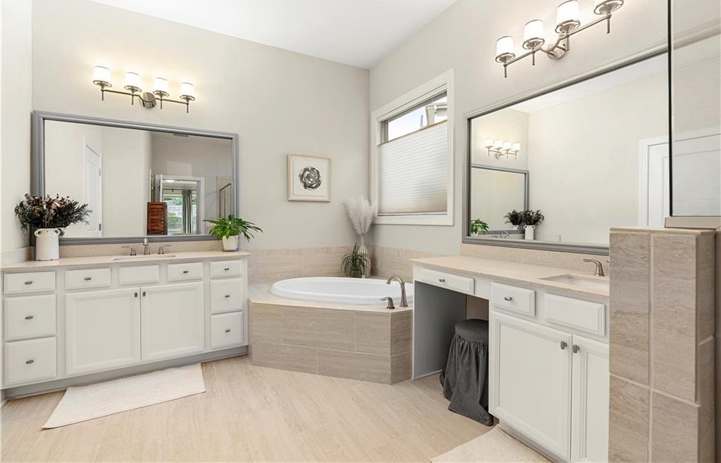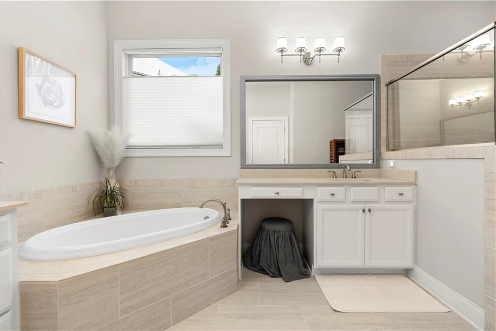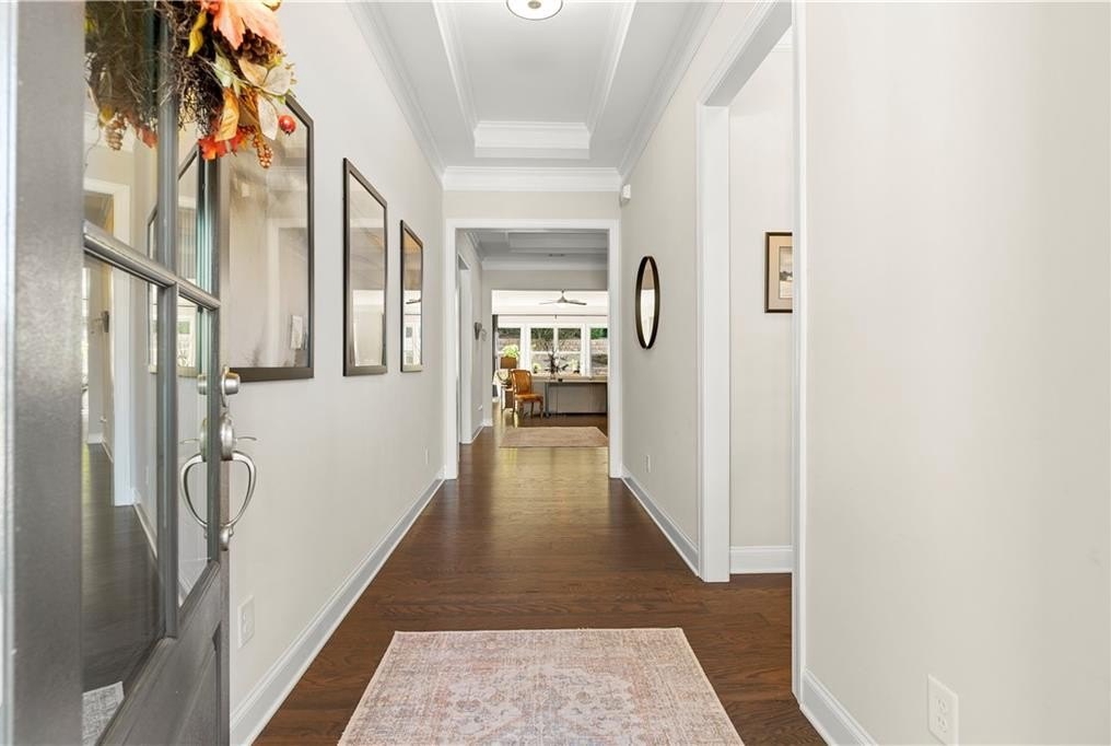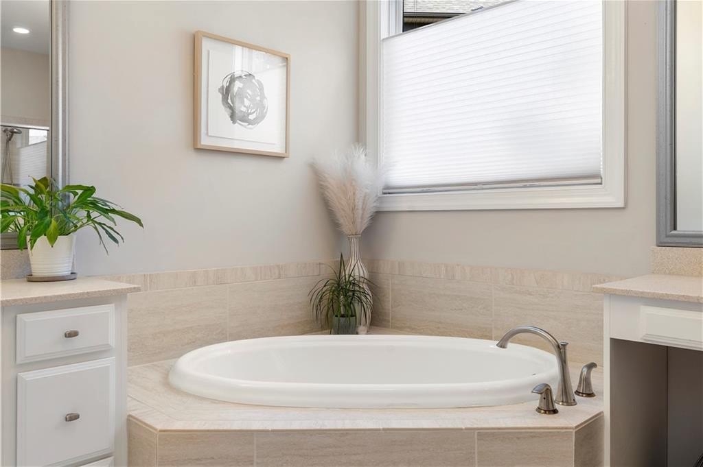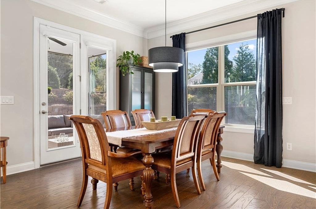The home features beautiful hardwood floors in every bedroom and closet. The main master suite has a tray ceiling and overlooks the private, wooded backyard. The spa-like bathroom includes a large tile shower with a seat, a soaking tub, and double sinks. There are two big walk-in closets, all with custom Georgia Closet systems—and even the laundry room has built-in storage and a granite countertop! The additional bedrooms also feature custom closet fittings, giving everyone organized storage space.
