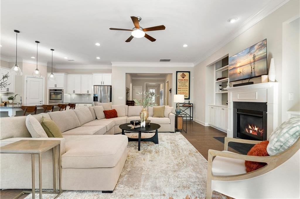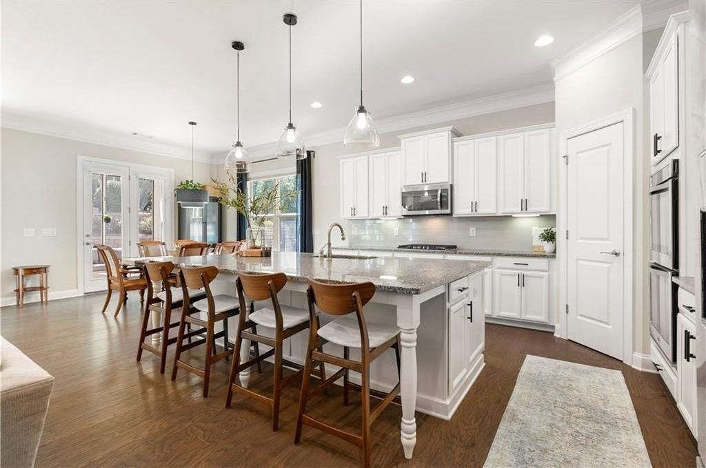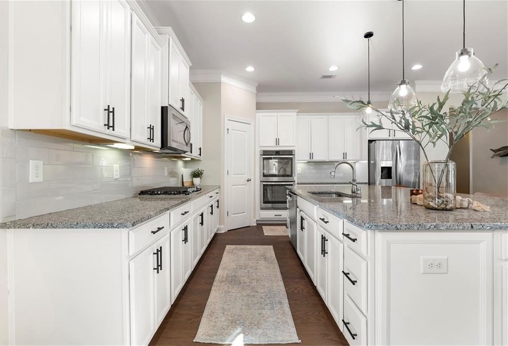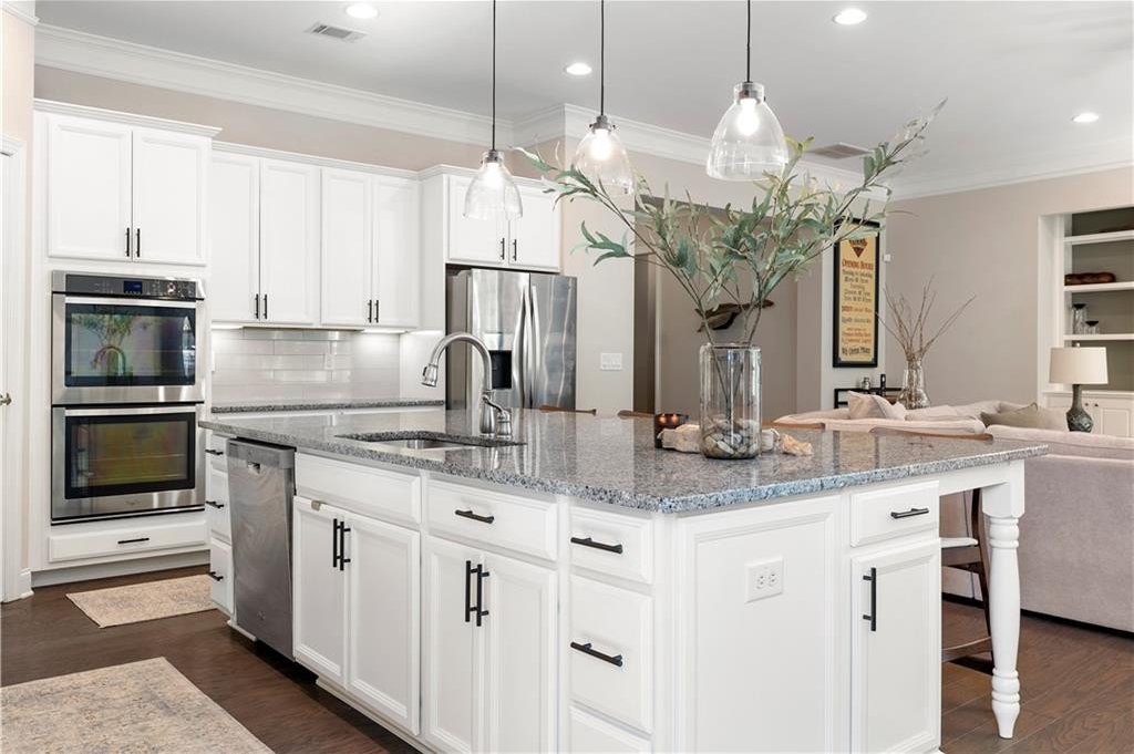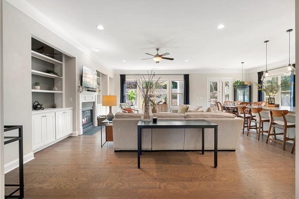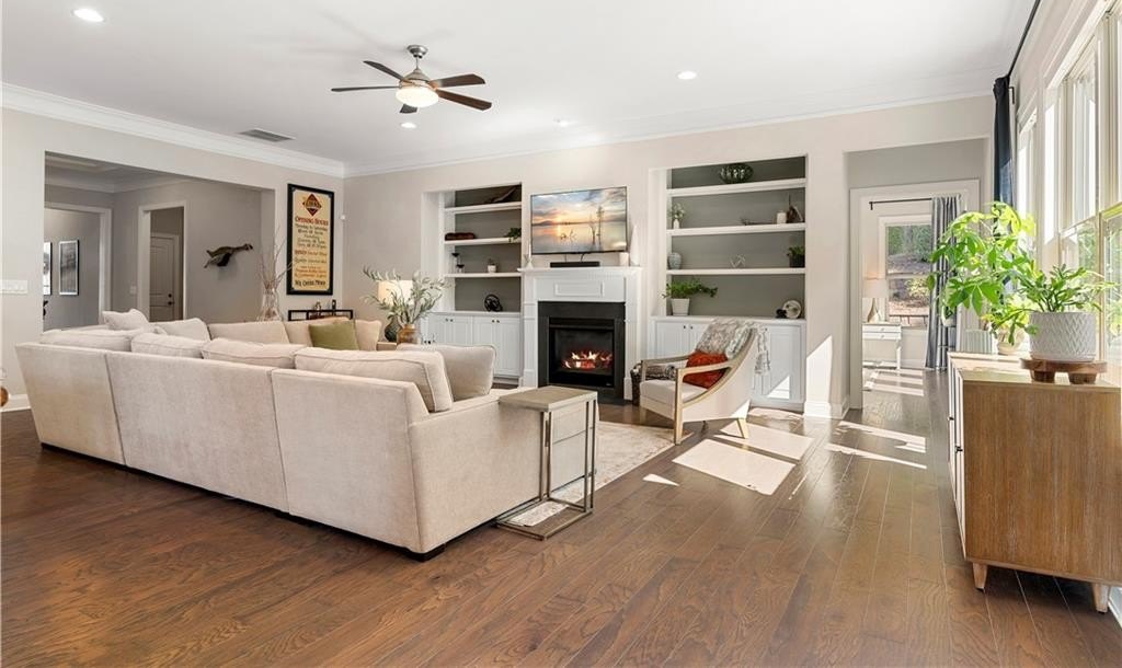 You’ll love the bright, open floor plan! The gourmet kitchen features granite countertops, an oversized island perfect for cooking and gathering, stainless steel appliances, double ovens, a subway tile backsplash, and a walk-in pantry. The kitchen opens to a sunny great room with a wall of windows, a gas fireplace, and built-in bookshelves—perfect for relaxing or entertaining.