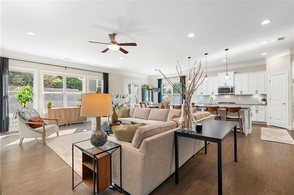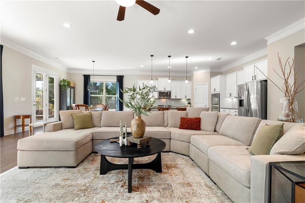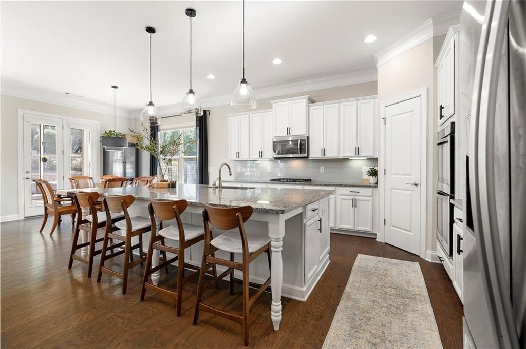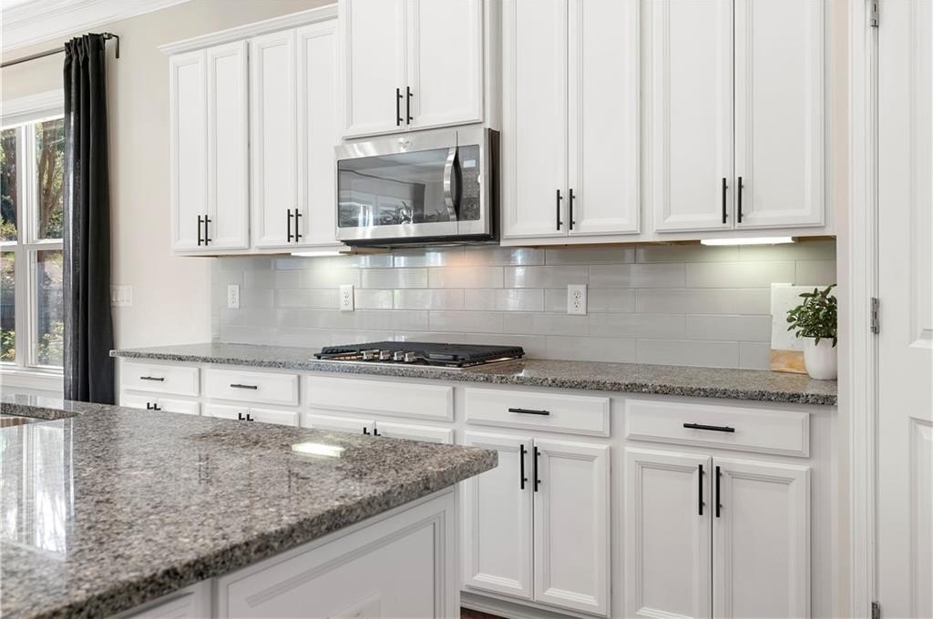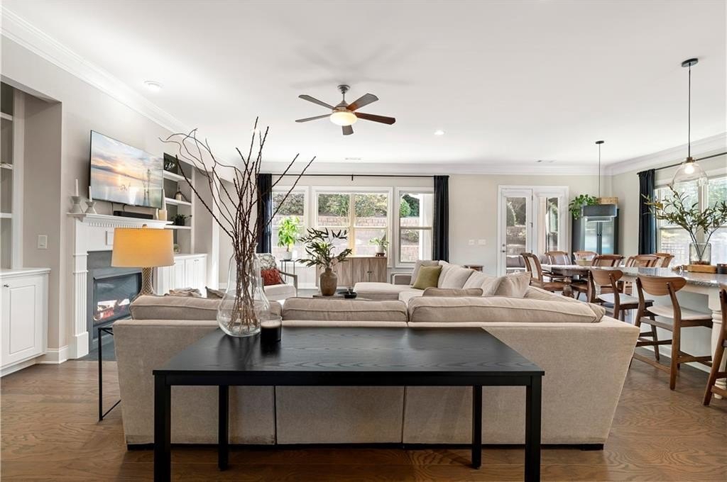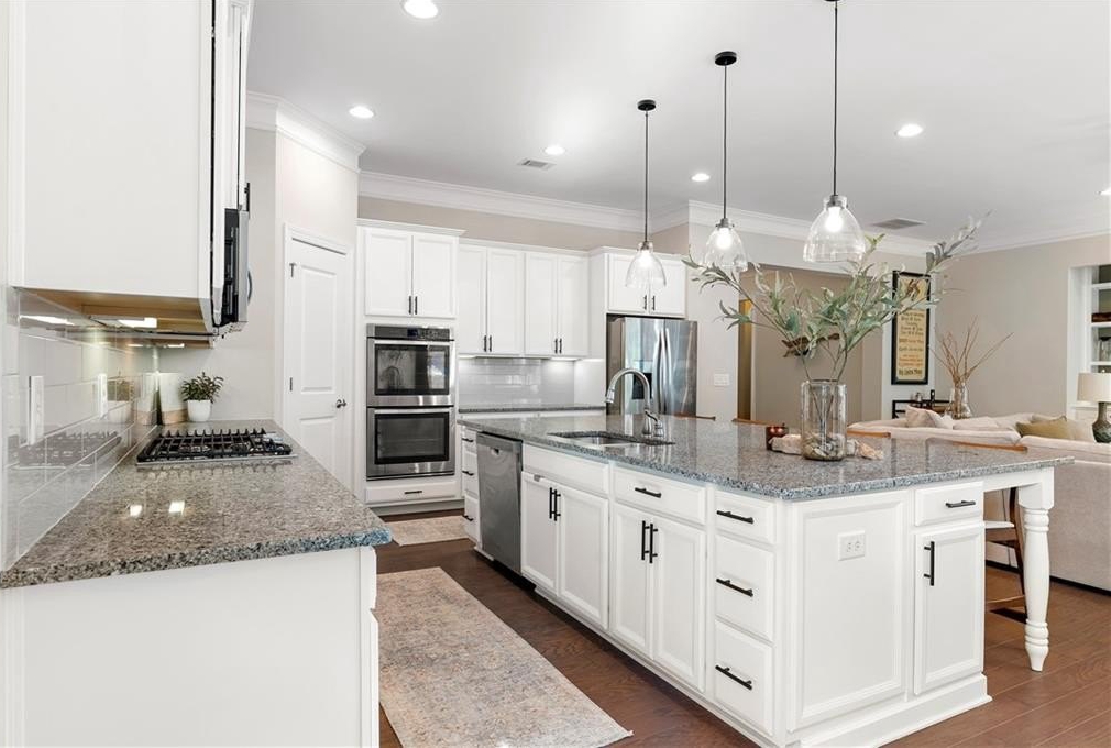 You’ll love the bright, open floor plan! The gourmet kitchen features granite countertops, an oversized island perfect for cooking and gathering, stainless steel appliances, double ovens, a subway tile backsplash, and a walk-in pantry. The kitchen opens to a sunny great room with a wall of windows, a gas fireplace, and built-in bookshelves—perfect for relaxing or entertaining.