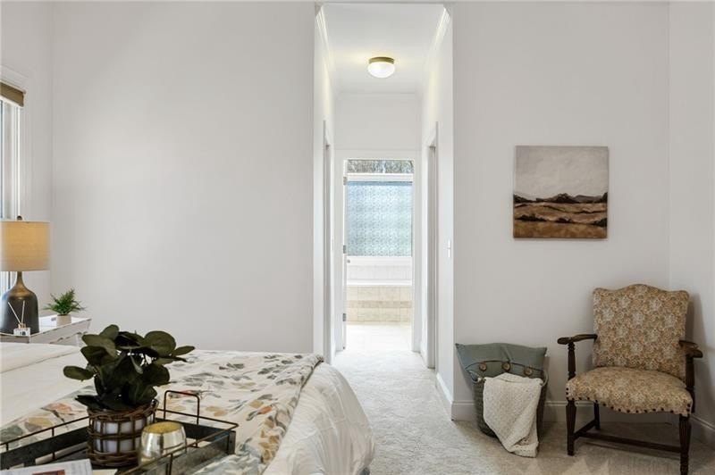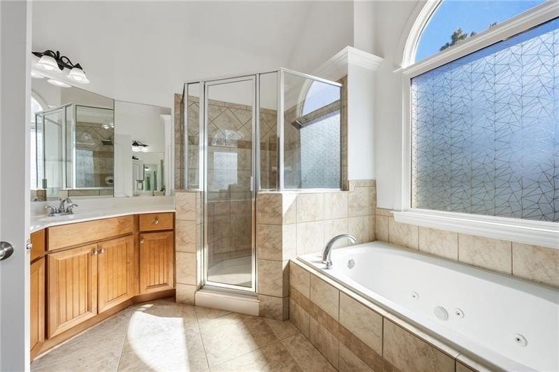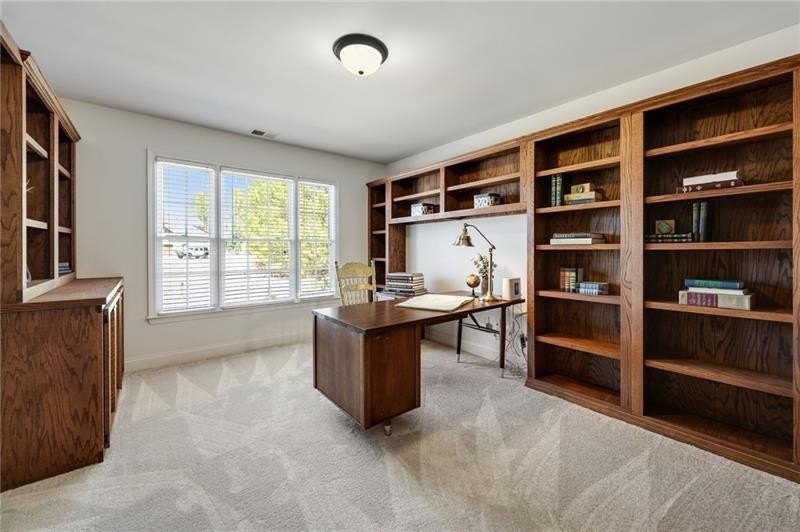 The main-level primary suite is a private retreat, featuring high ceilings, dual walk-in closets, and a spa-like bath with double vanities, a whirlpool tub, and a separate shower. Upstairs, three spacious bedrooms provide flexibility for guests, family, or a dedicated home office — one even includes built-in bookshelves for added charm and functionality.