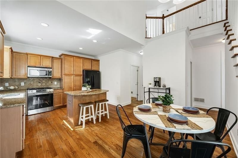 The heart of the home is the soaring two-story family room, where natural light pours in and a gas fireplace anchors the space with warmth and character. Just beyond, the updated kitchen shines with pull-out cabinet shelving, a brand-new range, a newer dishwasher, and an inviting breakfast area overlooking the backyard — perfect for casual meals or morning coffee.
