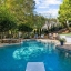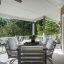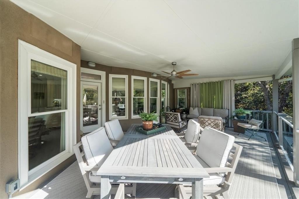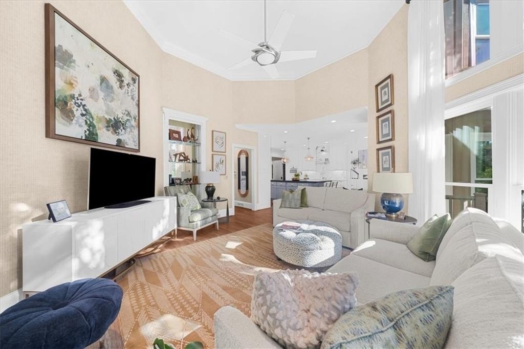 The outdoor living area is equally impressive, with a stunning custom-covered porch — complete with a designer rug and glass rails — overlooking the sparkling saltwater pool and the 7th Fairway of the Laurel Springs Golf Course. Doors from the living room and kitchen open directly to this space, creating an effortless flow for indoor-outdoor entertaining.